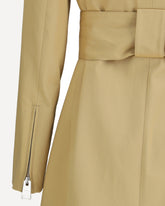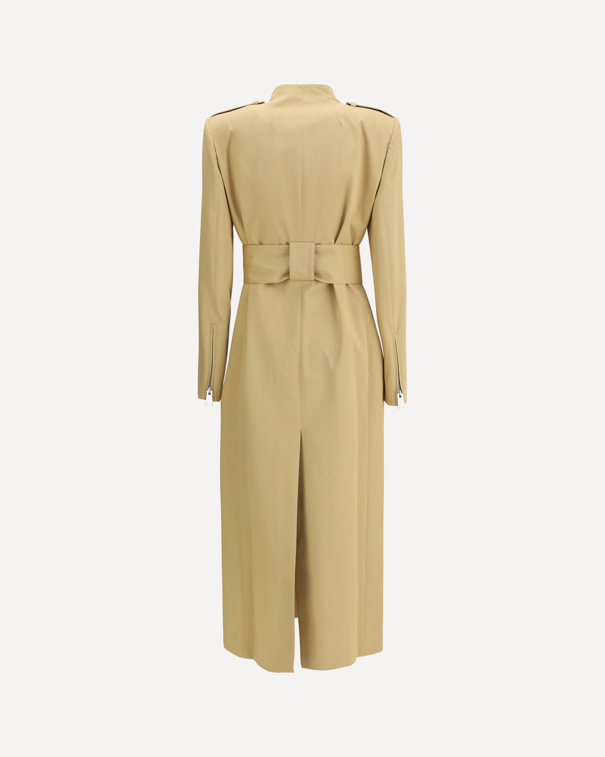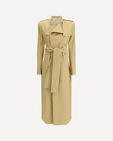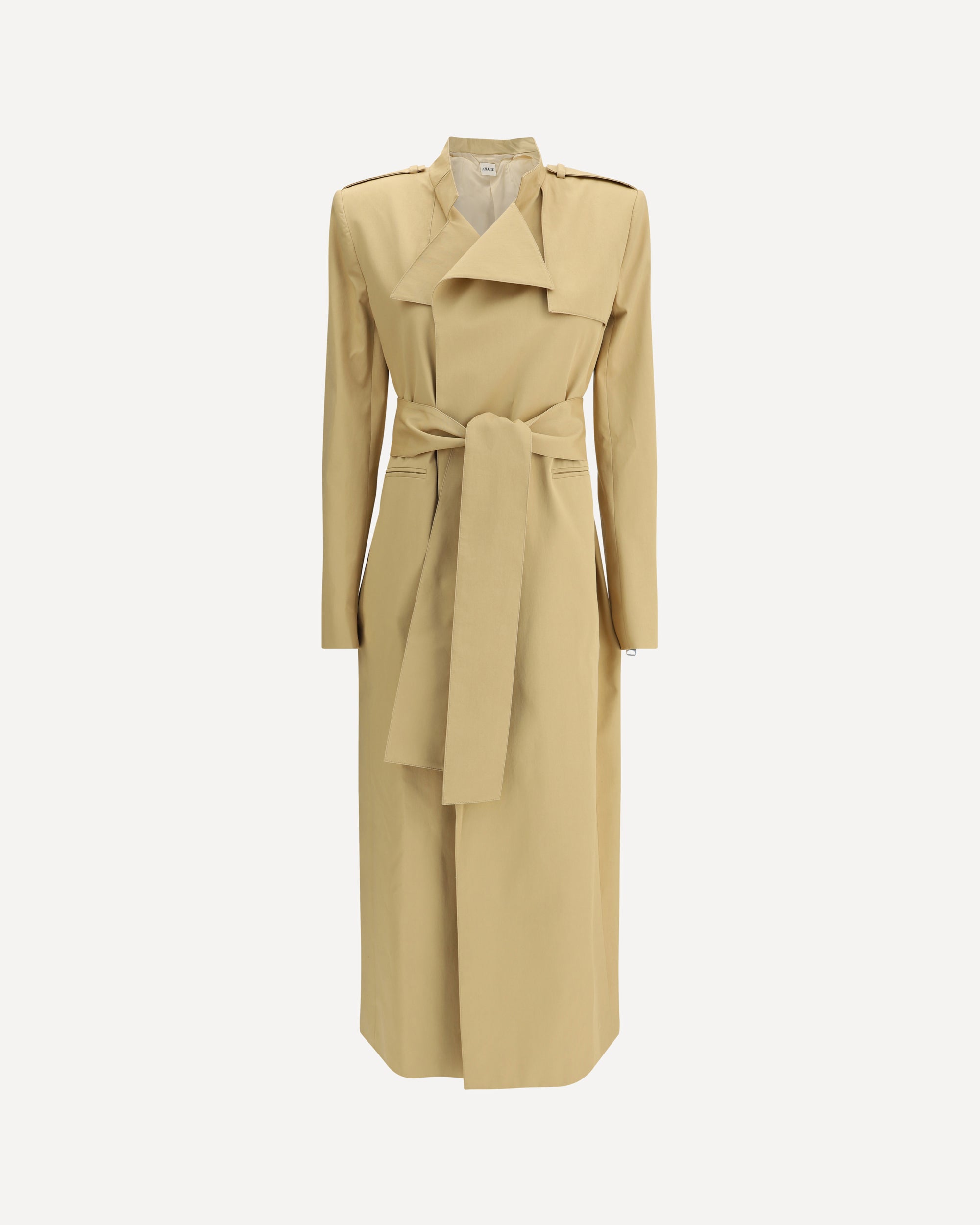 The Maxwell Trench Coat by Khaite is a stylish and versatile garment perfect for any season. With wide peaked lapels and two side and front welt pockets, it offers a sophisticated and functional design. The back slit adds movement and comfort, while the matching sash to tie at the waist allows you to customize the fit, creating a defined and refined silhouette. A timeless trench coat, ideal for completing any look with class.