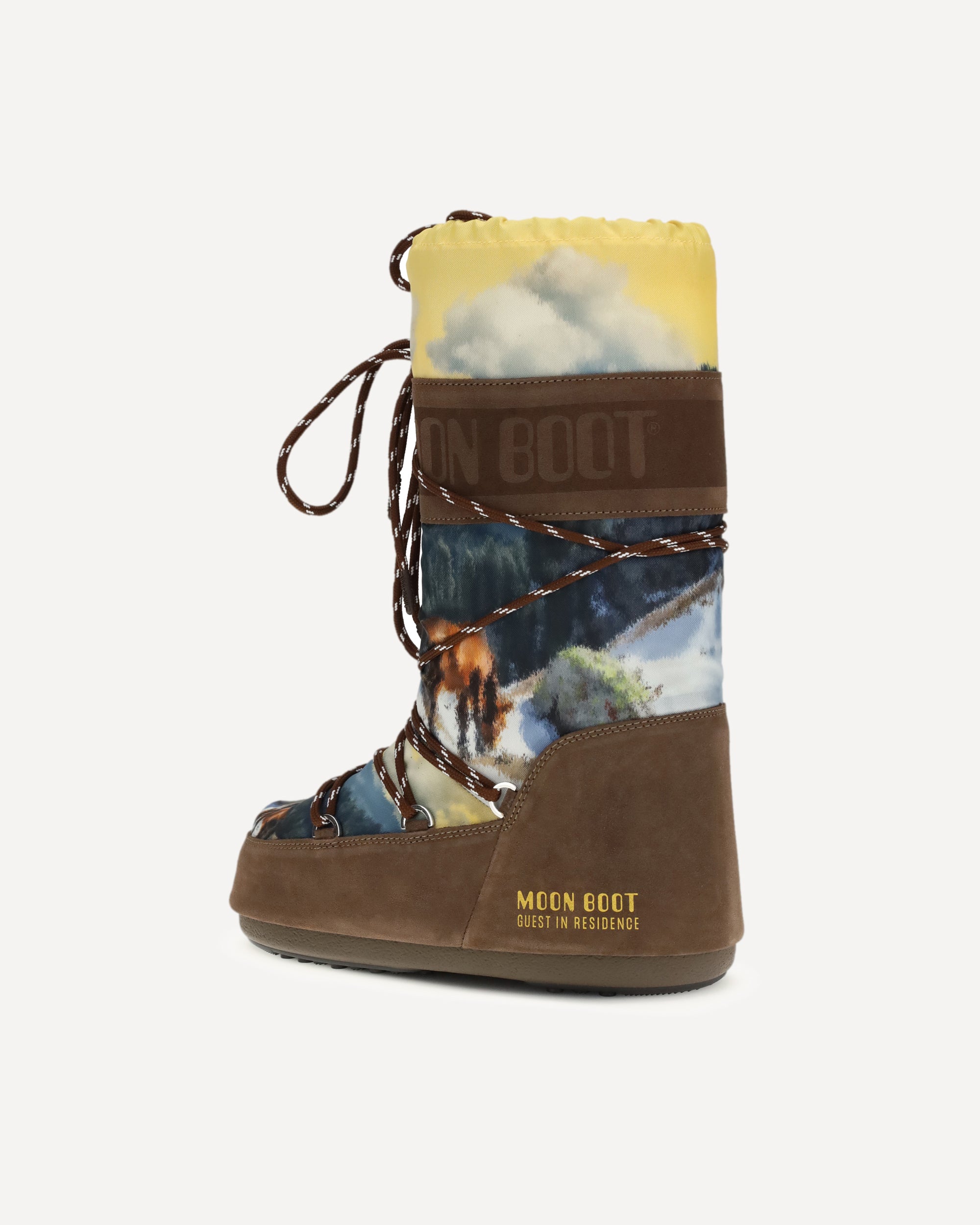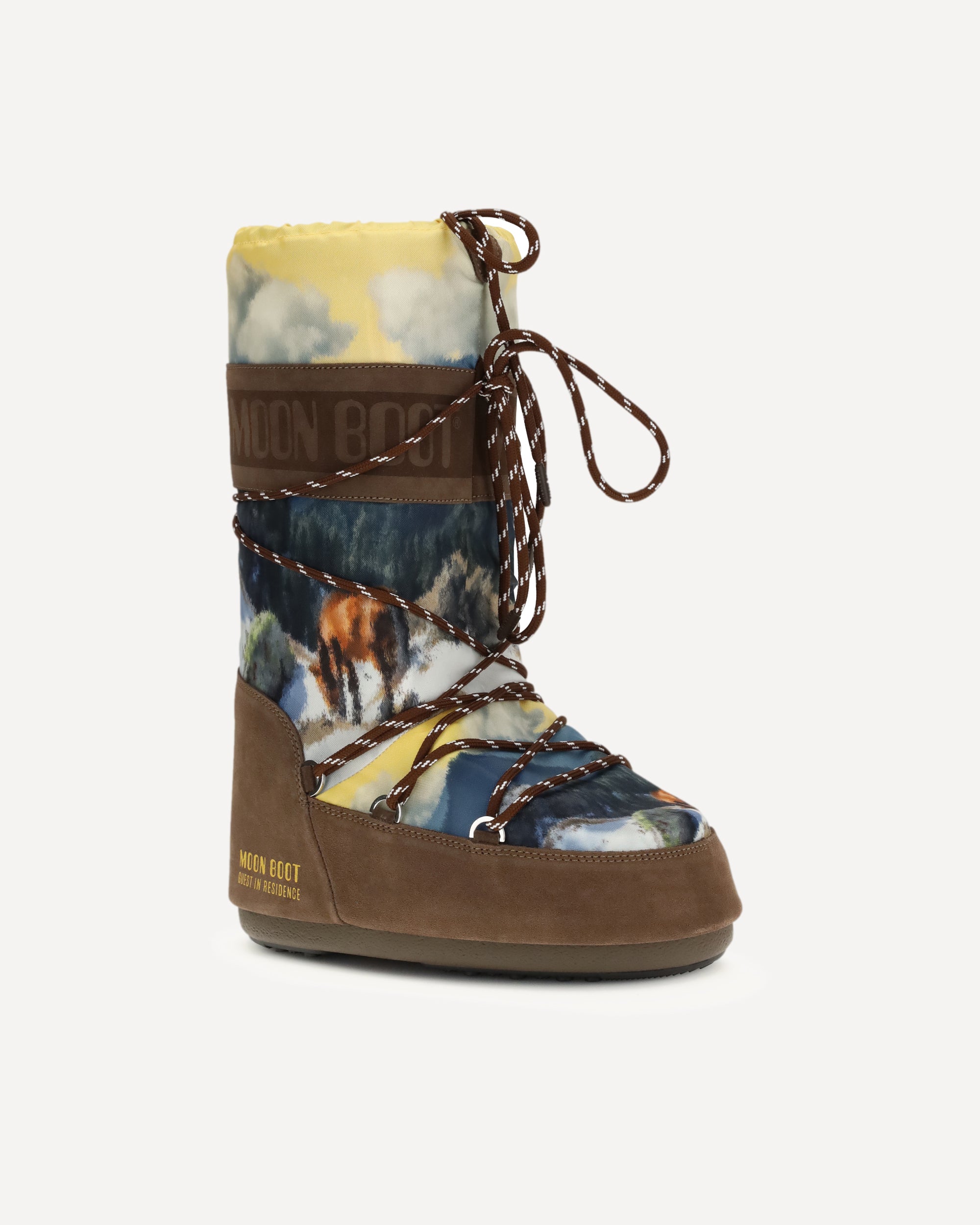 The Moon Boot X Guest In Residence print Boots combine fashion and functionality with a bold and original design. The unique and charming landscape print gives these boots a distinctive touch. The suede paneled design adds texture and style, while the lace-up closure ensures a secure fit. The rubber outsole ensures grip and comfort, while the knee-high design offers protection from the elements. Perfect for those looking for a pair of boots that are as functional as they are unique, with an artistic and refined twist.