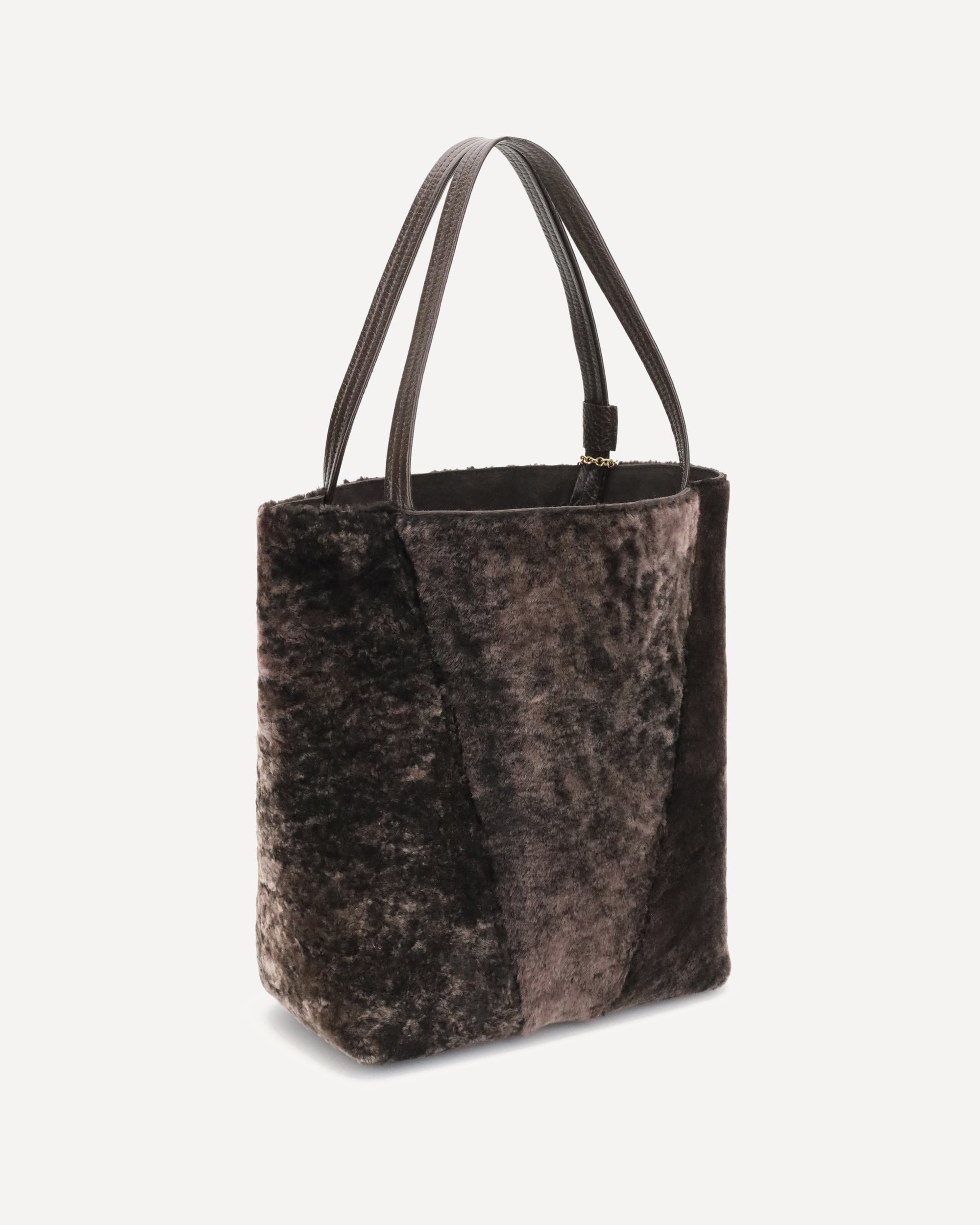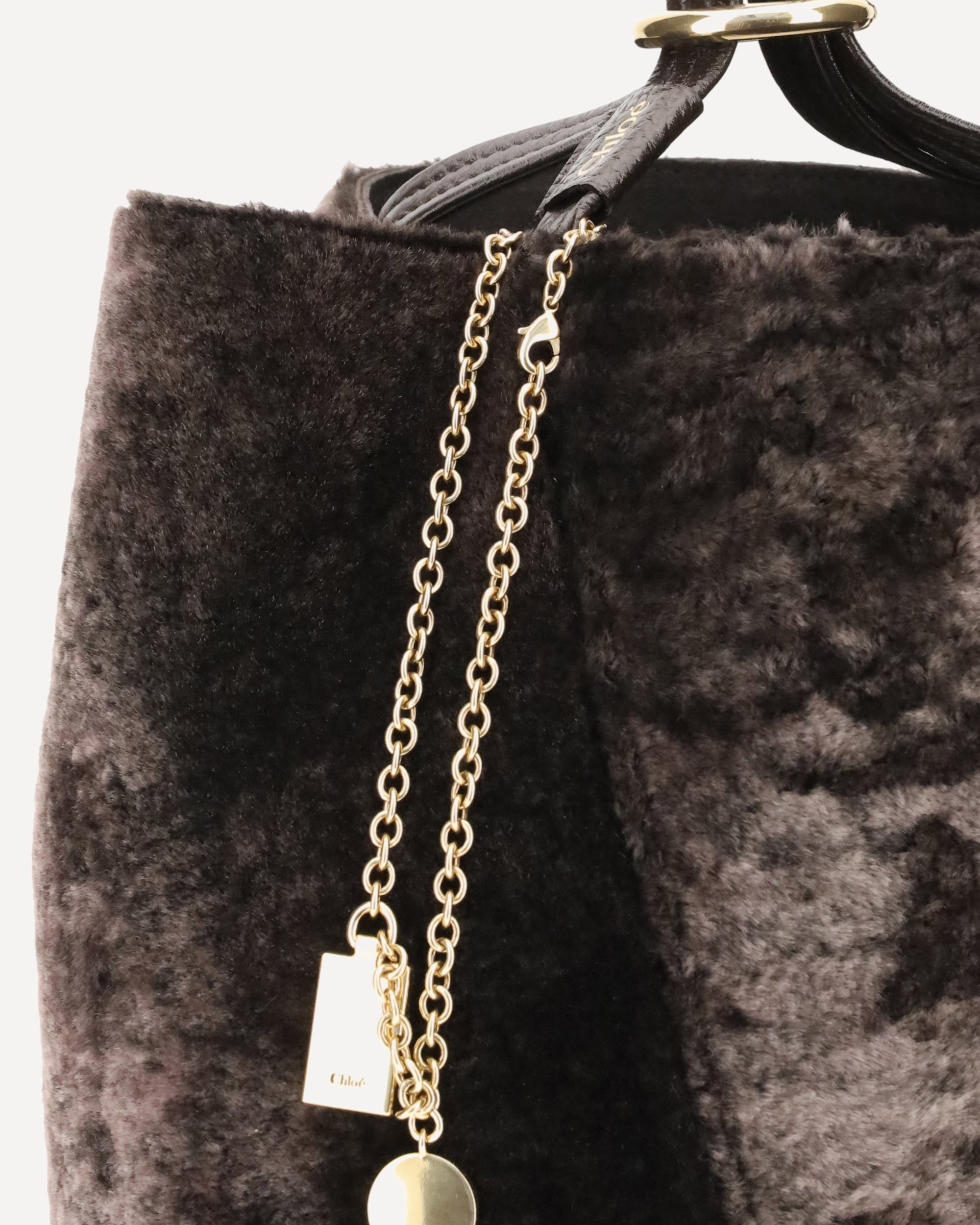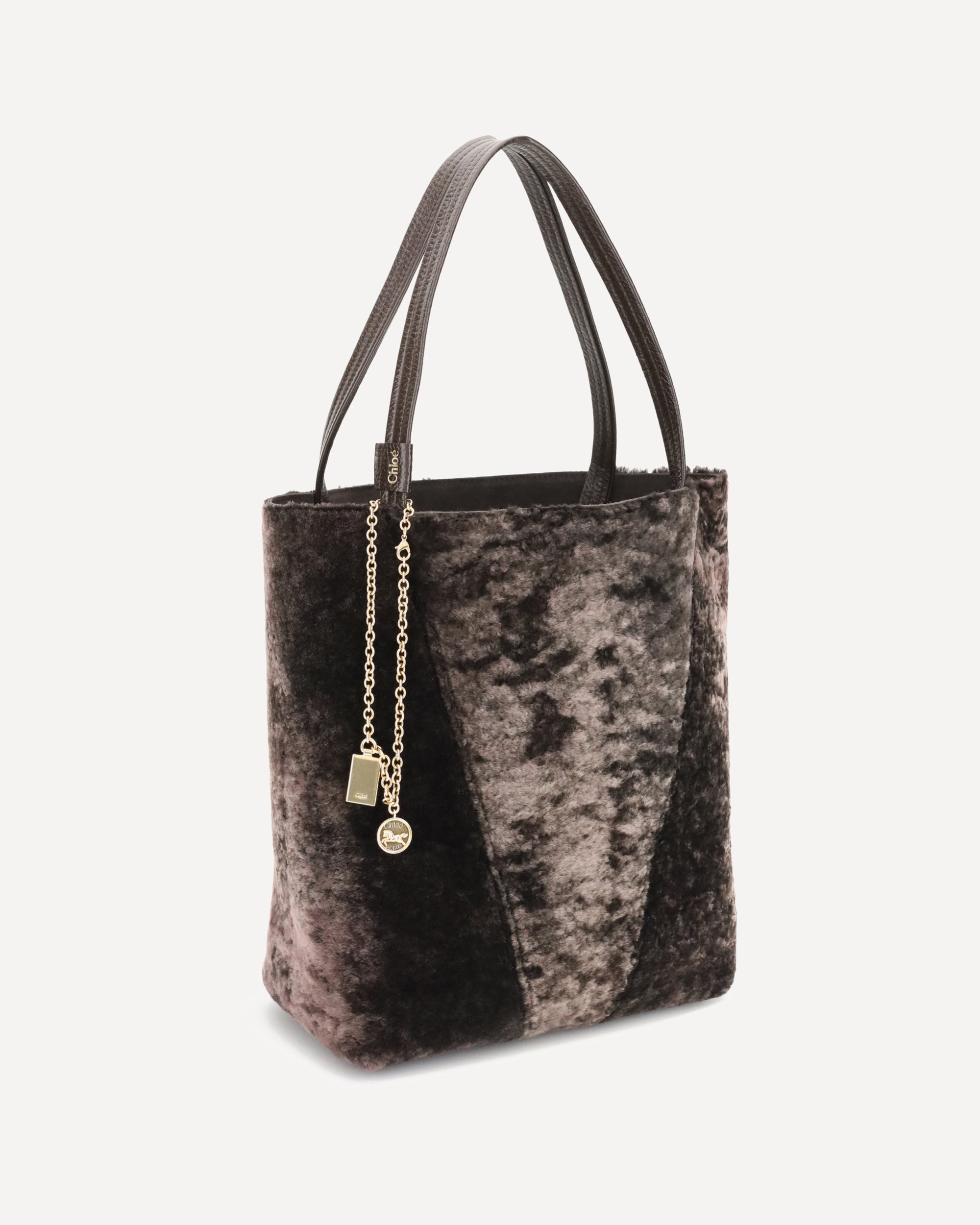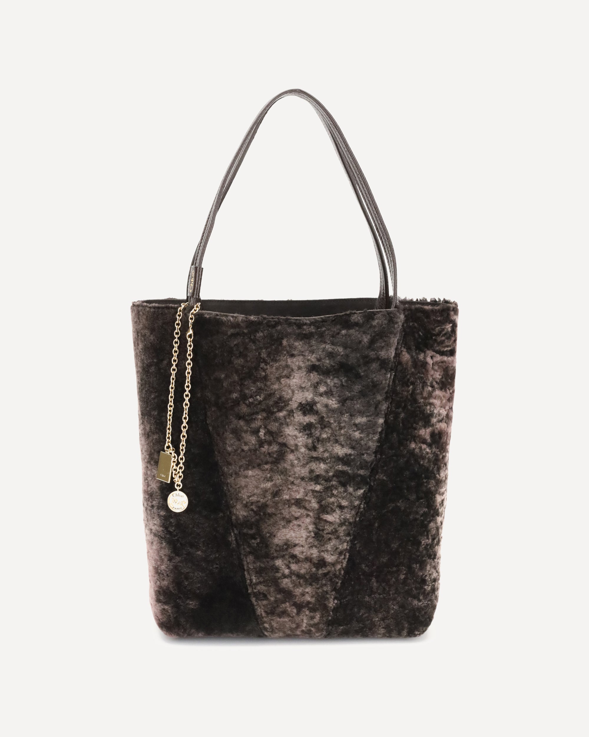 The Spin Shearling Tote Bag by Chloé is a dark brown shearling tote accented with gold-tone hardware. It features double handles and a decorative chain with Chloé and Horse pendants. The tone-on-tone interior completes the refined design. It can be worn over the shoulder or carried by hand by slipping the handles inside the ring for convenience.