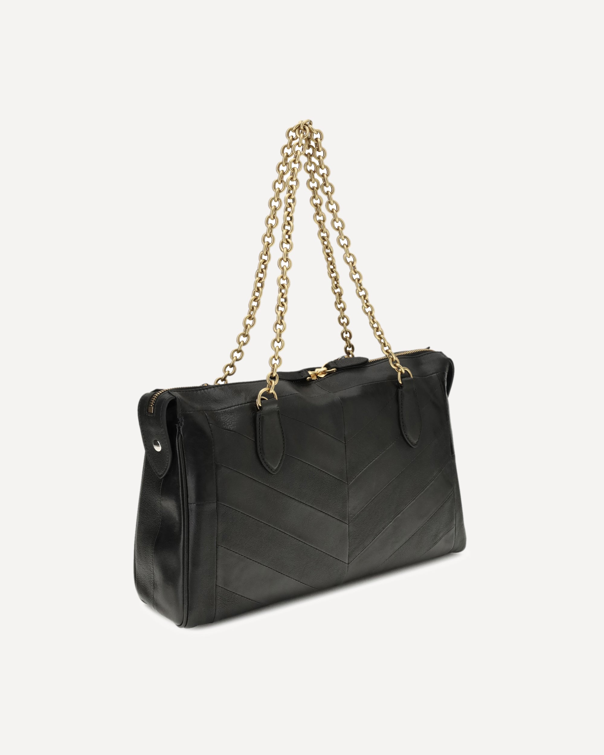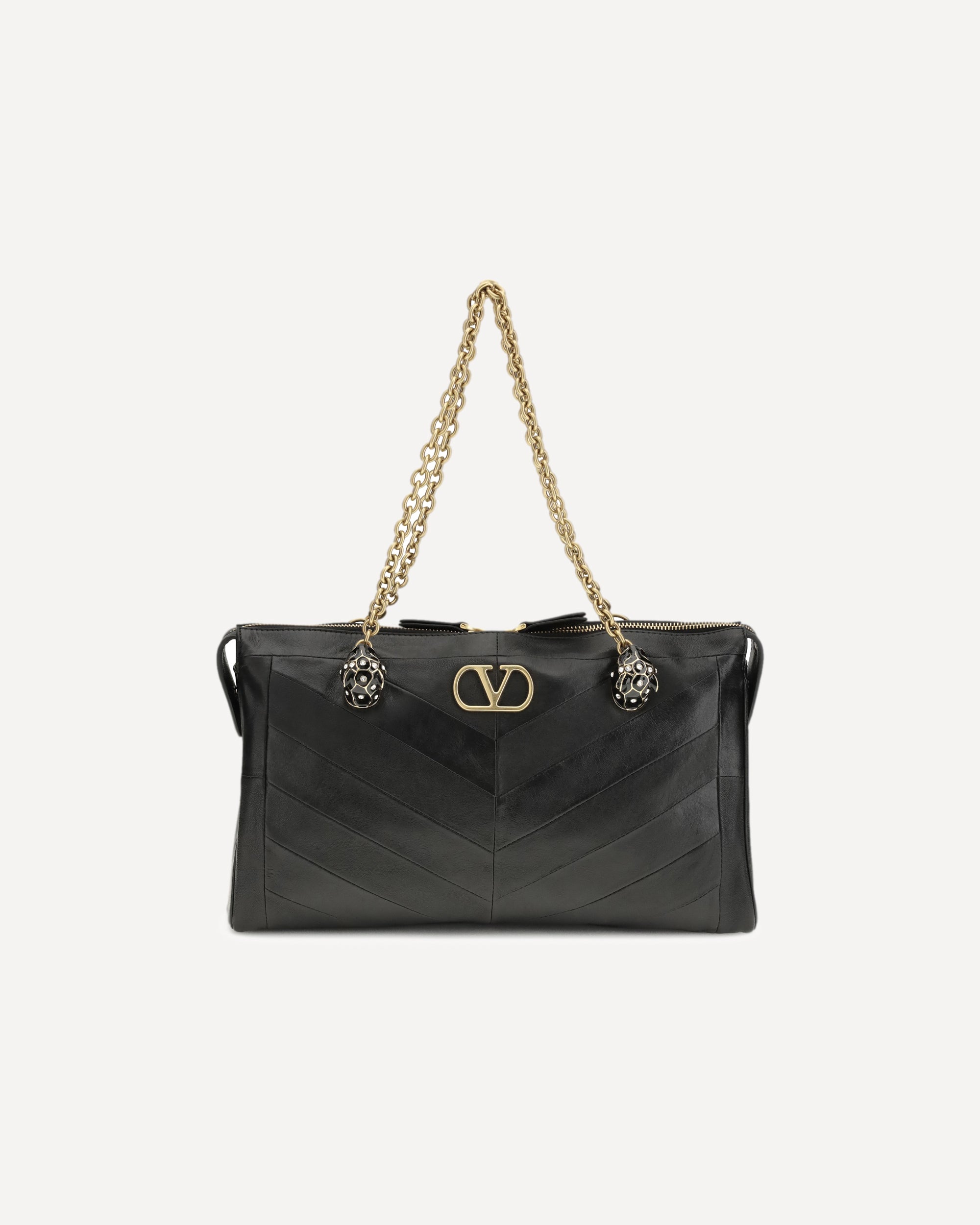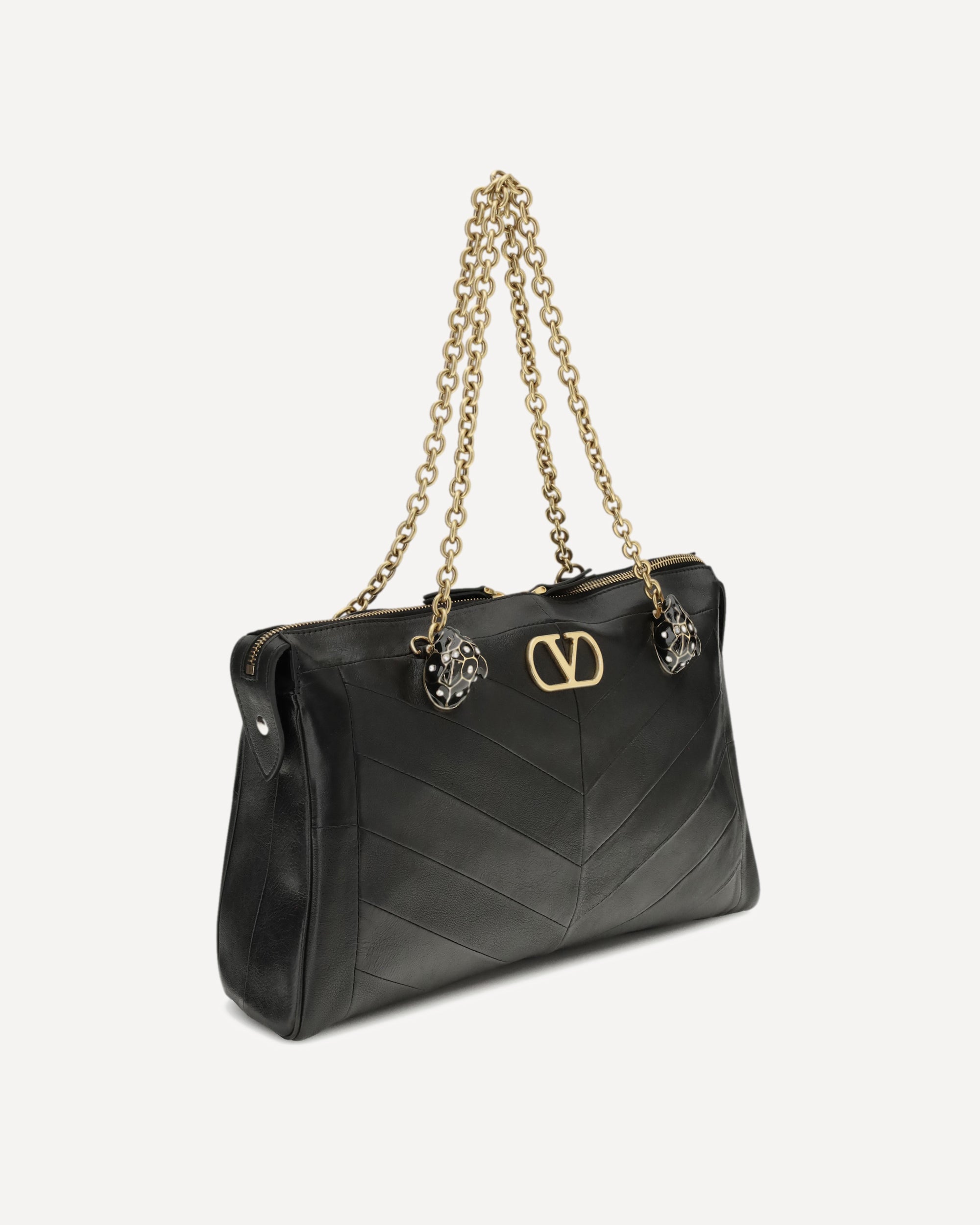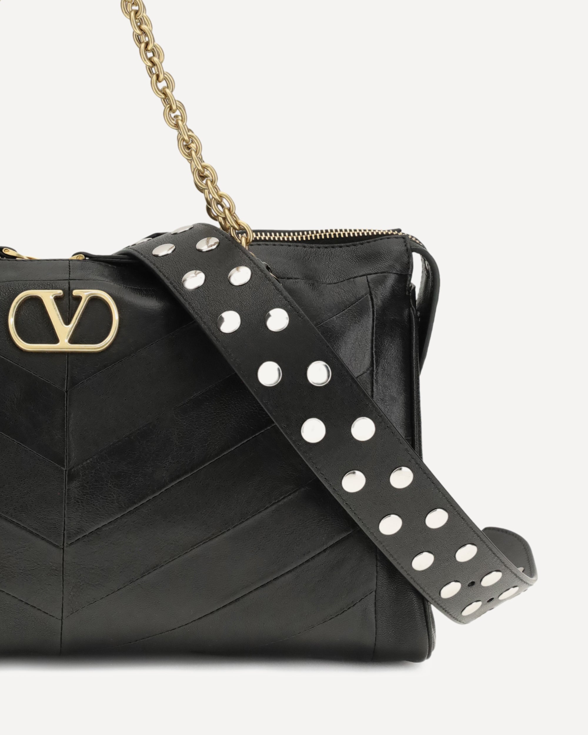 The Growl Medium leather Bag by Valentino Garavani embodies the brand’s signature sophistication and artisanal mastery. Crafted in Italy from black quilted leather, it stands out for its golden-tone details and the iconic VLogo on the front. The removable studded shoulder strap allows for both hand and shoulder carry, adding versatility and bold personality. Finished with structured handles and a double zip-top closure, it’s an accessory that blends femininity, edge, and refined urban elegance.