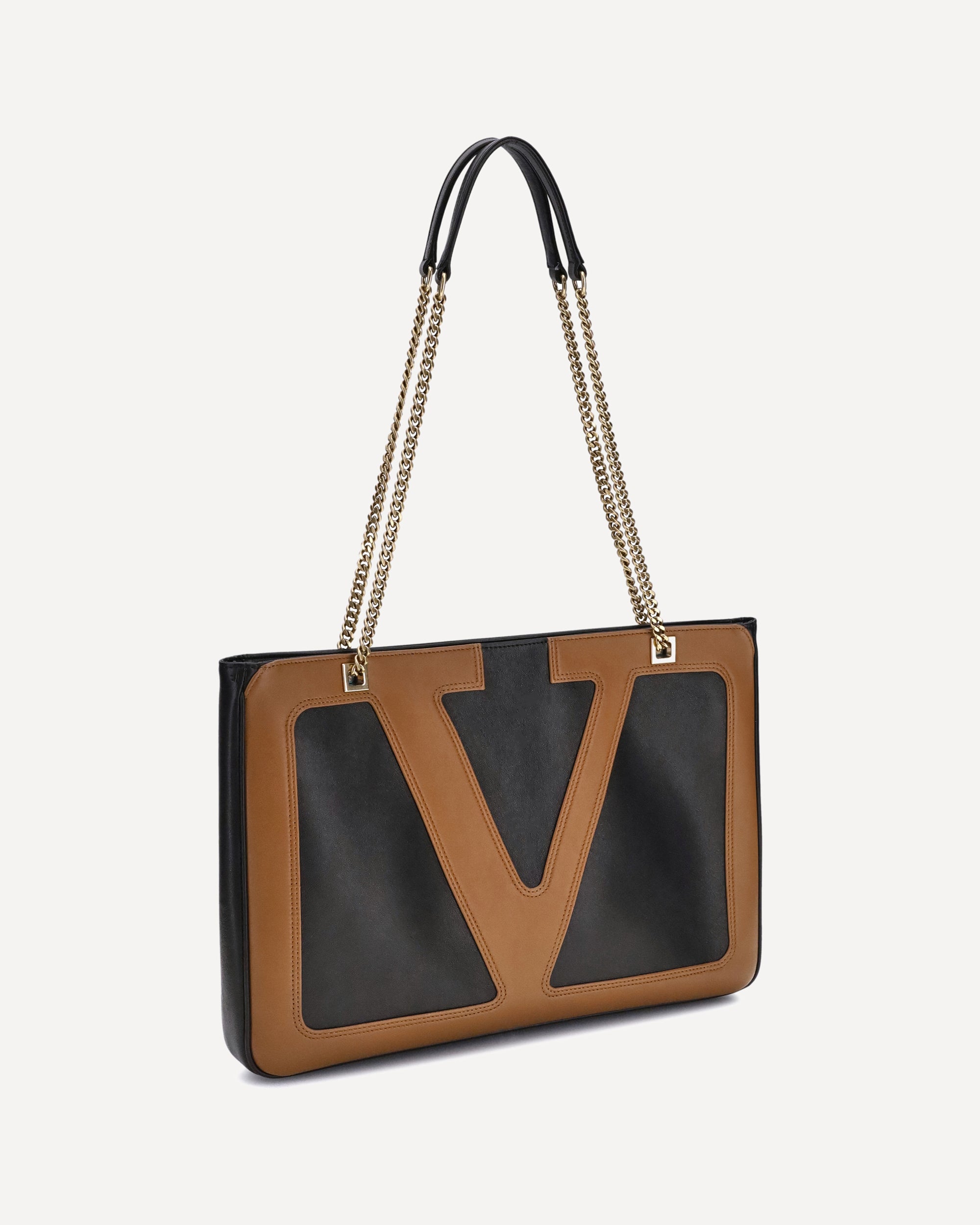 Valentino Garavani's medium Viva Superstar leather Shoulder Bag with double chain handle embellished with leather inserts is perfect for elegant shoulder wear. The iconic VLogo on the front adds a distinctive and refined touch. On the back is a practical slit pocket with zipper closure, while the interior, with a single compartment, offers essential space for everyday items. A model that combines sophisticated style and functionality.