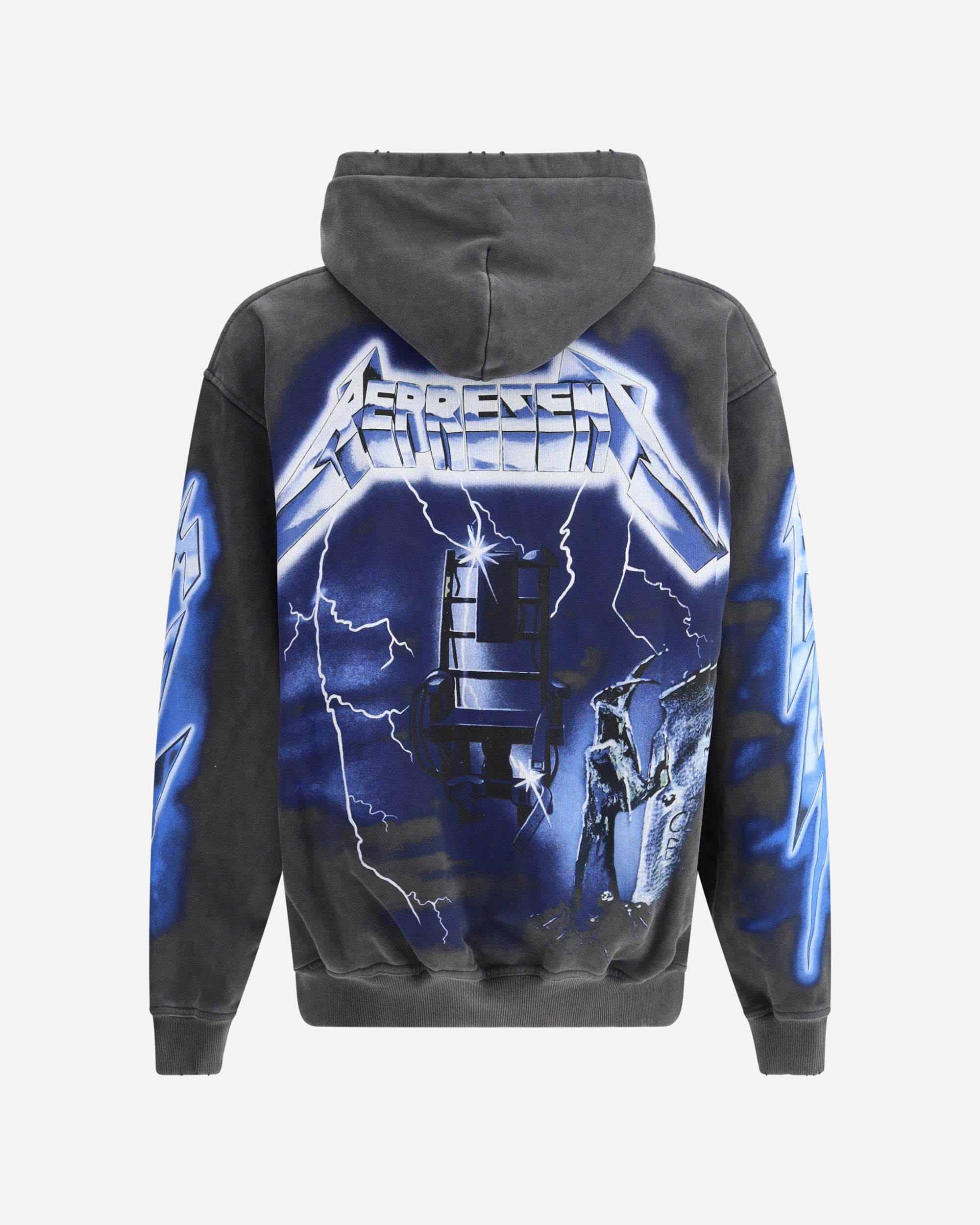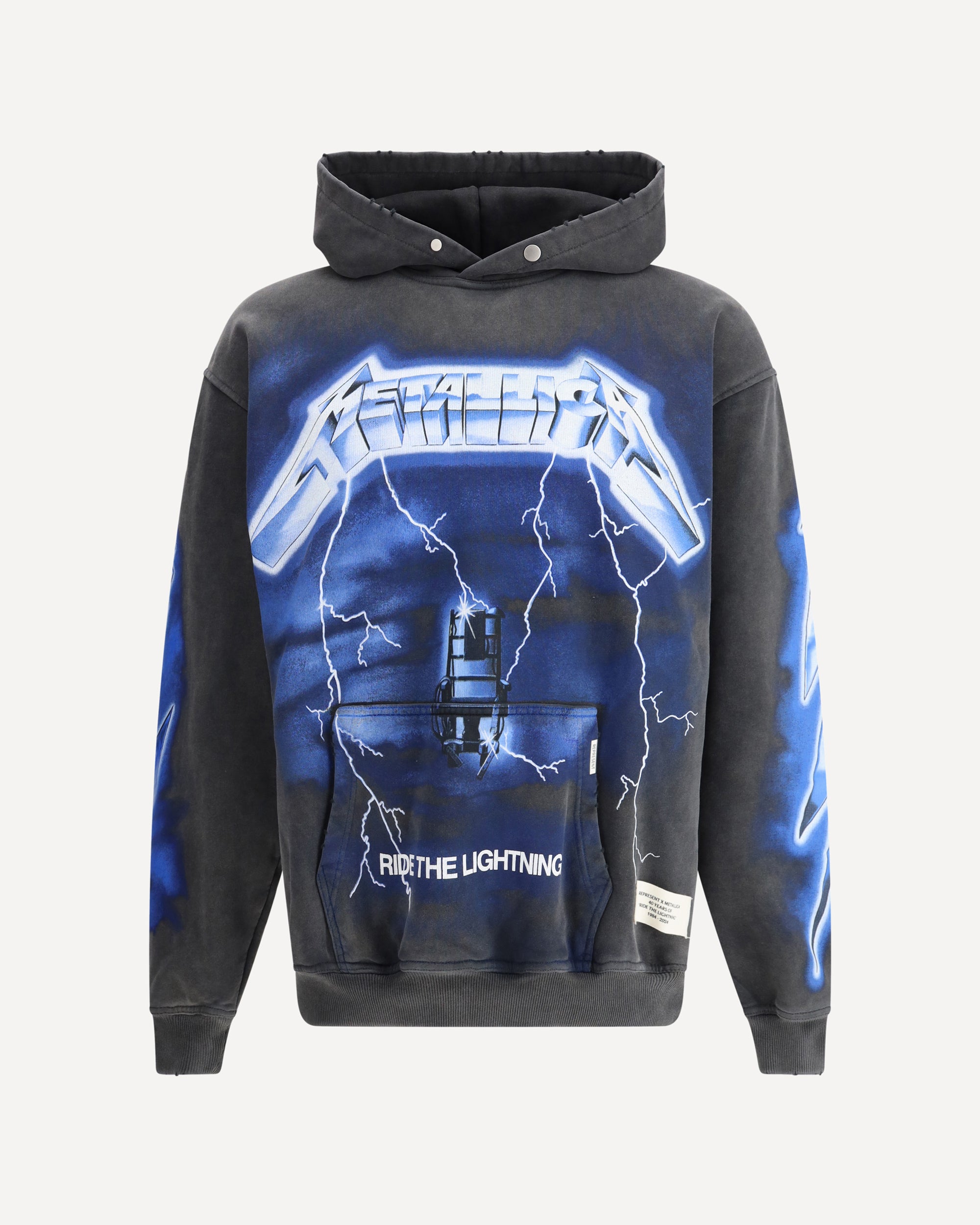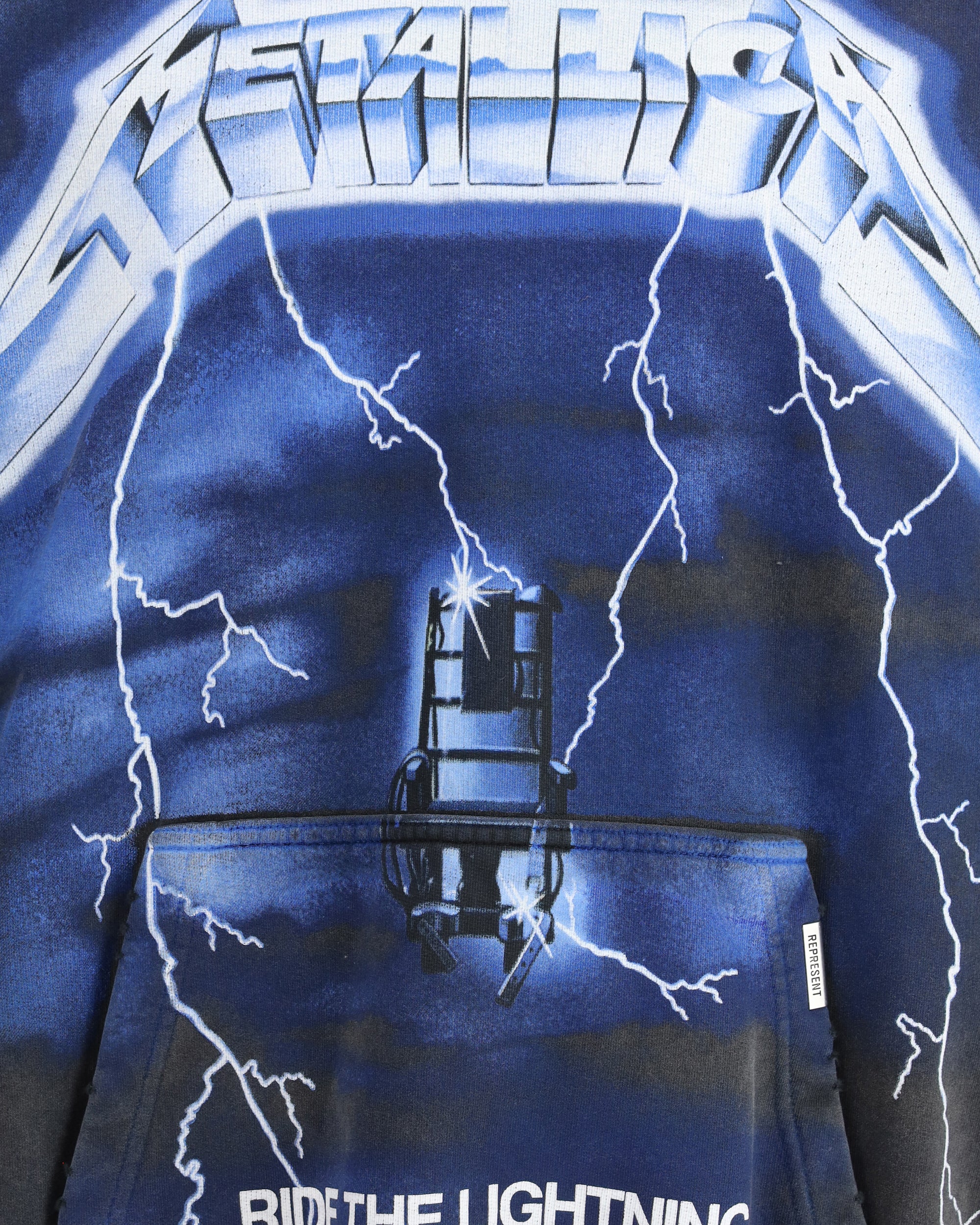 The Metallica Ride The Lightning cotton Hoodie by Represent features a maxi print on the front, back and sleeves, inspired by the band's iconic album. The kangaroo pocket on the front adds practicality, while the ribbed cuffs and hem ensure a comfortable, finished fit. The vintage worn-effect pattern lends a retro look, perfect for music fans and those looking for a bold, punchy style.