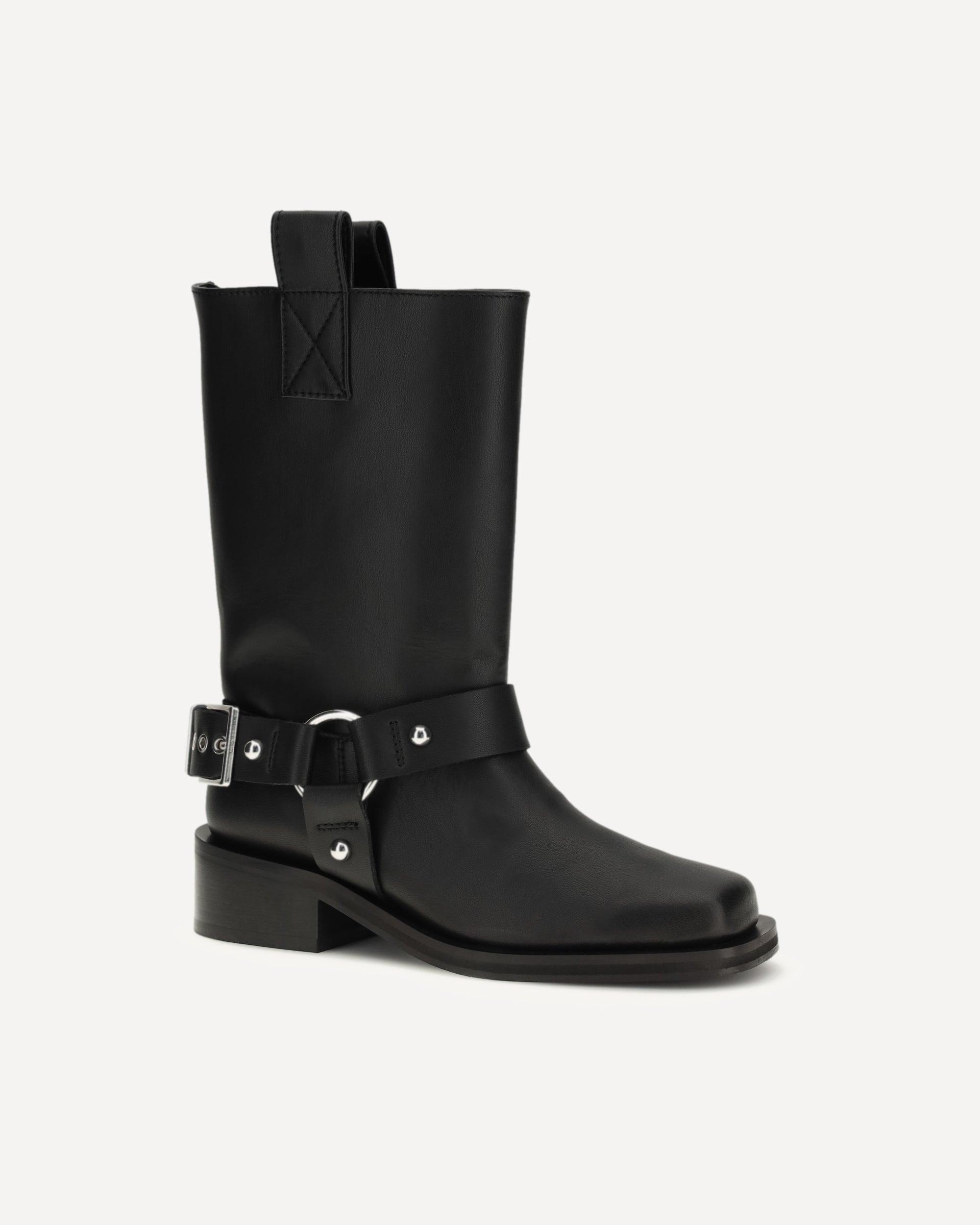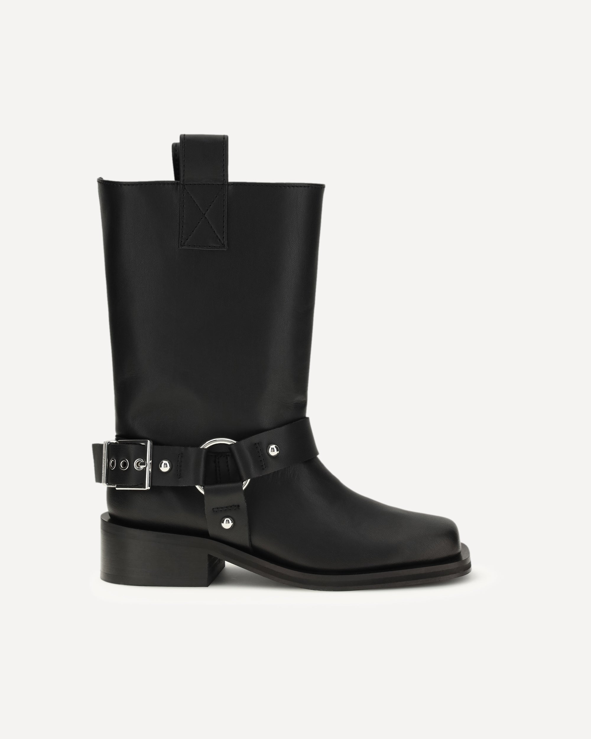 The biker Boots by Ganni are a bold and stylish take on traditional biker footwear. Featuring a square toe and block heel, they offer the perfect balance between comfort and style. The tabs and buckle strap with studs add a touch of grit and personality, making these boots ideal for those looking for a bold, contemporary look. Perfect for adding character to any outfit, from casual to rock chic.