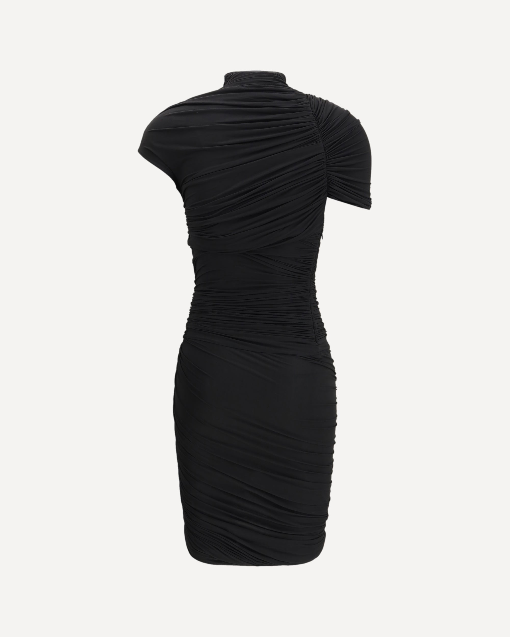 The turtleneck mini Dress by Francesco Murano redefines femininity through a sculptural and sensual design. The draped detailing enhances the bust line, while the ruched sleeves and asymmetric hem create a graceful sense of motion. The fitted corset shapes the silhouette with refined precision, reflecting the designer’s contemporary vision where structure becomes art and the dress embodies both strength and elegance.