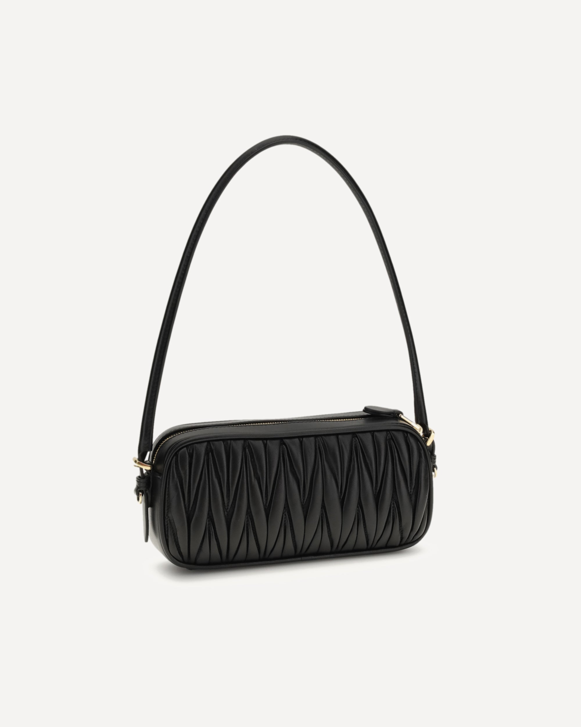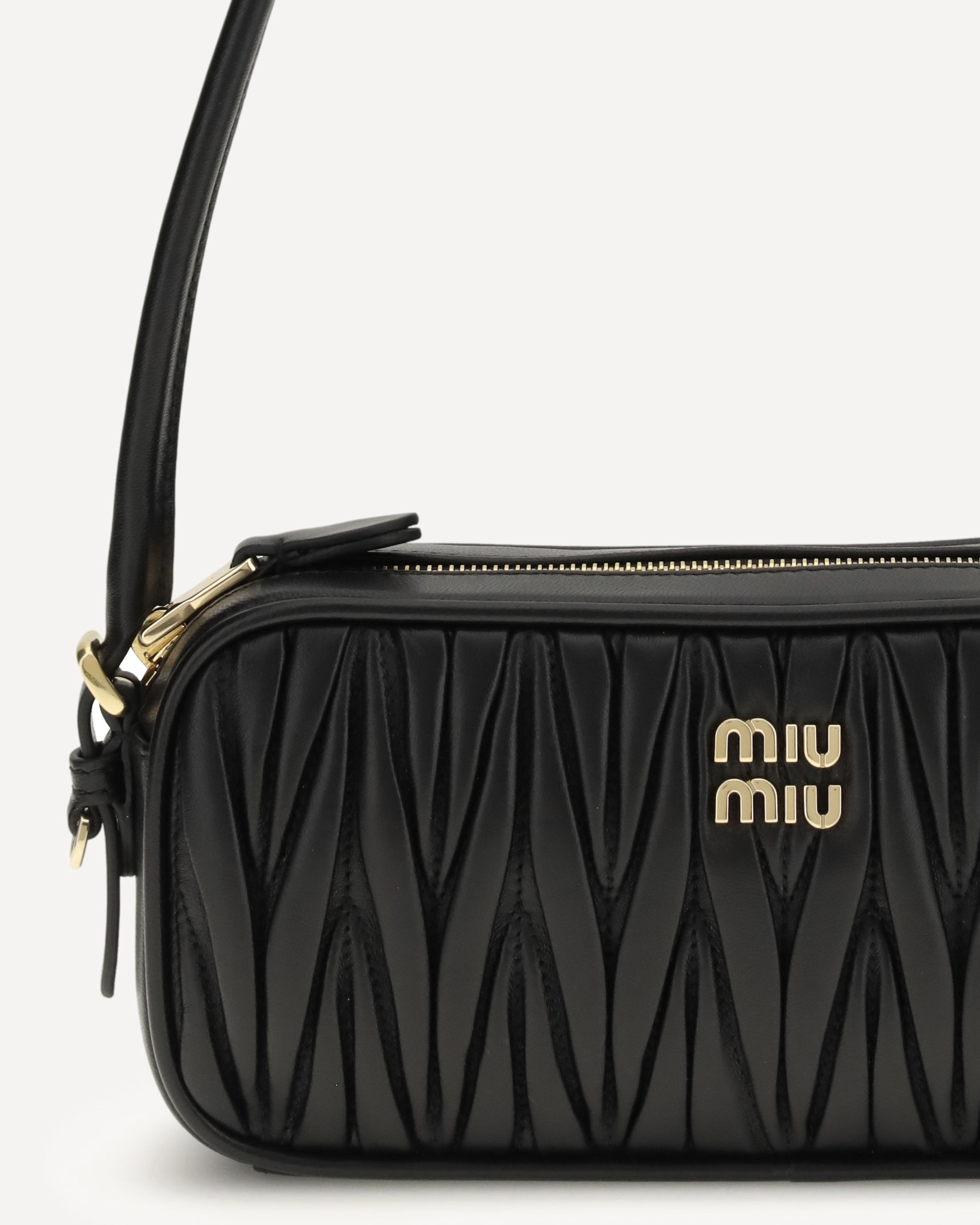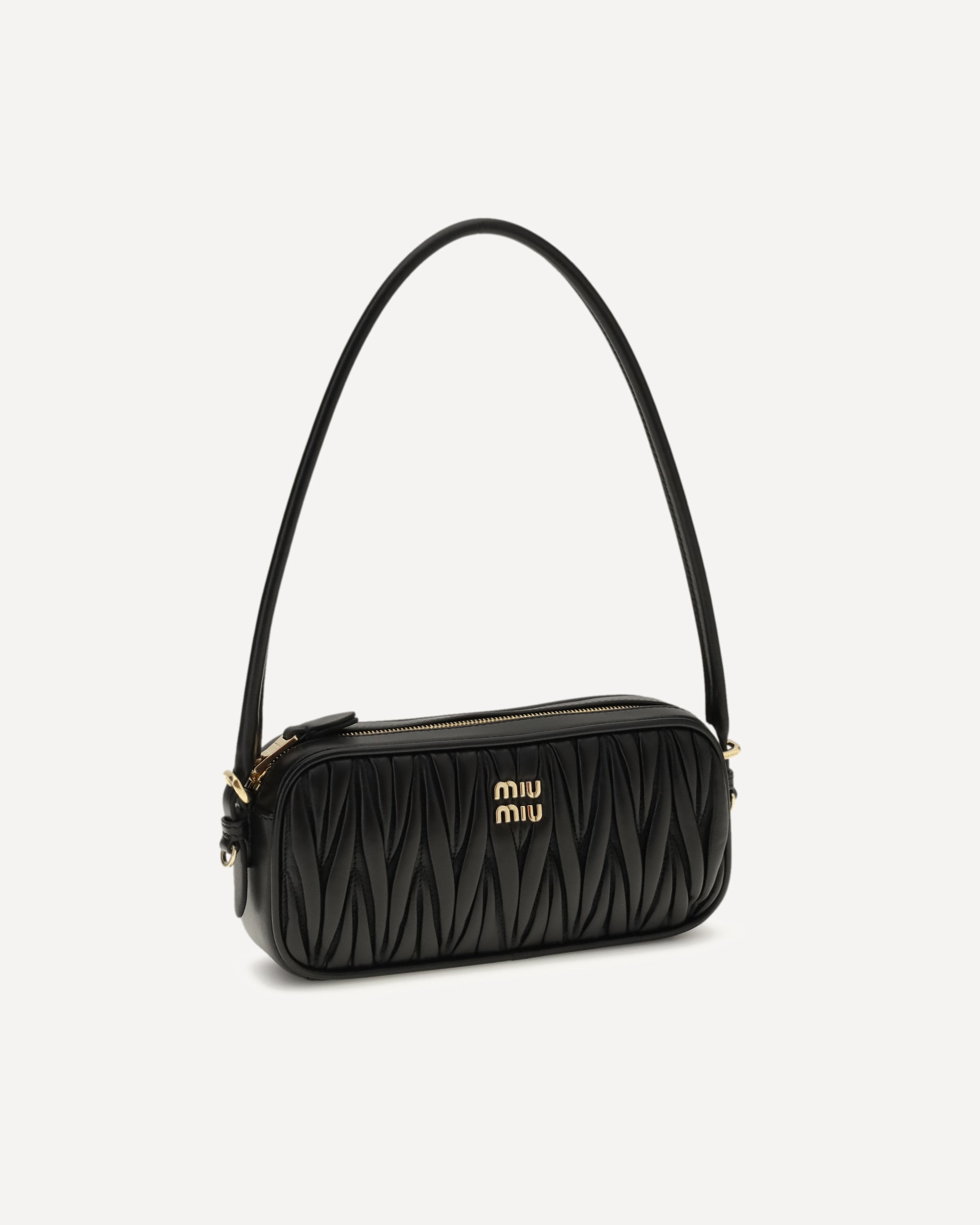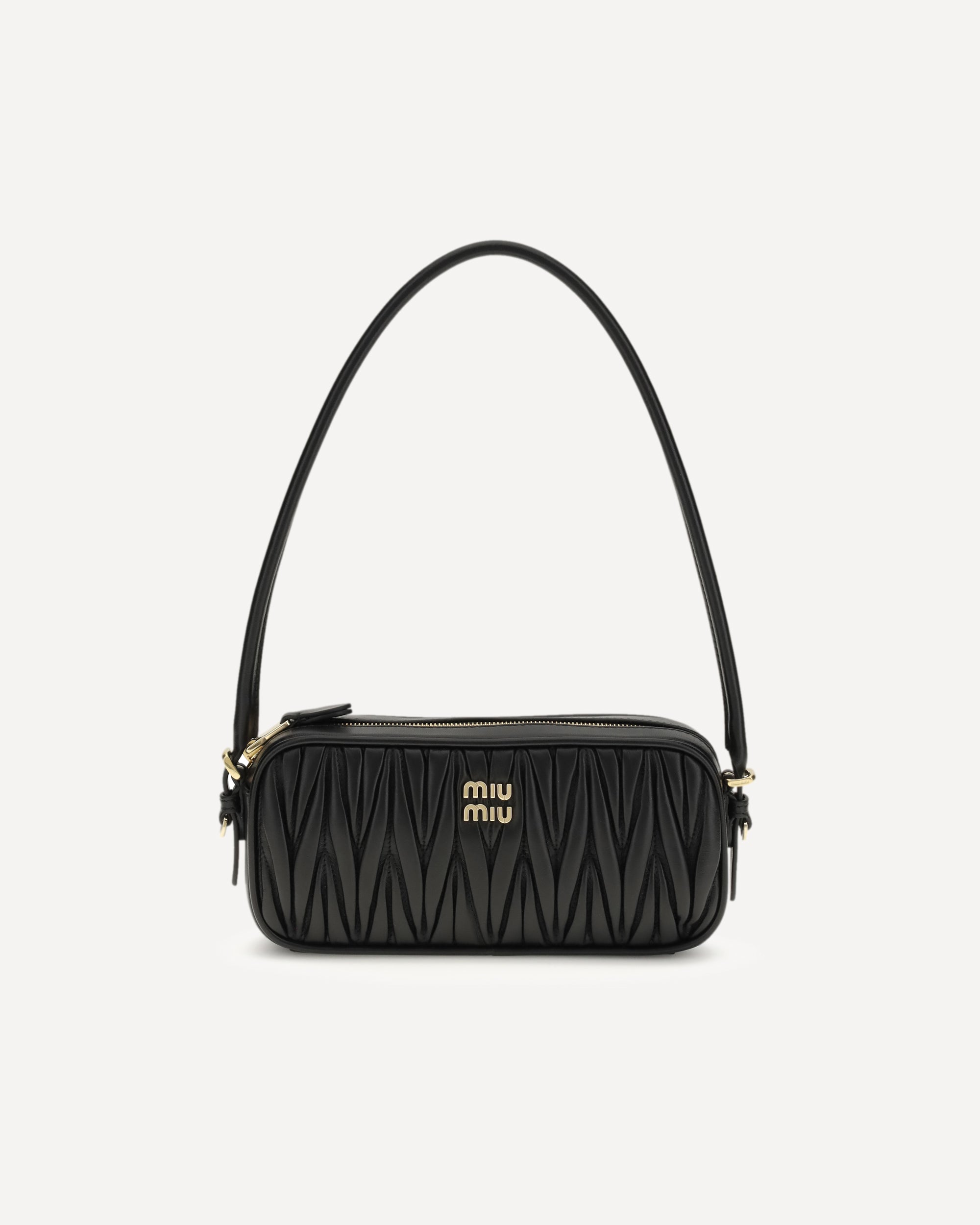 The leather Shoulder Bag by Miu Miu is crafted from soft matelassé leather and embellished with metal letter branding on the front. It features a tonal rounded leather handle, a secure zip closure and a fully lined interior, combining modern elegance with the brand’s distinctive identity.