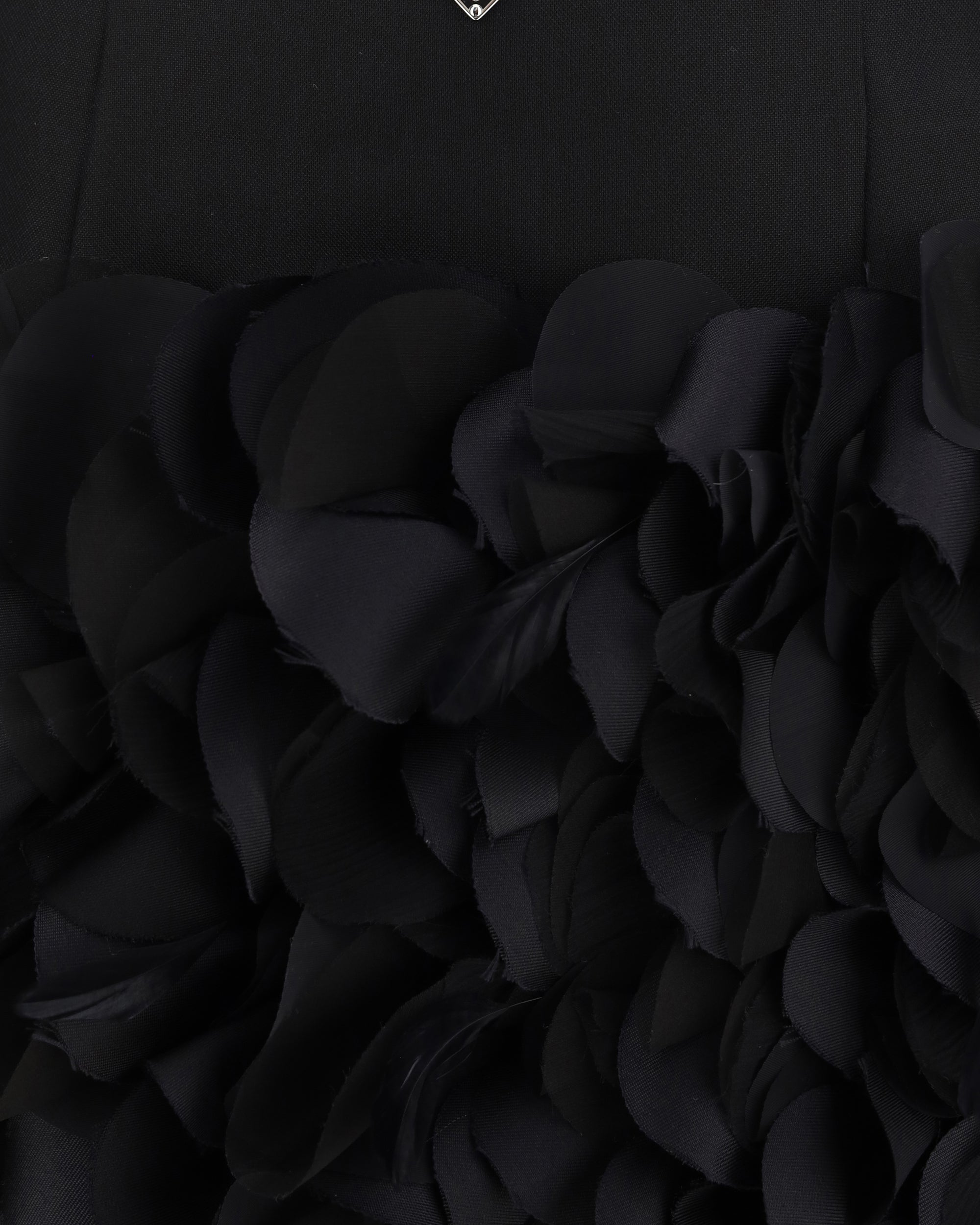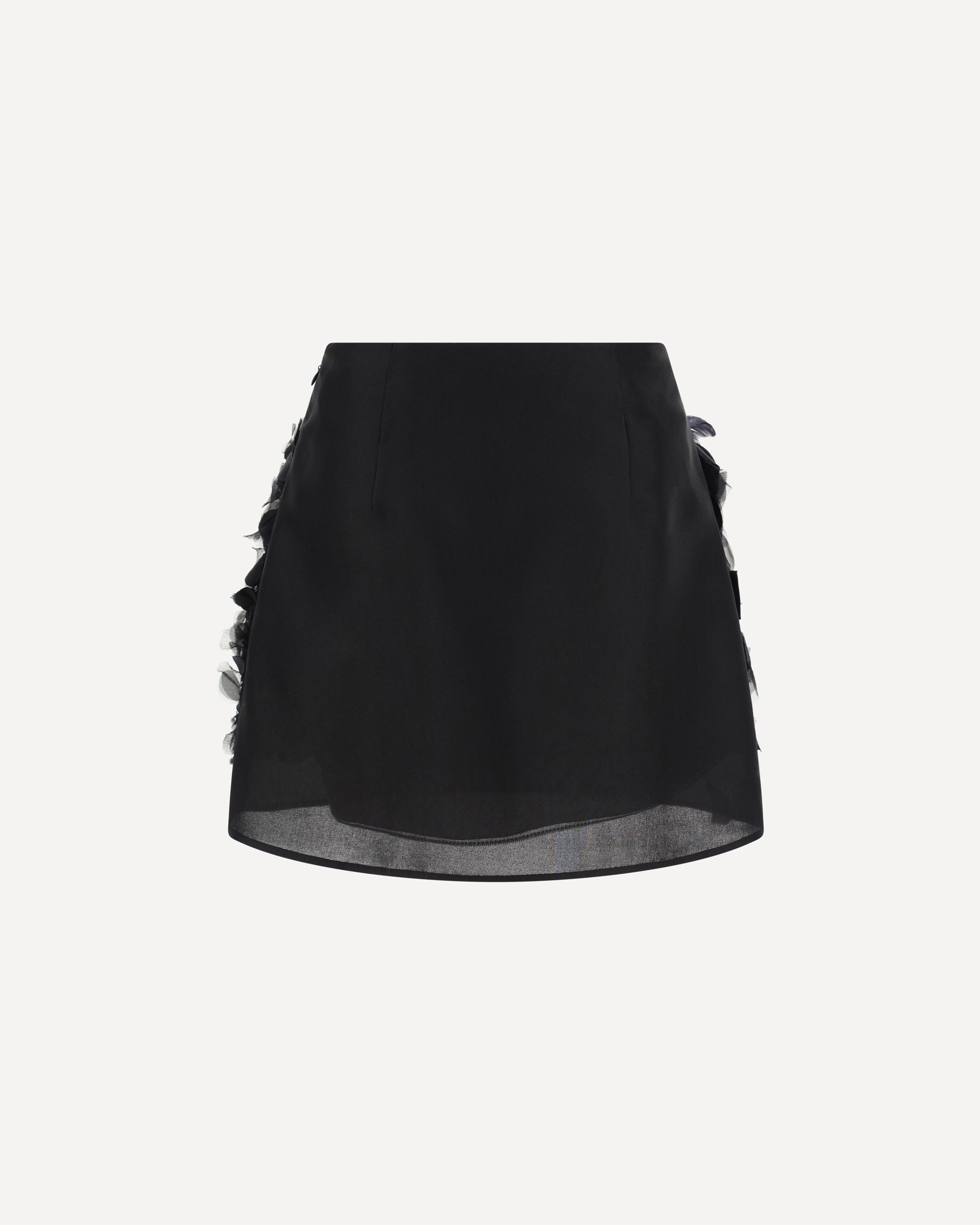 Silk Mini Skirt by Prada, iconic enameled triangular plaque with brand signature applied on the front, concealed side zipper closure, three-dimensional floral details and feathers made of silk embossed on the front panel.