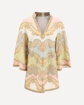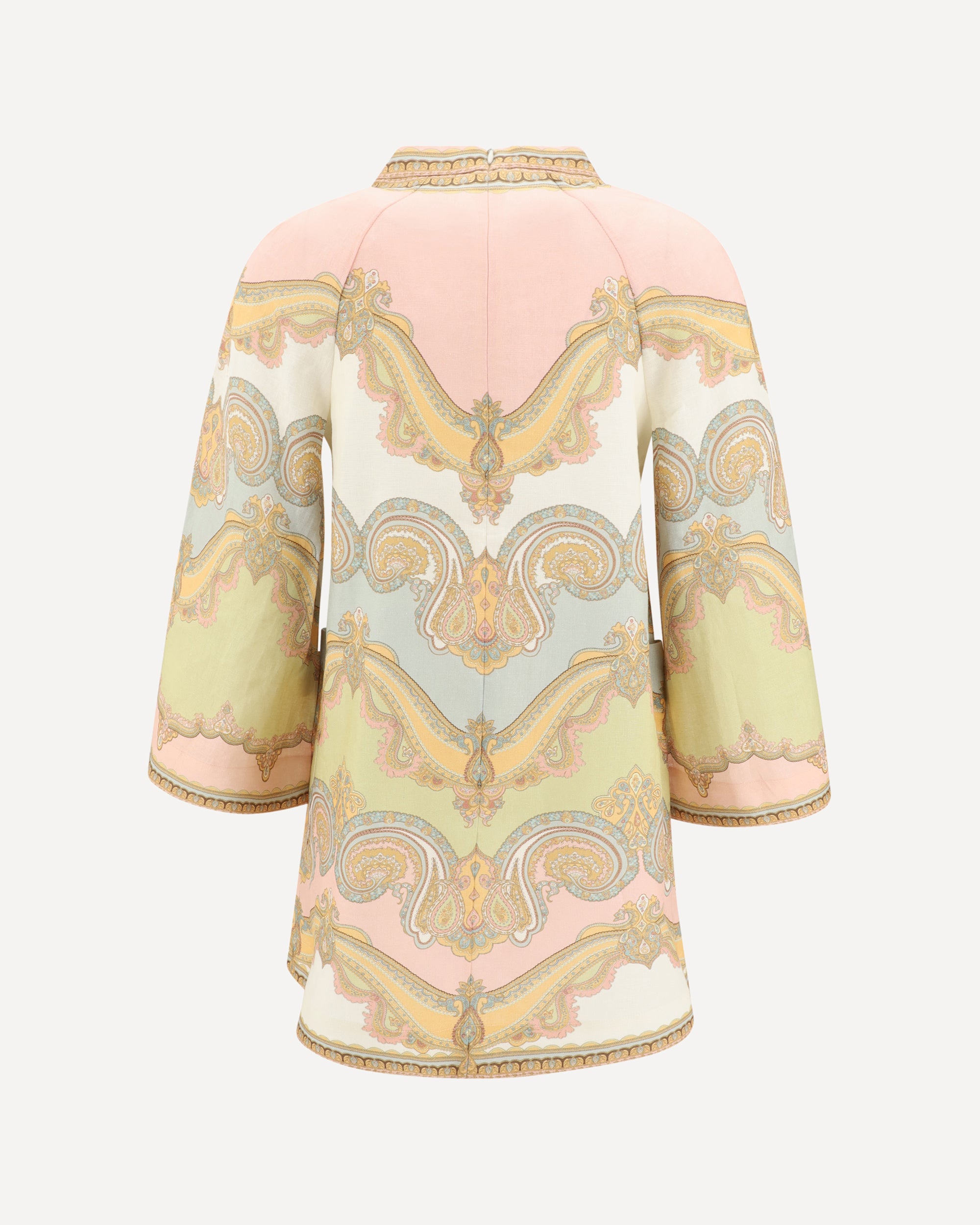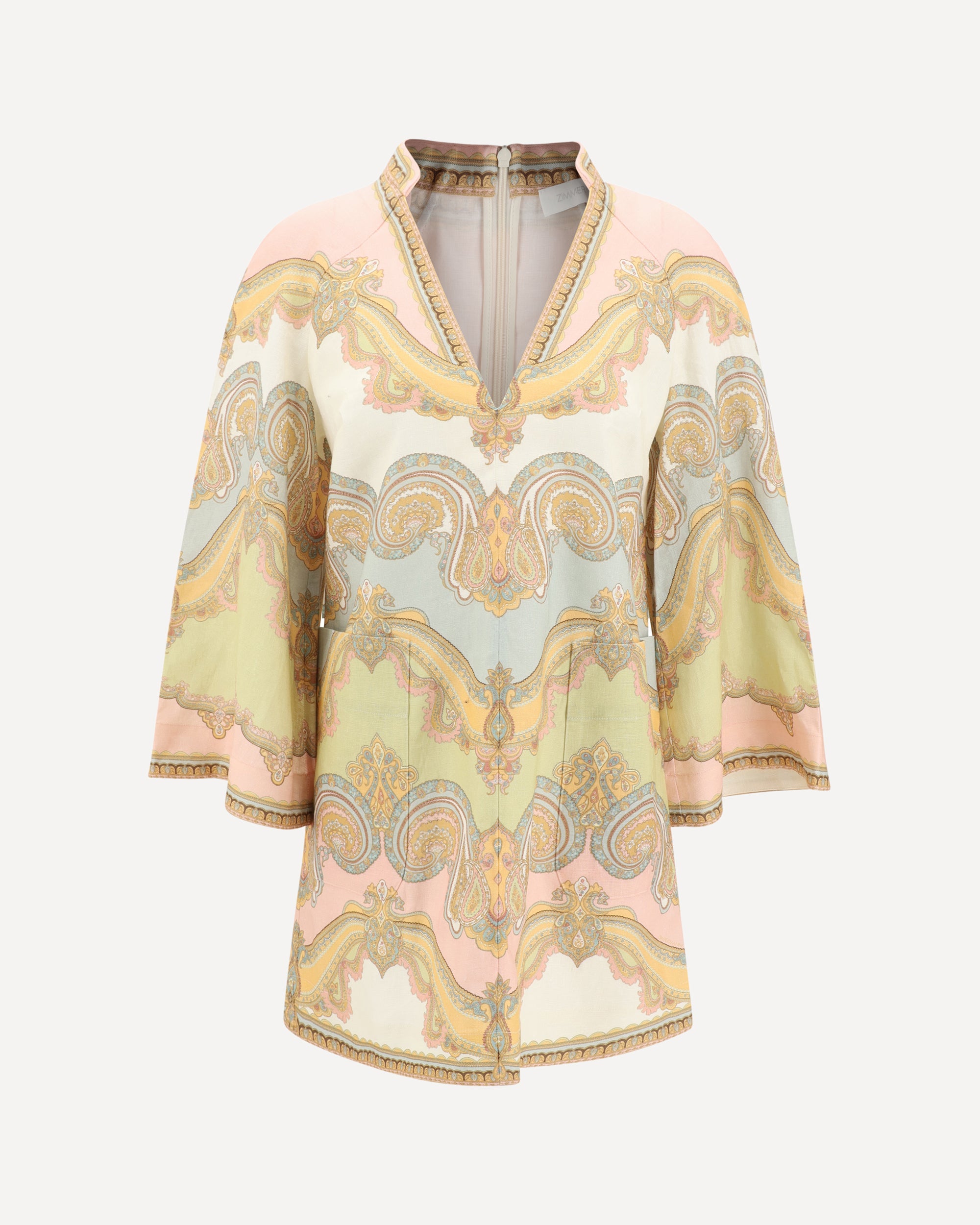 The Zimmermann mini tunic Dress features a deep V-neck on the front and a back zip closure. The wide sleeves and two front patch pockets add practicality and style to the design. The multicolor pattern makes this dress elegant and vibrant, perfect for informal yet sophisticated occasions.