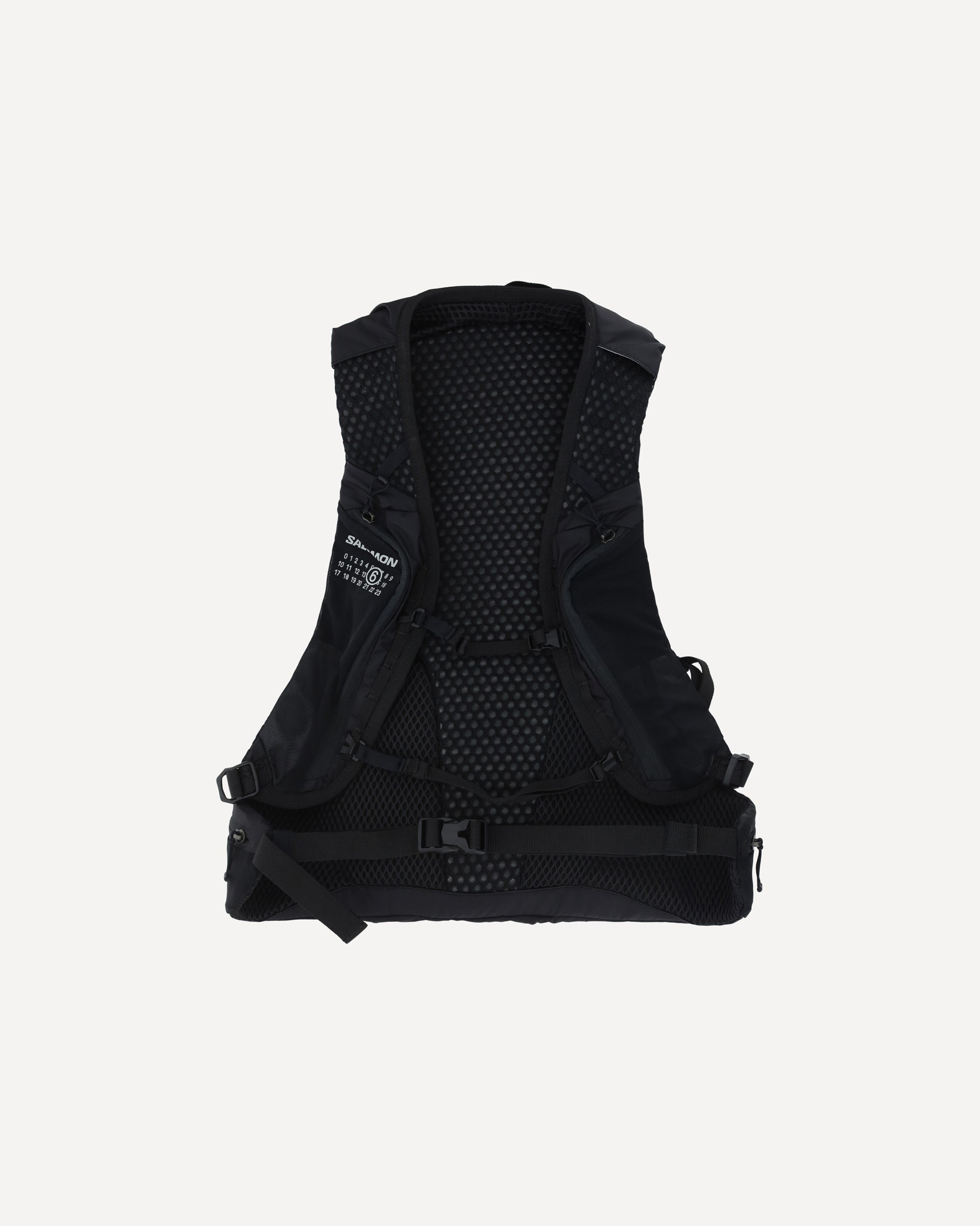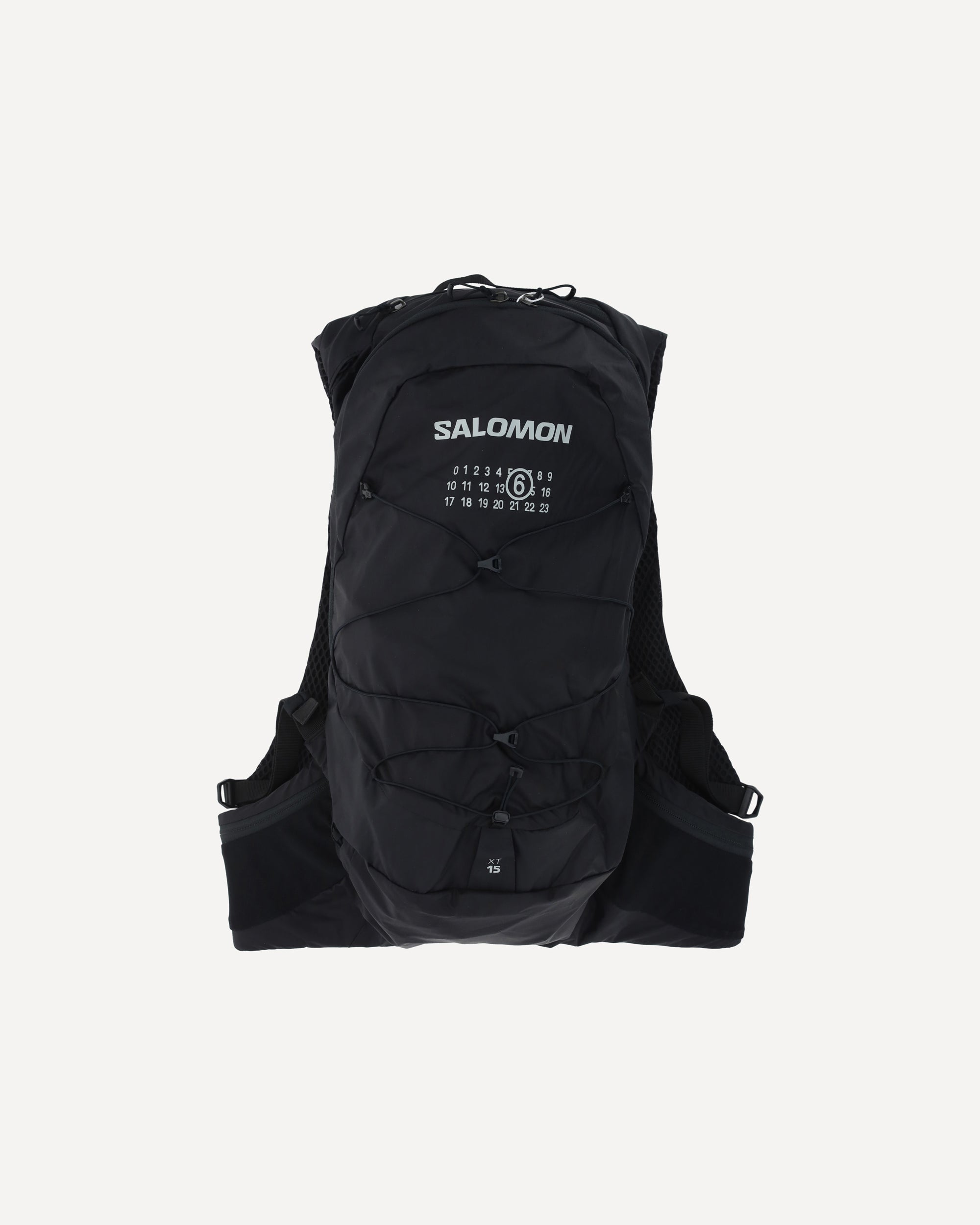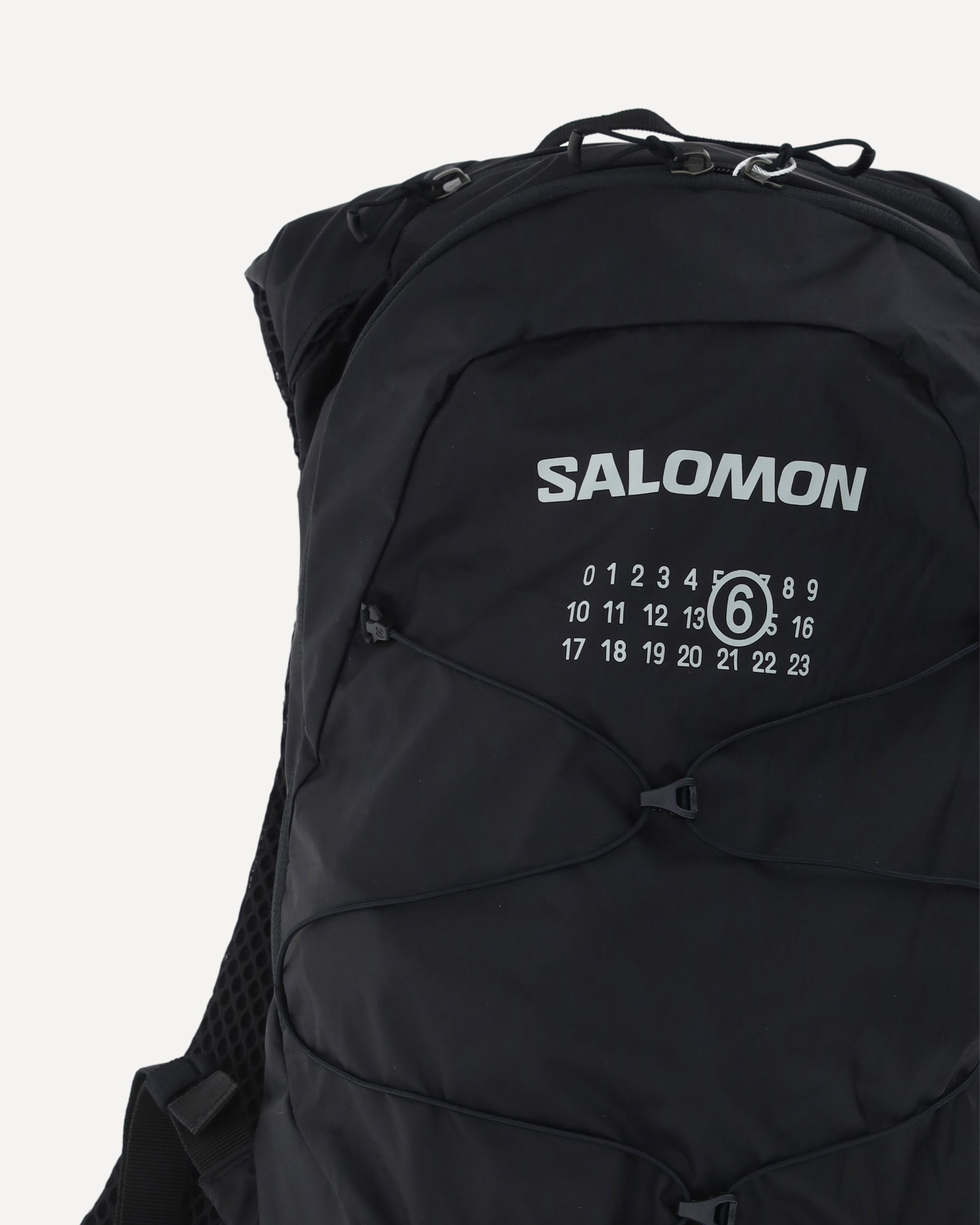 Backpack by Salomon X MM6, contrasting adjustable and logoed shoulder straps, technical inserts with concealed zipper closure, top closure by double-slider zipper, breathable mesh paneled design, iconic MM6 logo and Salomon monogram applied in contrast on front panel, single interior compartment.