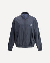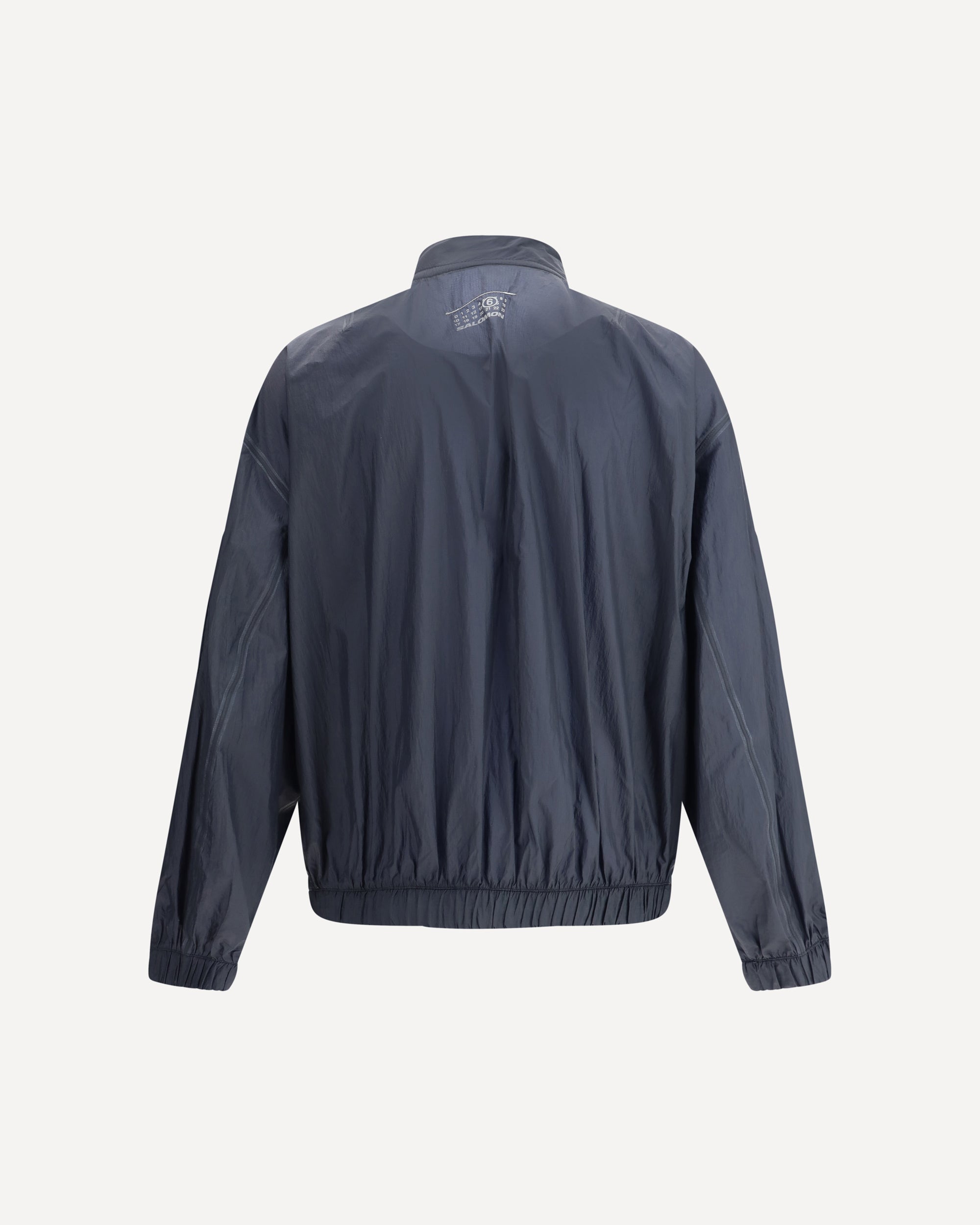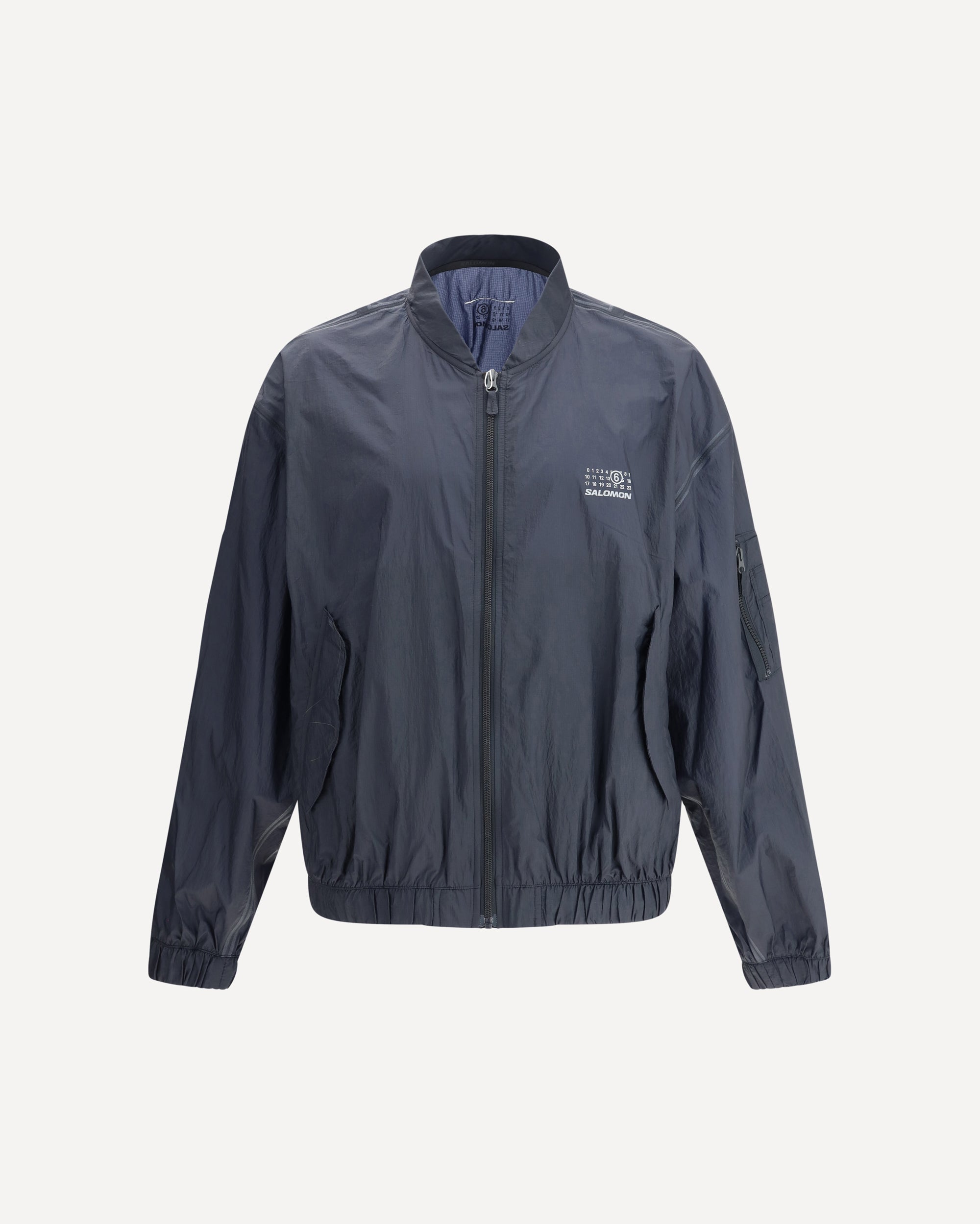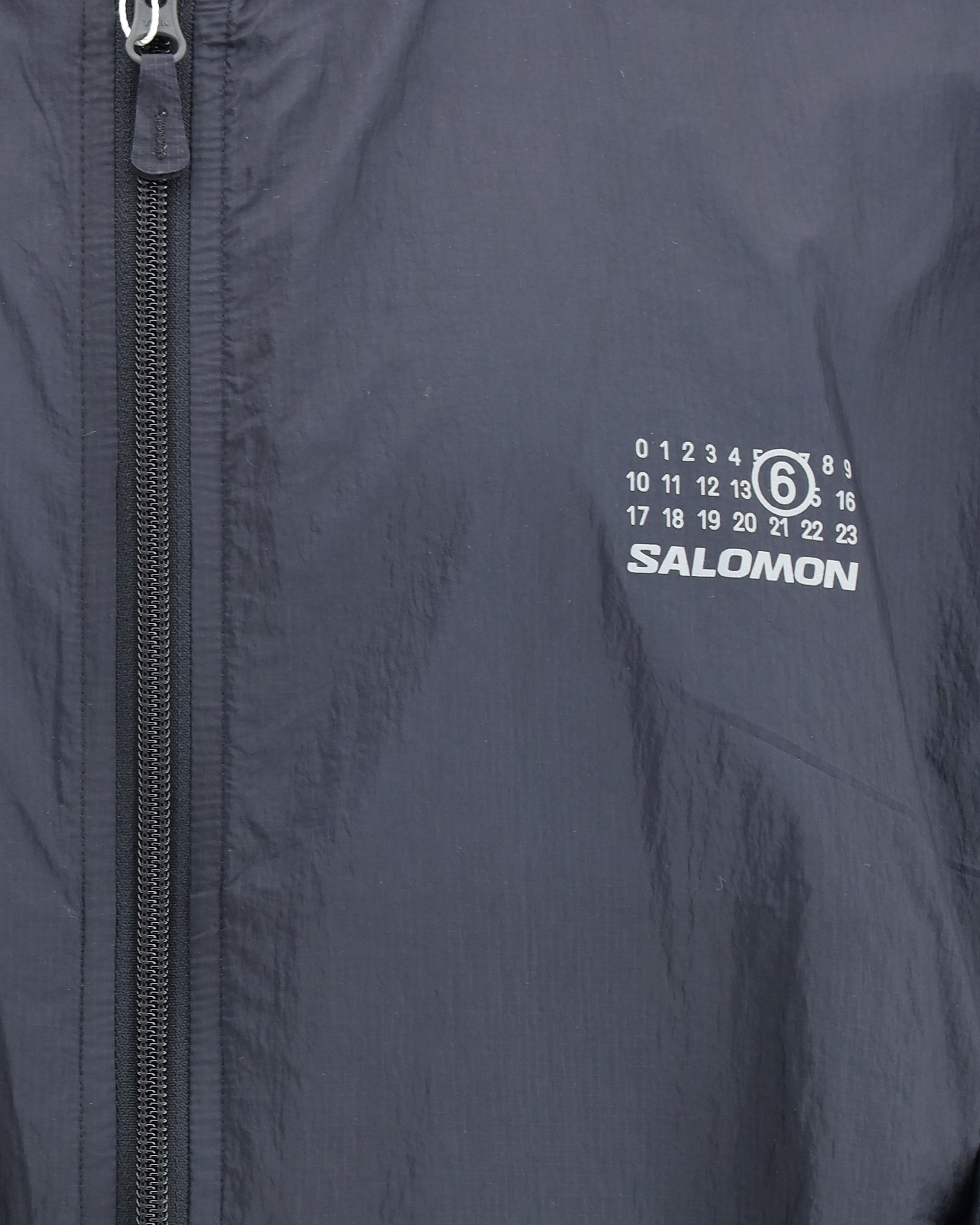 MM6 x Salomon Waterproof Jacket in a technical-urban style, made of waterproof and durable materials. It features a front zipper closure, two side welt pockets with flaps, and a vertical zippered patch pocket on the left sleeve. The cuffs and hem are elasticized for a comfortable and functional fit. Completing the design is the iconic monogram printed in contrast on the front for a distinctive and contemporary touch.