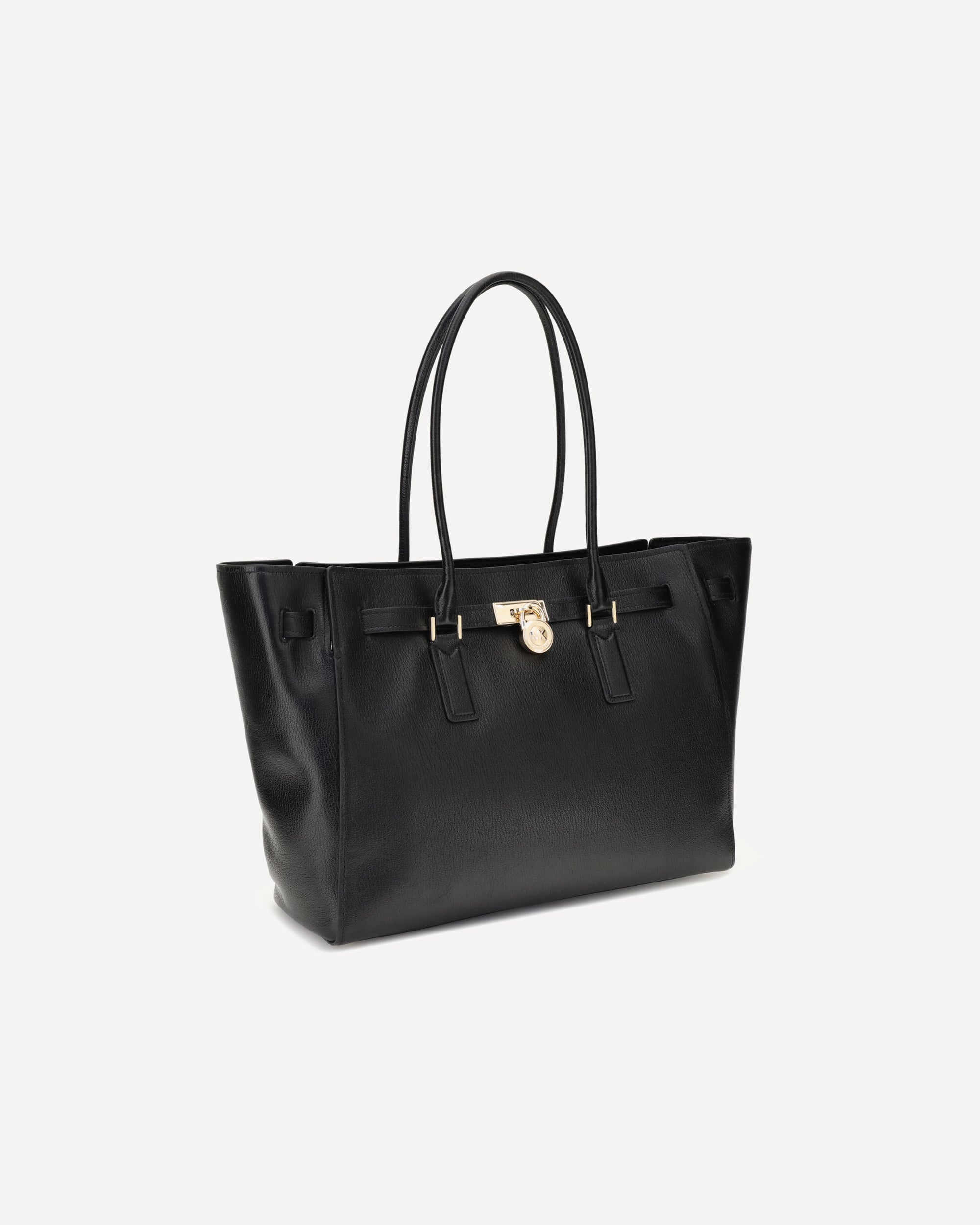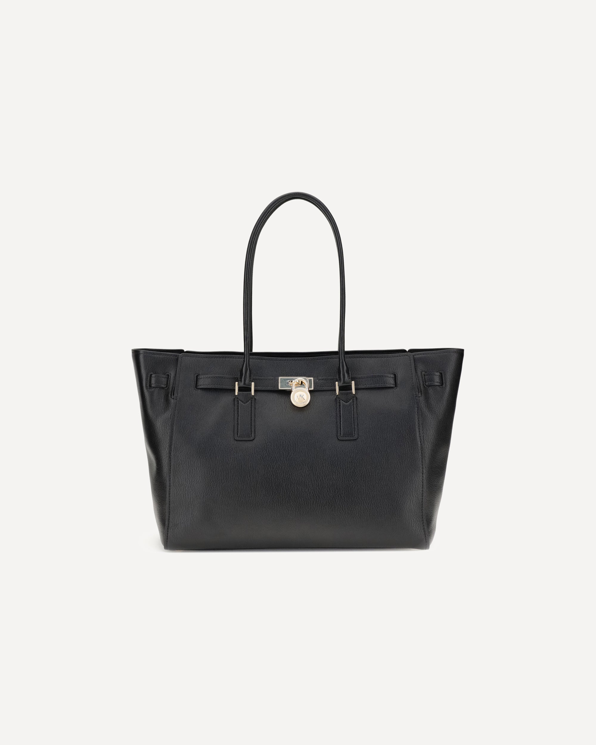 The Hamilton Moderne large Tote Bag by Michael Kors is a roomy, structured model designed to combine functionality and elegance. The silhouette with decorative belt and iconic padlock pendant define its sophisticated style, ideal for everyday use. Featuring a zippered closure, it has an organized interior with a back zippered pocket and two front pouch pockets, perfect for storing laptops, documents and personal items neatly and conveniently.