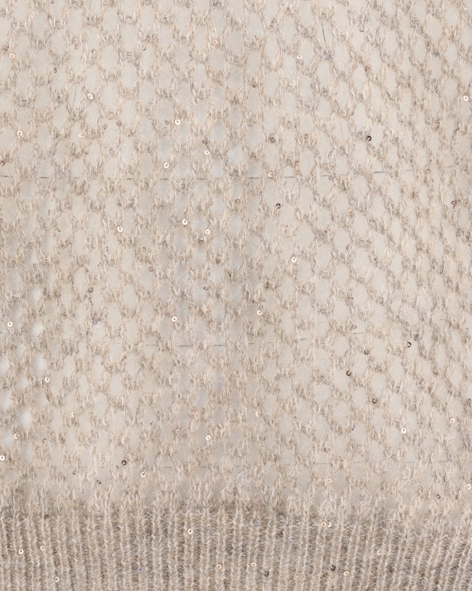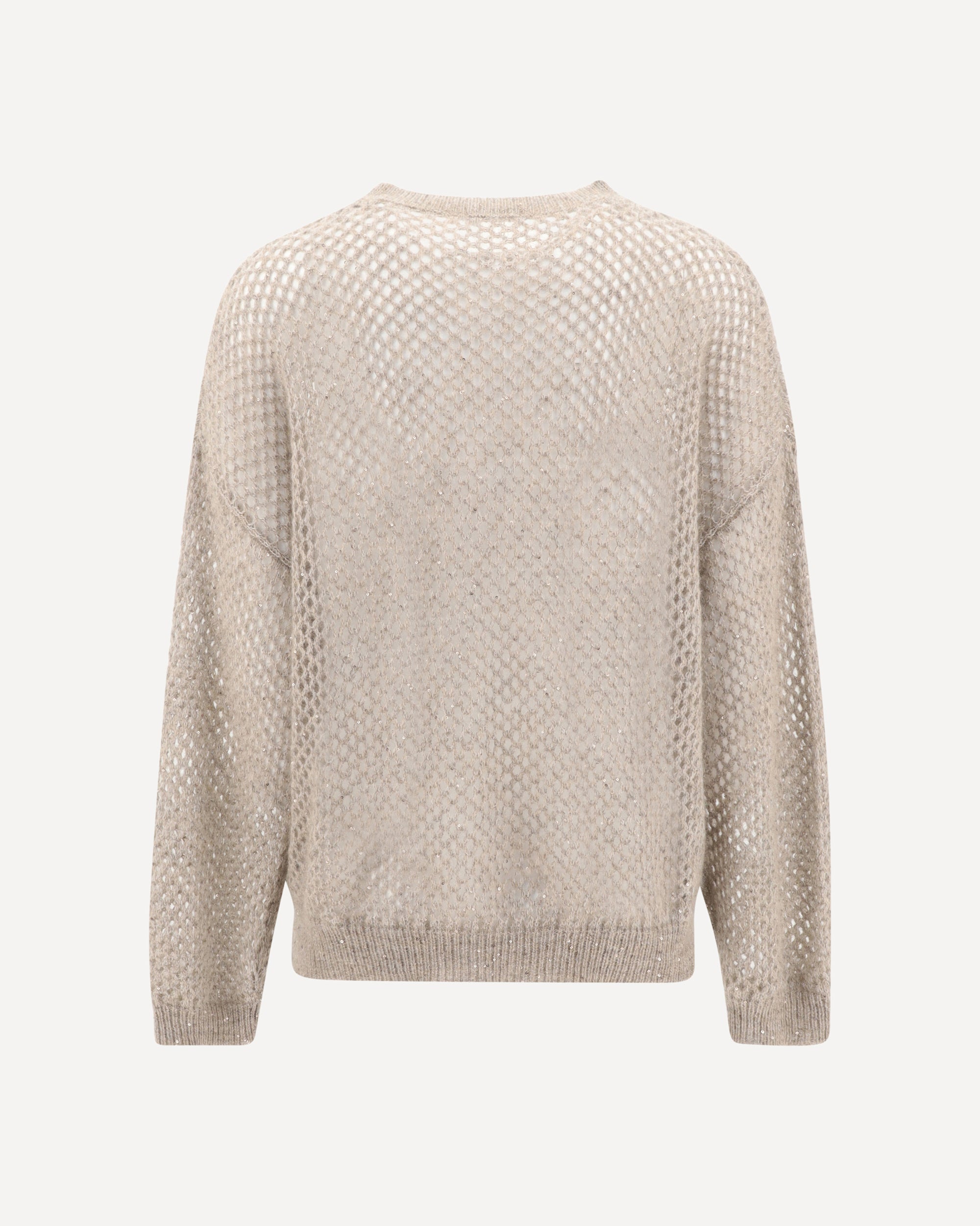 Brunello Cucinelli's mohair Sweater is a refined and delicate piece, featuring a perforated knit texture that lends lightness and a touch of elegance. The ribbed crew neck, along with the ribbed cuffs and hem, adds a timeless style detail, while the sequin embellishes the fabric with a bright and sophisticated effect. The combination of mohair and sequins makes this sweater ideal for a chic and modern look, perfect for dressy occasions but also for adding a special touch to a casual outfit.