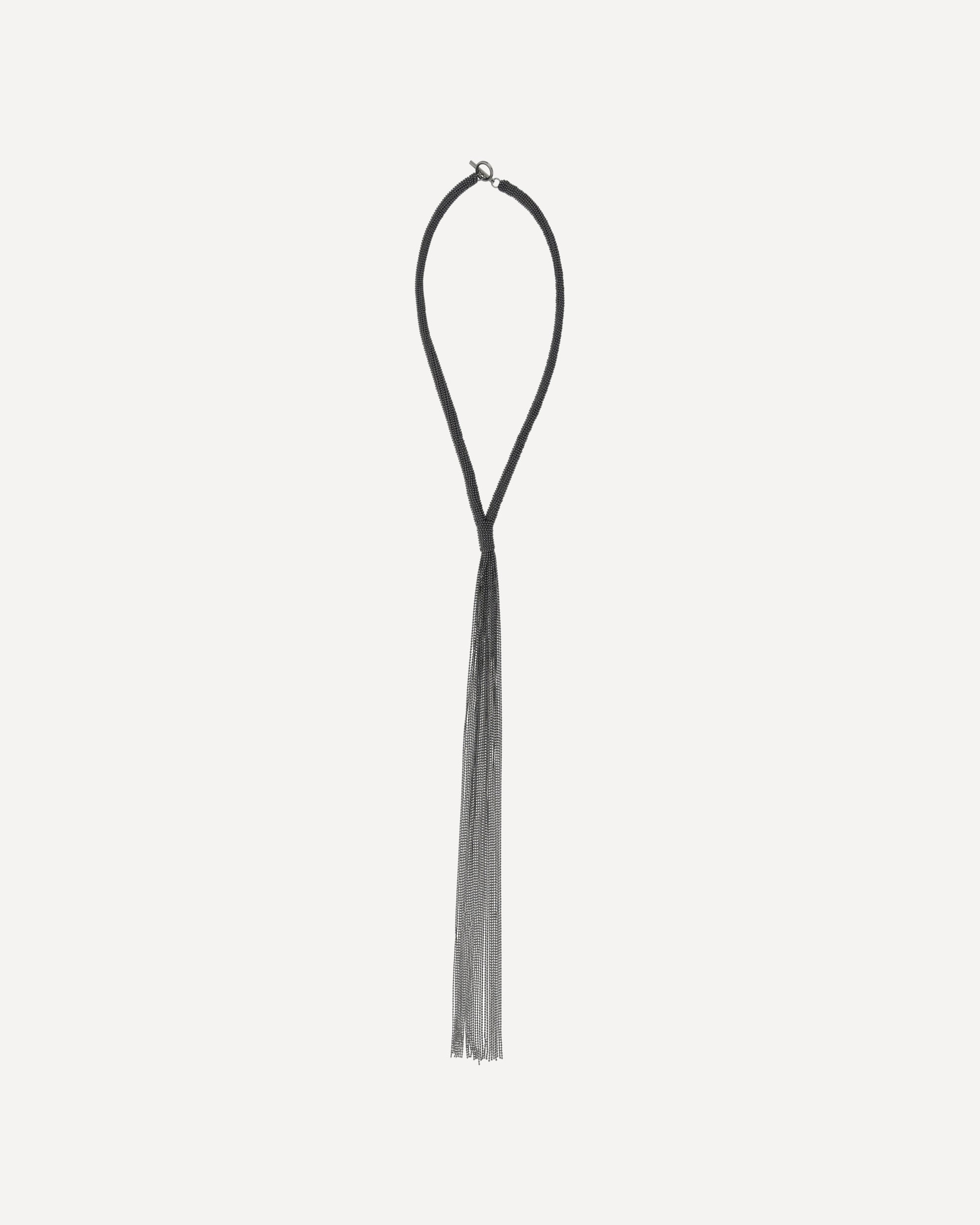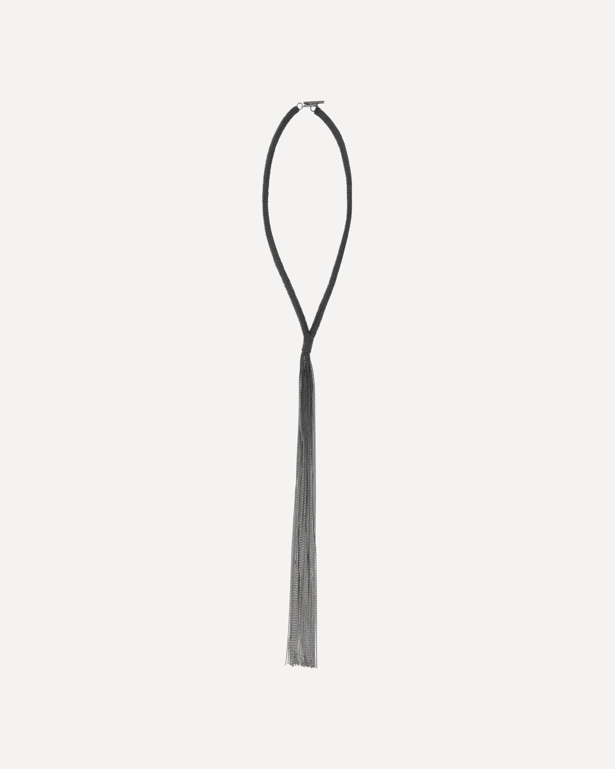 Monile Necklace by Brunello Cucinelli, dangling bangs with jewels on the front, interlocking T clasp.