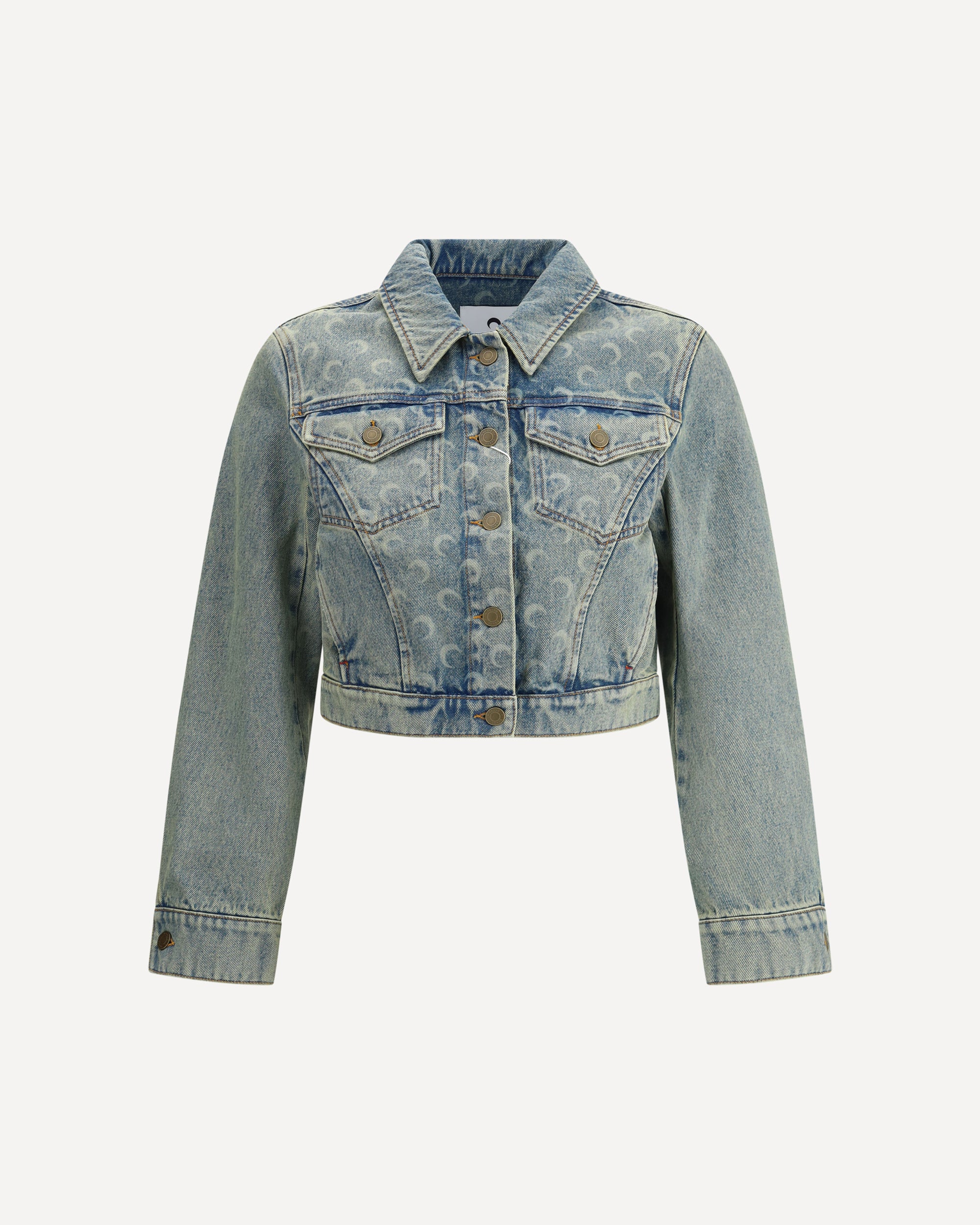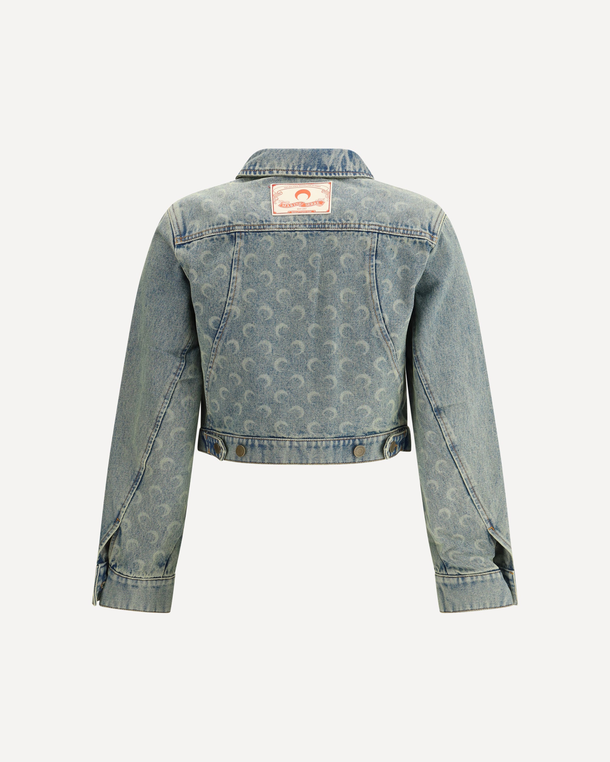 The Marine Serre Moon Denim Jacket features a classic collar and a front button closure, maintaining a clean and sophisticated design. The cropped model offers a modern and versatile fit, while the two side welt pockets and the two patch pockets on the front add practicality and style. The brand's iconic Moon pattern decorates the entire garment, giving it a distinctive and recognizable touch. The leather patch with the brand's logo on the back completes the design, making this jacket a unique and trendy piece.