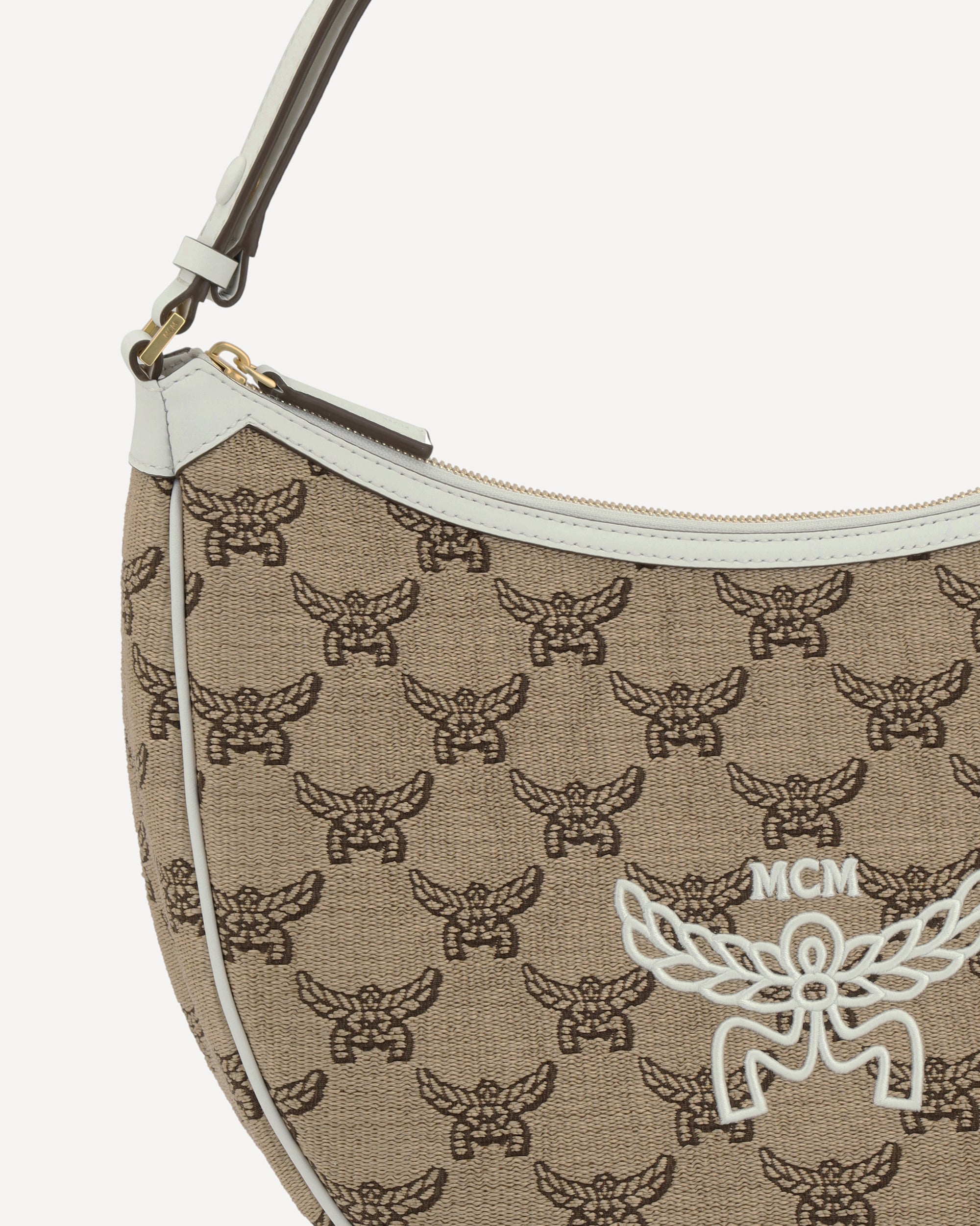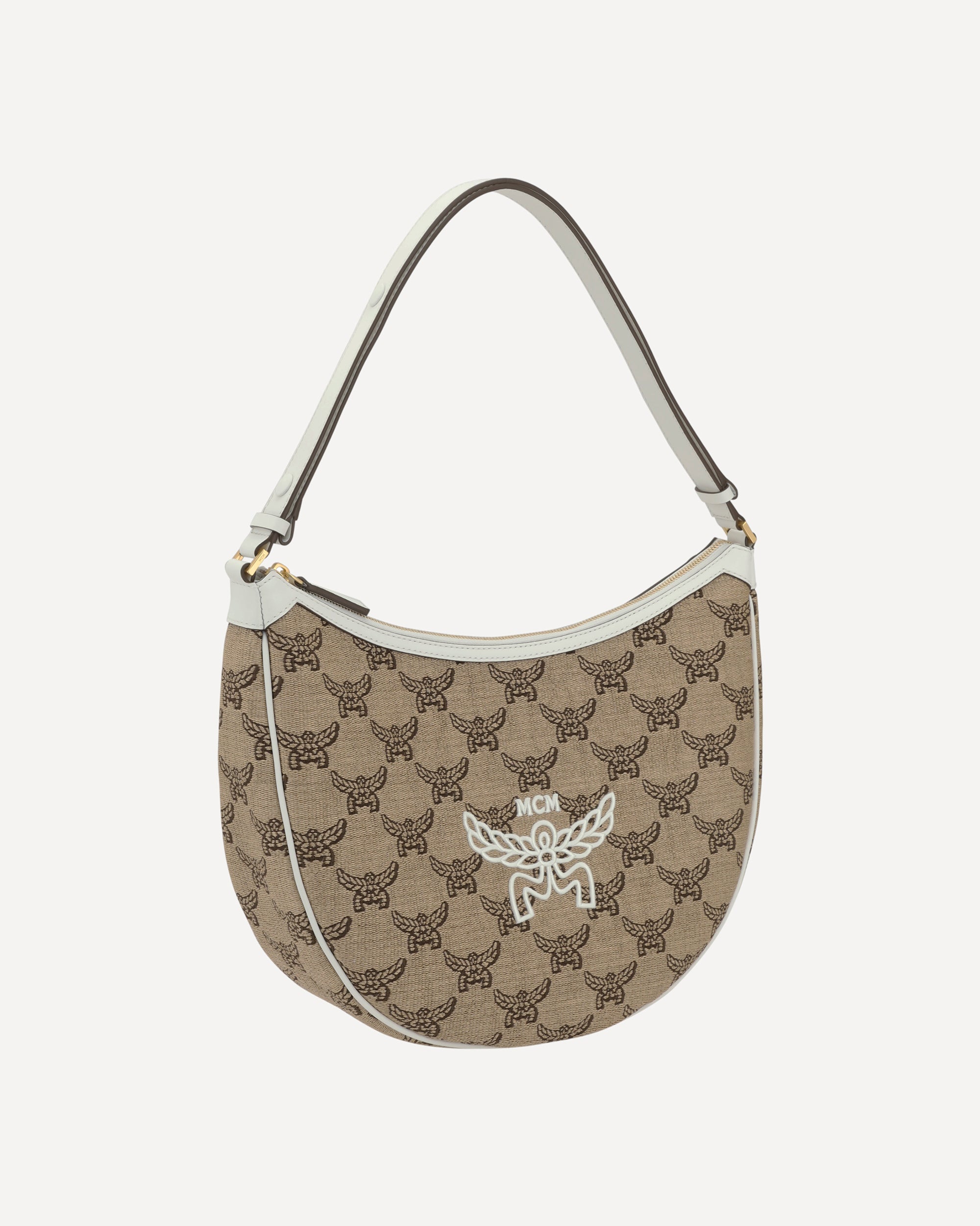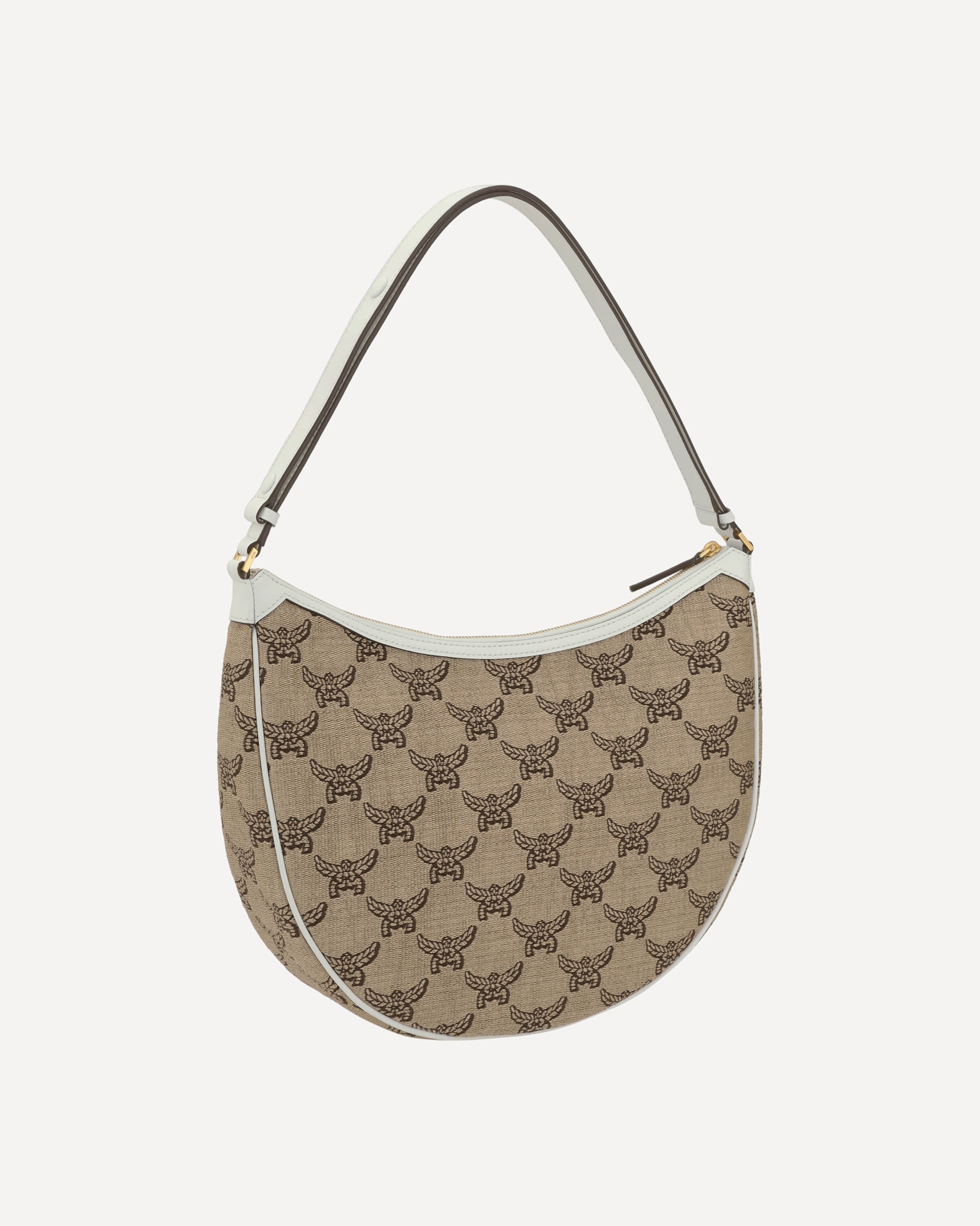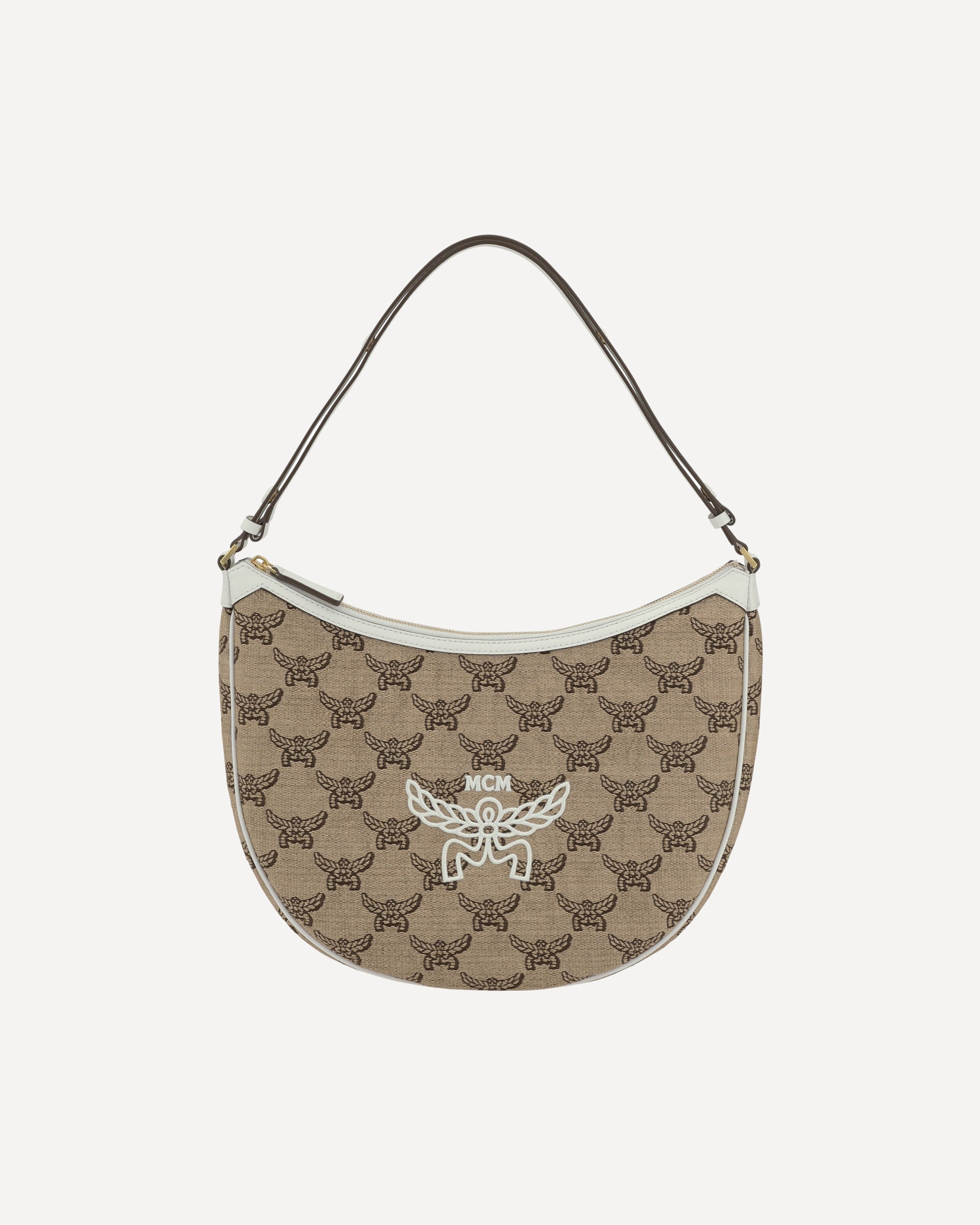 MCM's Moon Shoulder Bag combines elegance and practicality with a raffia half-moon design perfect for the summer season. Featuring a flat handle for comfortable carry, it has a top zipper closure for added security. The brand's iconic all-over printed logo adds a distinctive and recognizable touch. A versatile and trendy accessory, ideal for those seeking a casual yet sophisticated style.