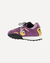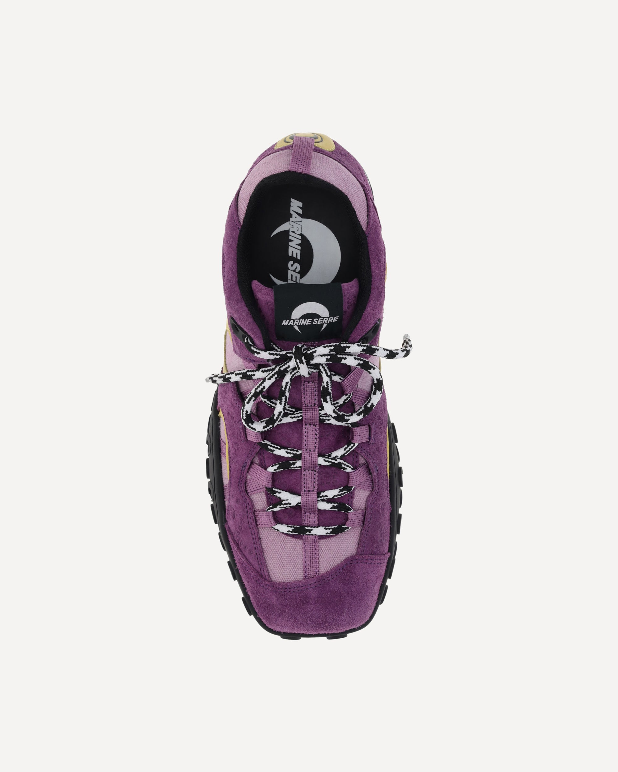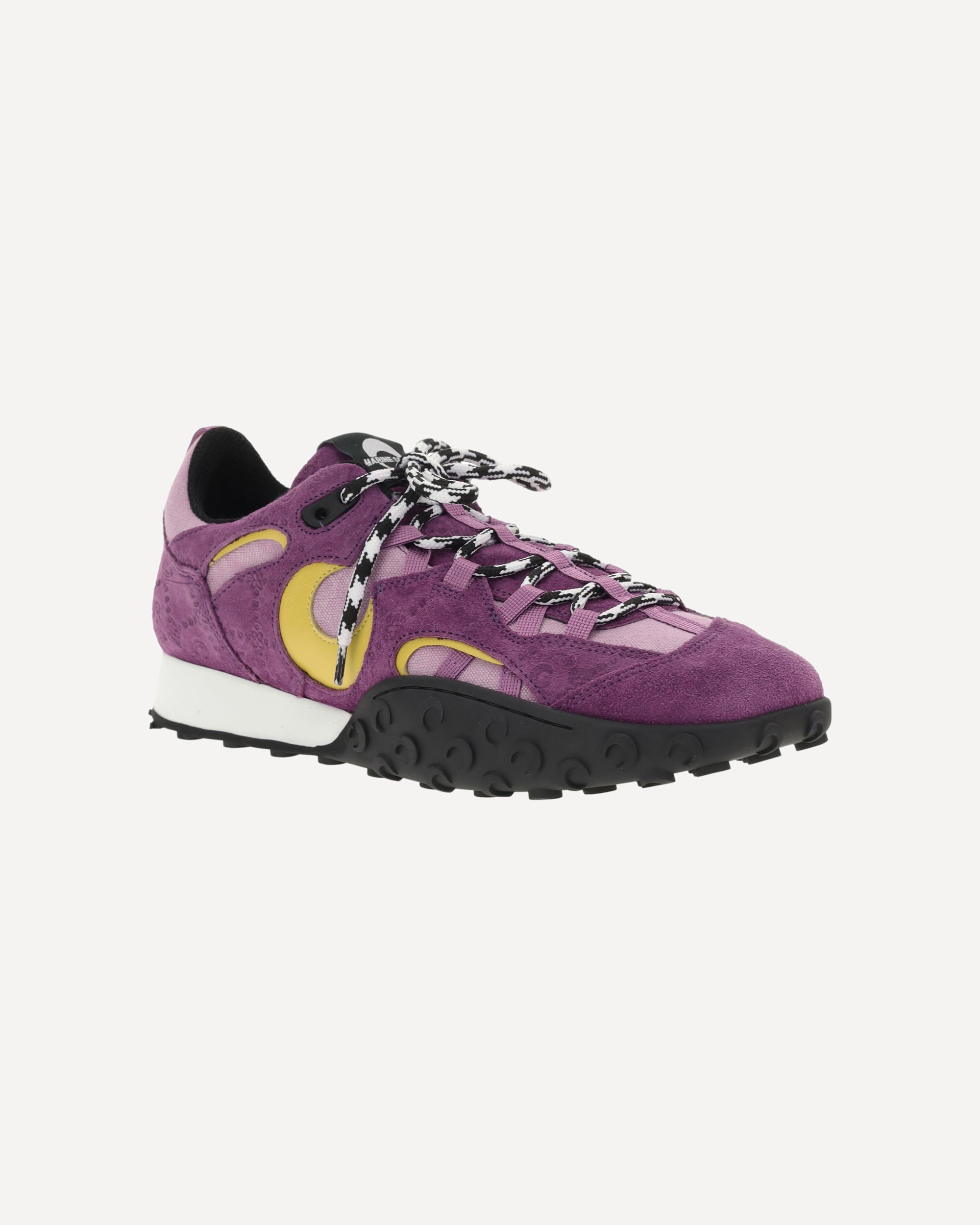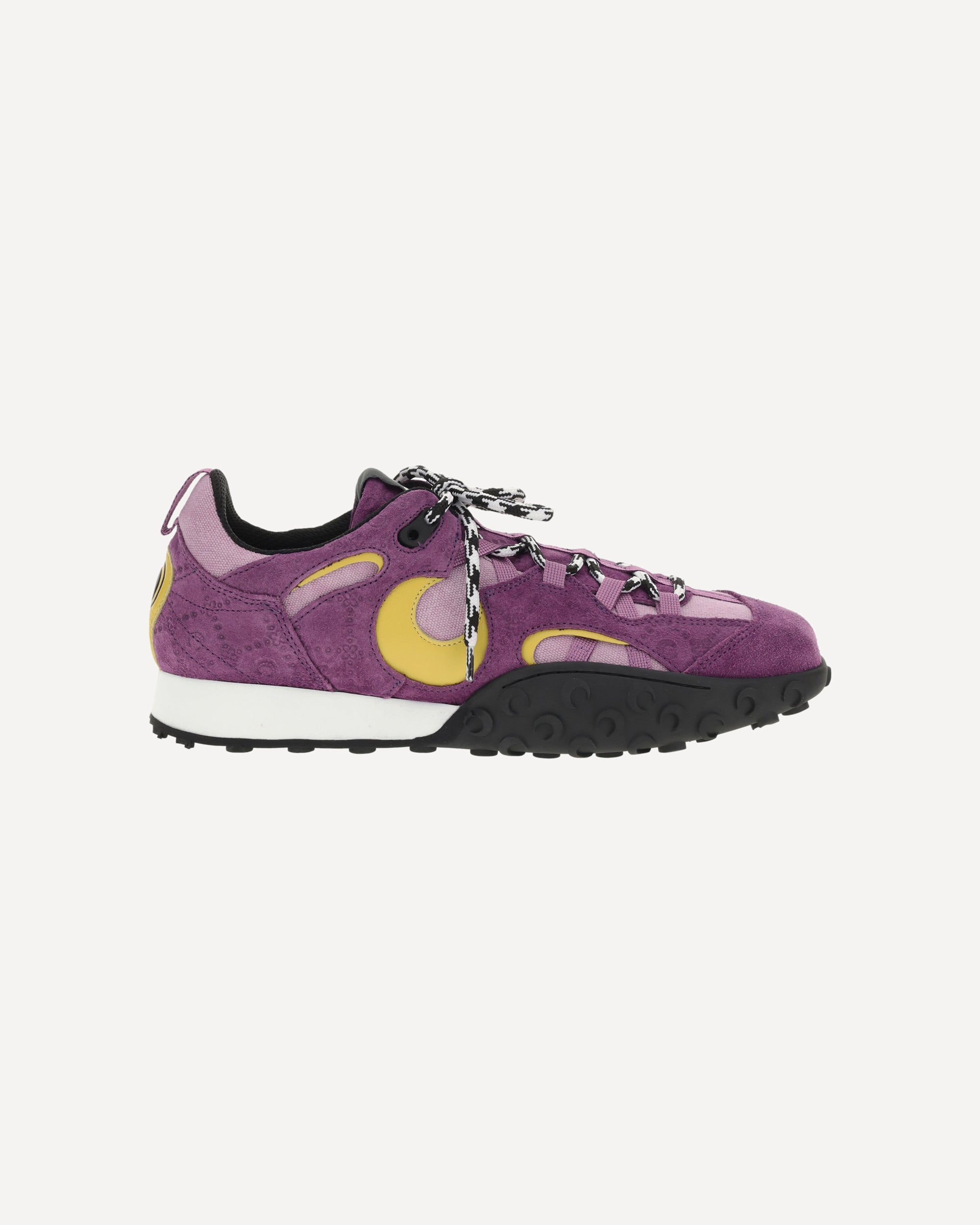 The MS Rise II Sneakers by Marine Serre feature a paneled suede upper that combines elegance and comfort. The upper lace-up closure and square toe give a bold, modern look, while the rubber sole, with a pattern that recalls the brand's iconic moon, adds a distinctive touch. The pull on back and half-moon leather detail complete the design, making these sneakers a perfect mix of style and functionality.