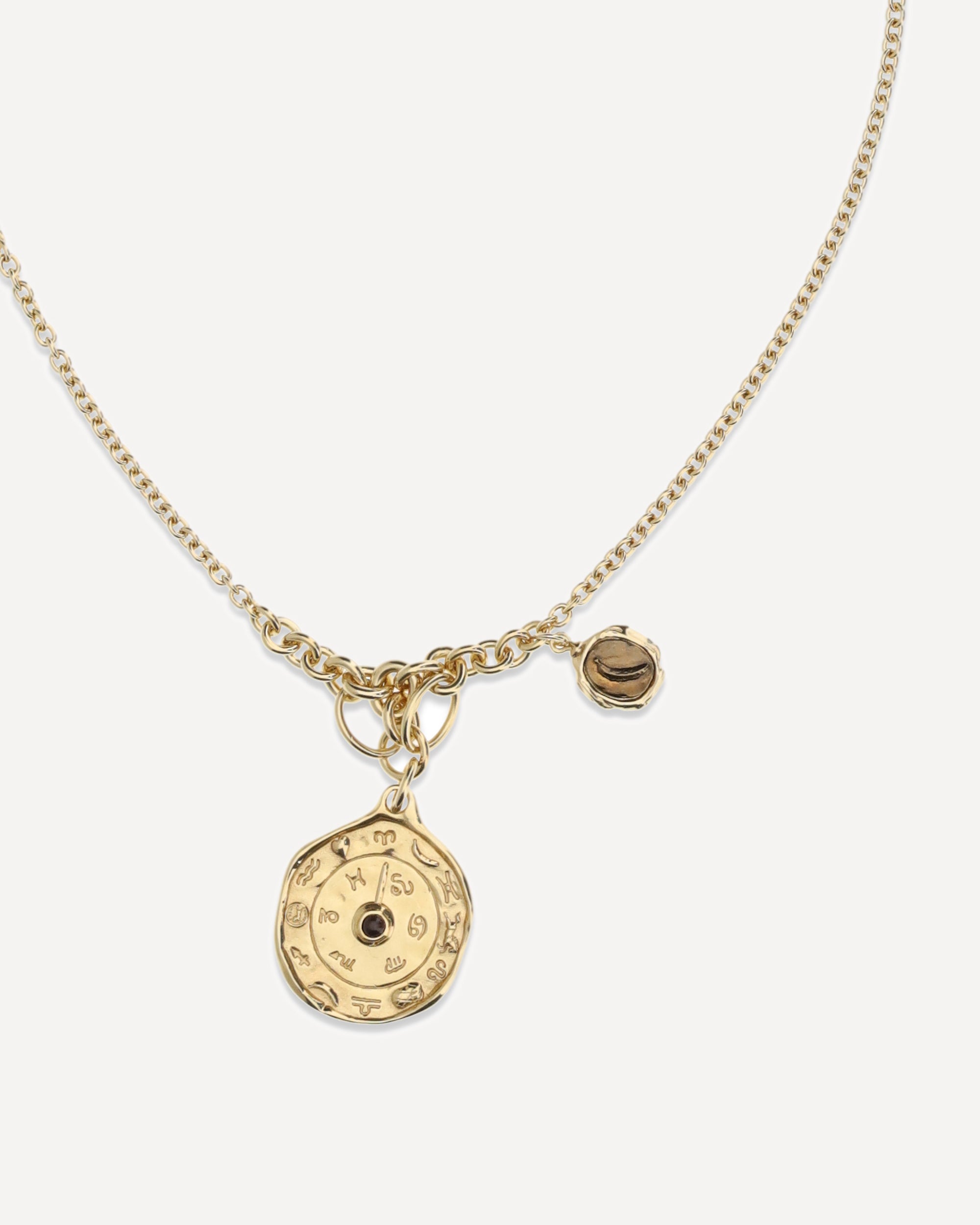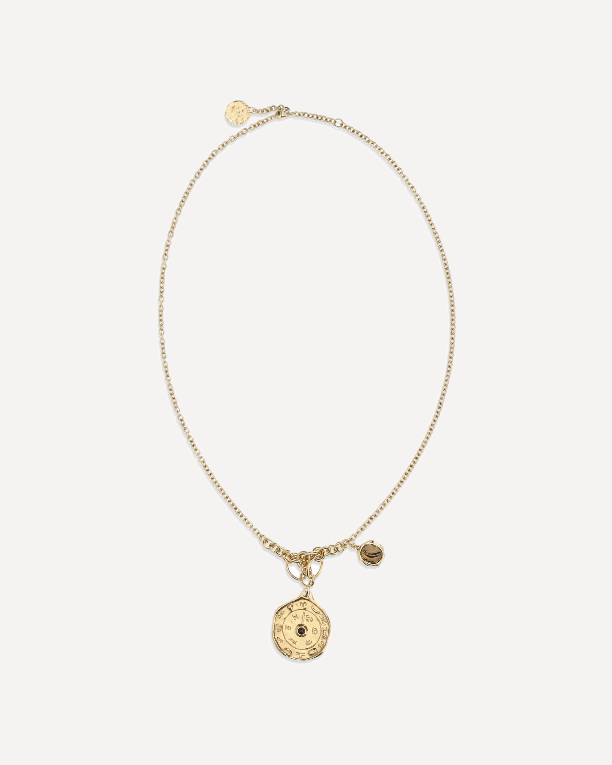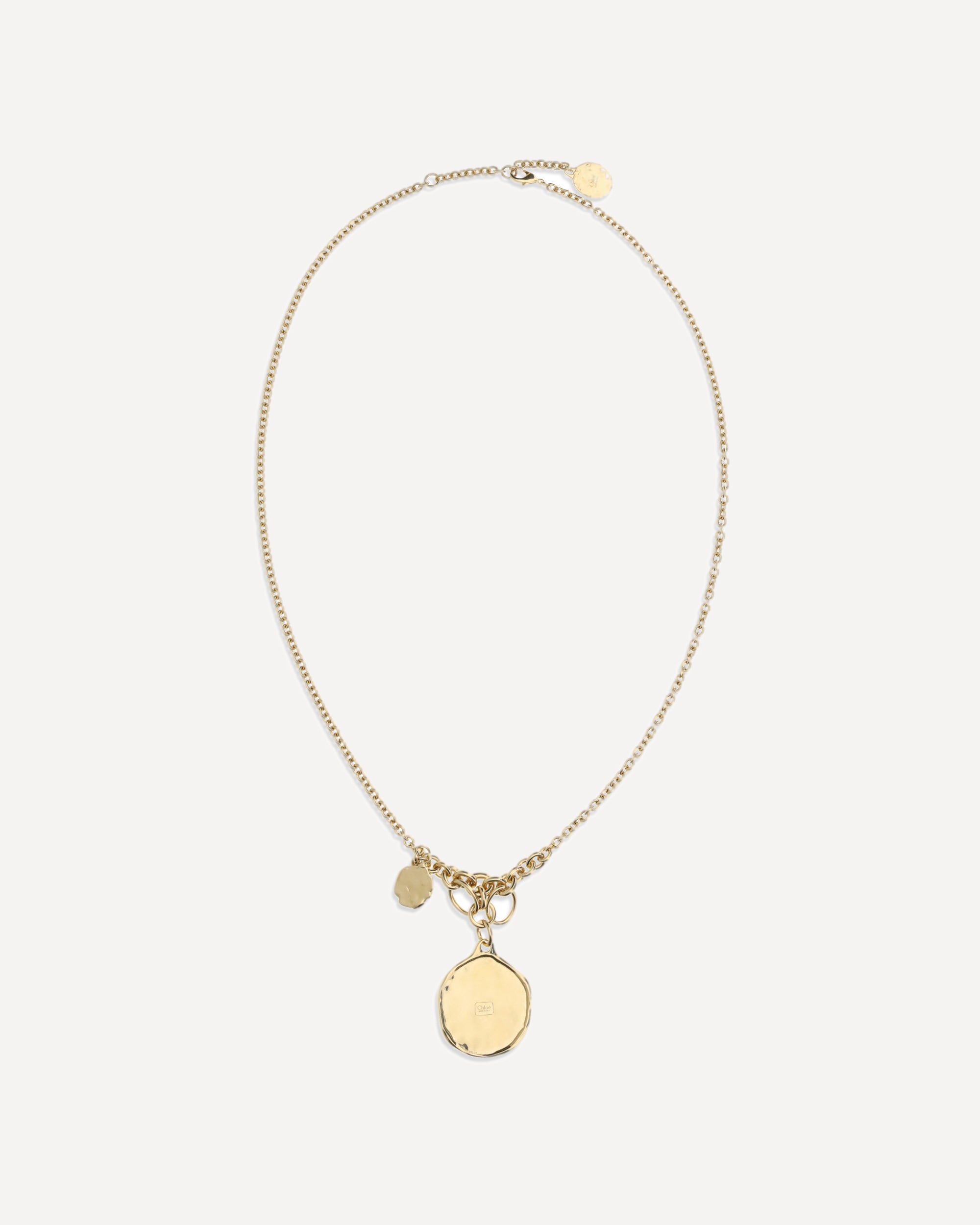 The Medals Pendant Necklace by Chloé combines style and personality with a distinctive design. Made of brass and embellished with a brecciated red jasper pendant, it is adjustable to fit perfectly around the neck. The Chloé logo is engraved on the back of the central medal, while a metal plaque adds further brand detail. The rotating tip allows you to indicate your zodiac sign, making each piece unique and personal.