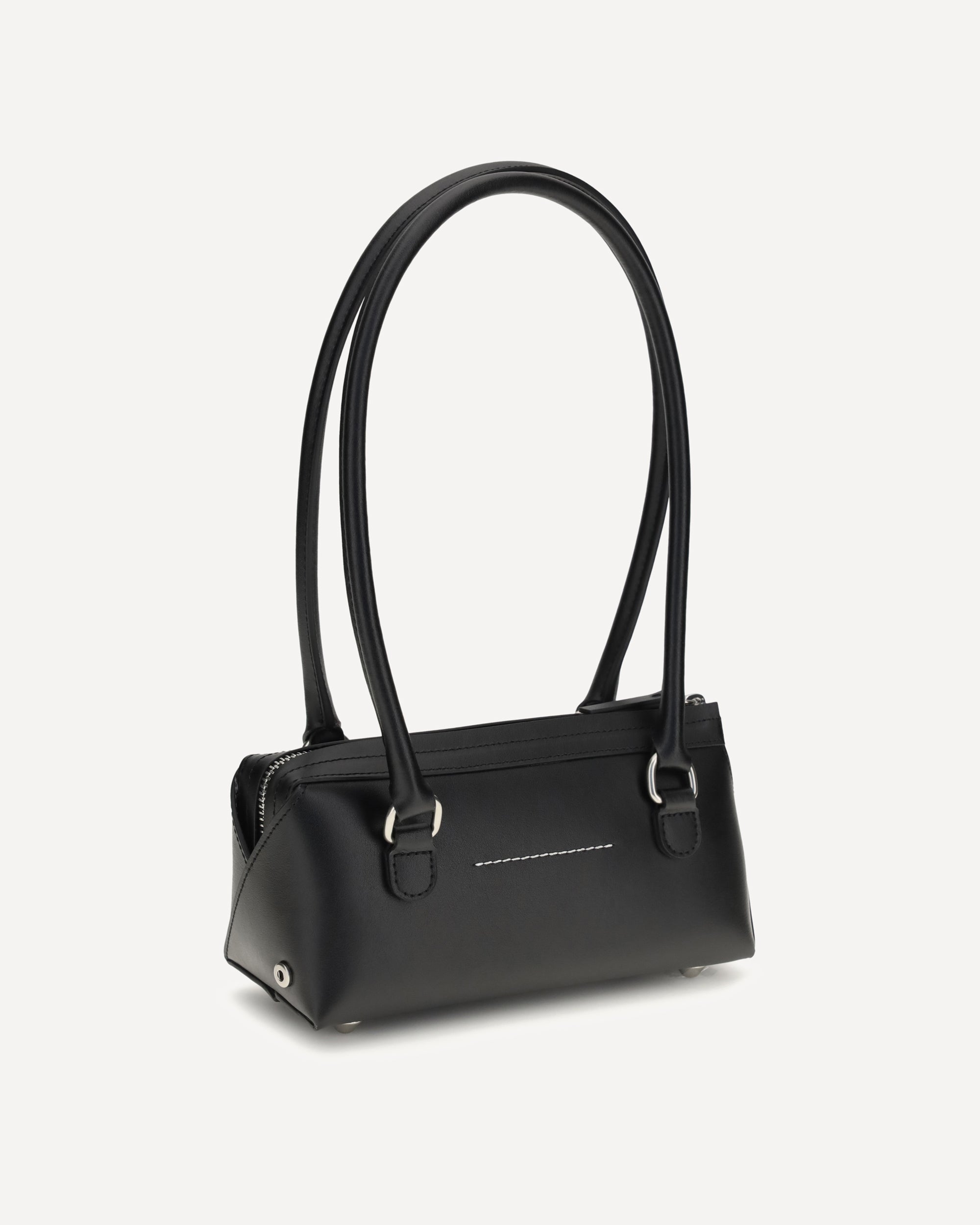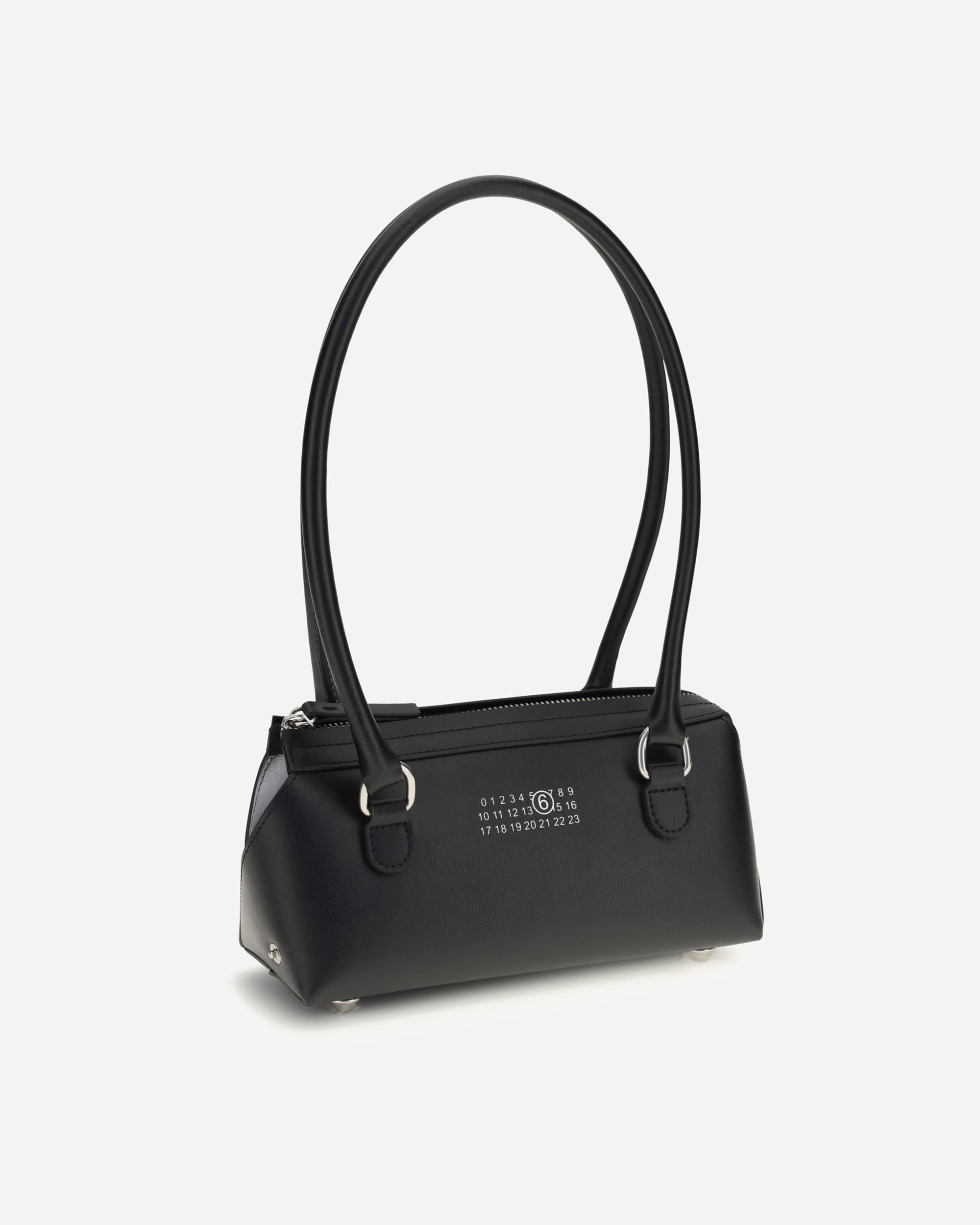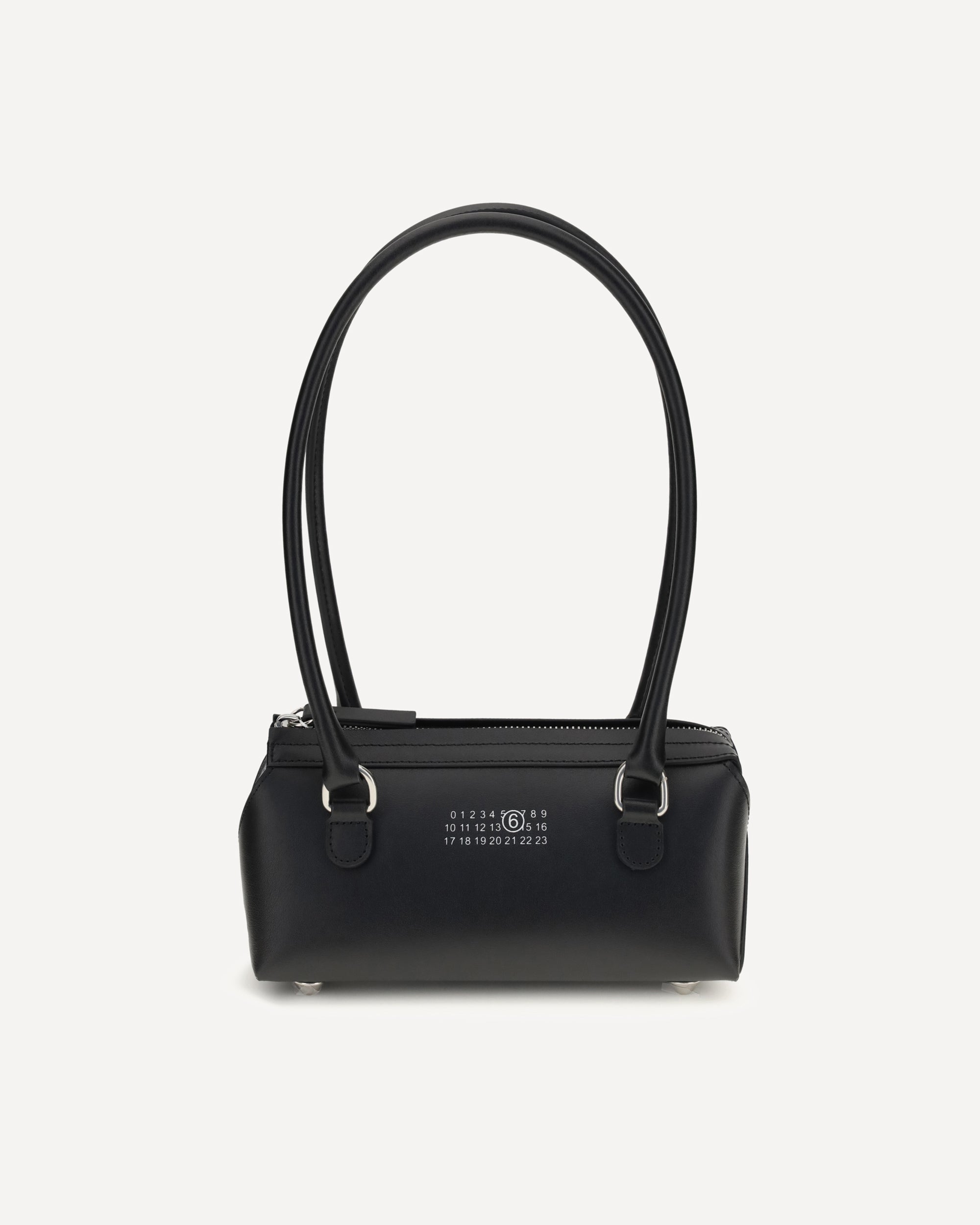 The Bauletto J mini Shoulder Bag in leather by MM6 features a compact silhouette defined by an essential and contemporary line. Crafted from leather, the design is characterized by a duffle-inspired shape that reflects a minimal and functional aesthetic. The zip closure completes the piece with a practical and discreet detail, making it a versatile accessory for everyday use.