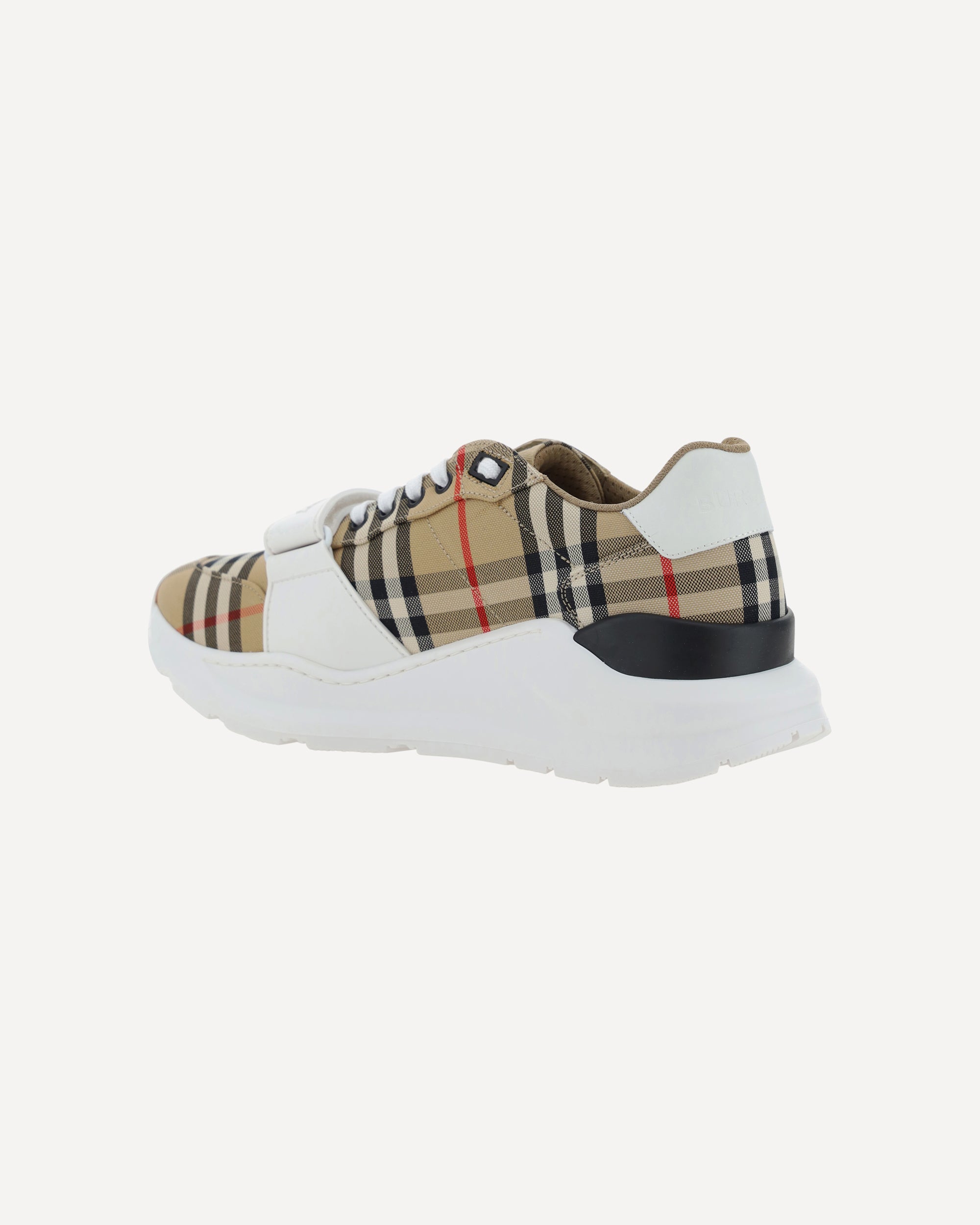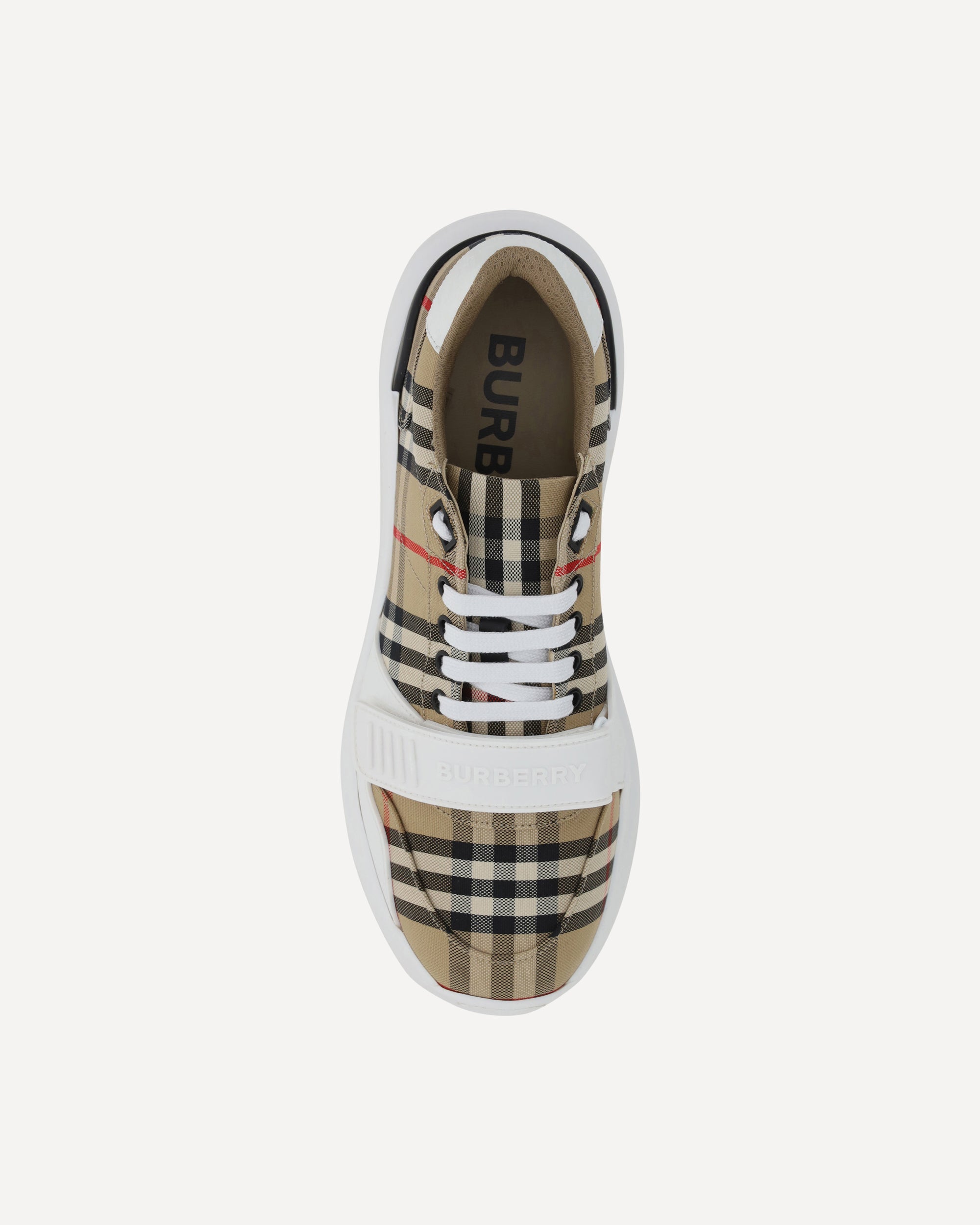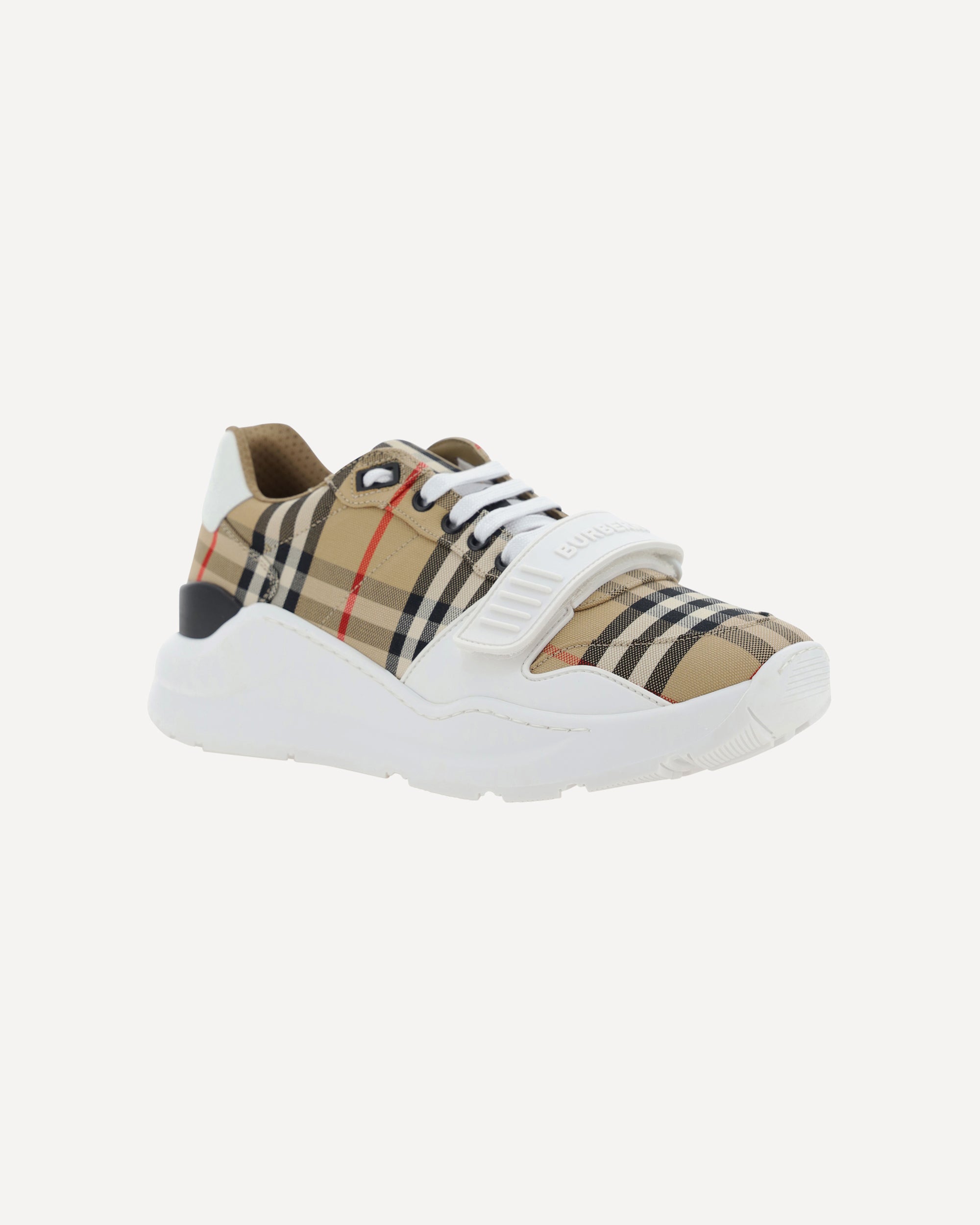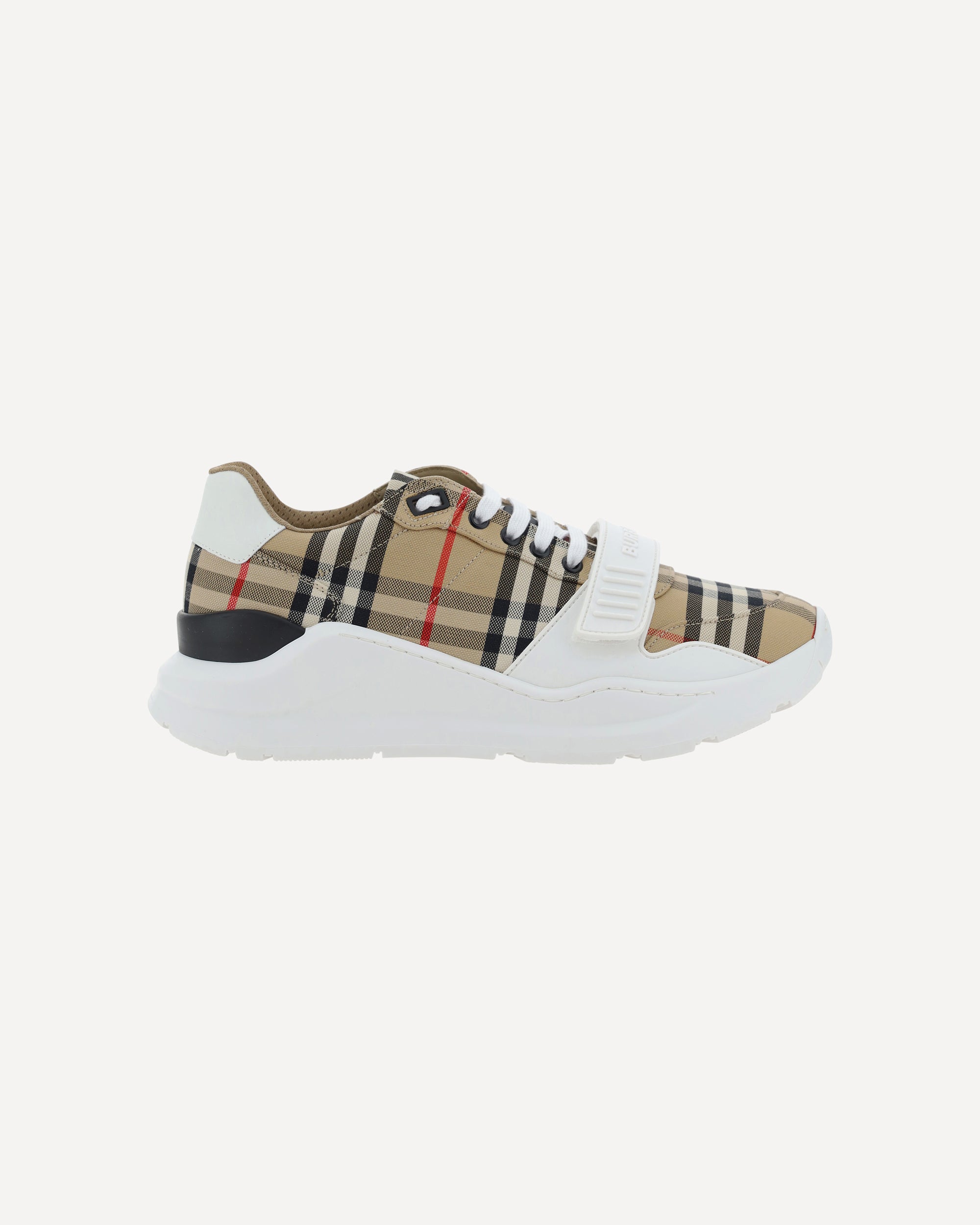 New Regis Sneakers by Burberry, slightly elongated toe, lace-up front closure, Velcro strap detail on front, iconic all-over repeated Check Archive brand pattern, contrasting brand signature on back.