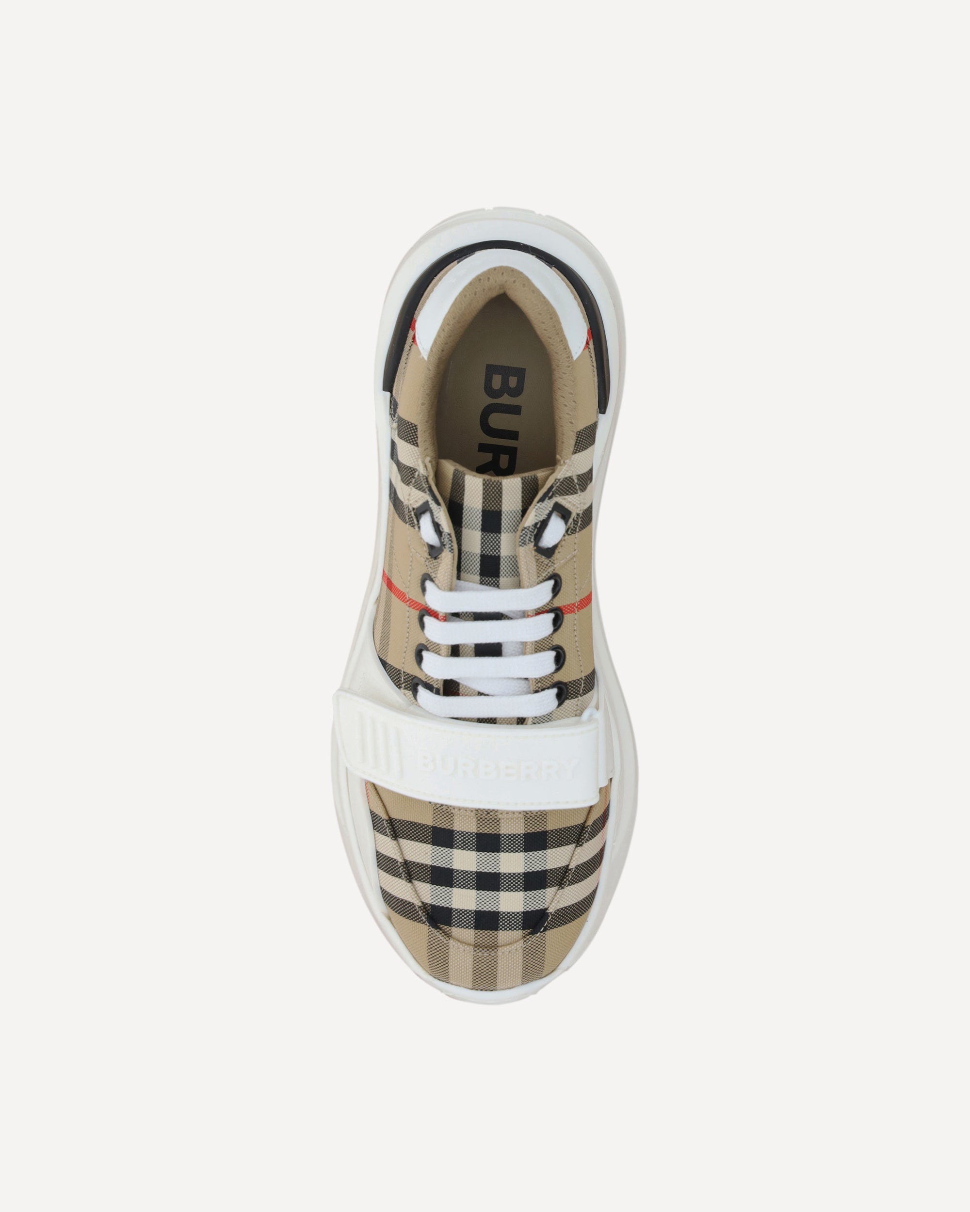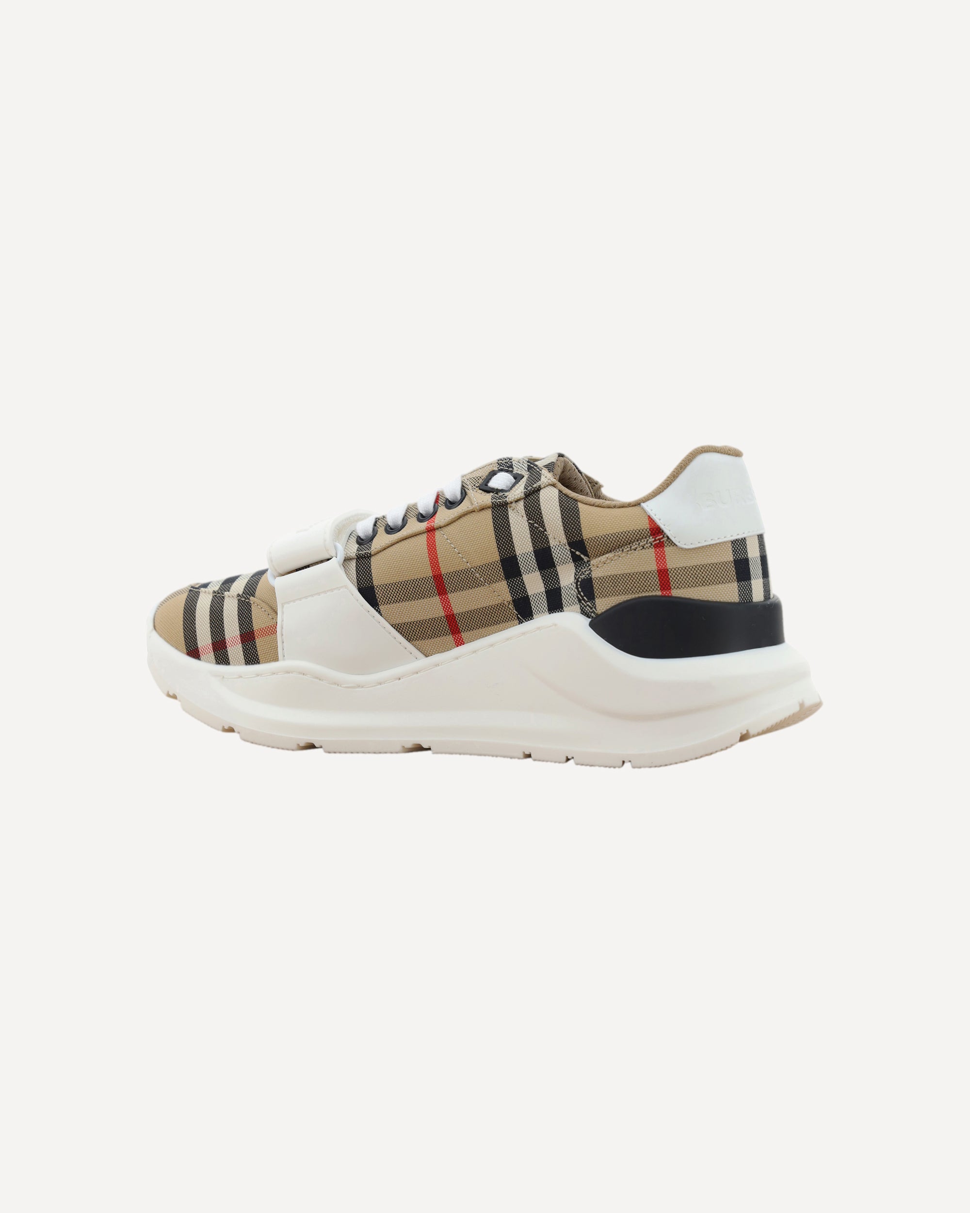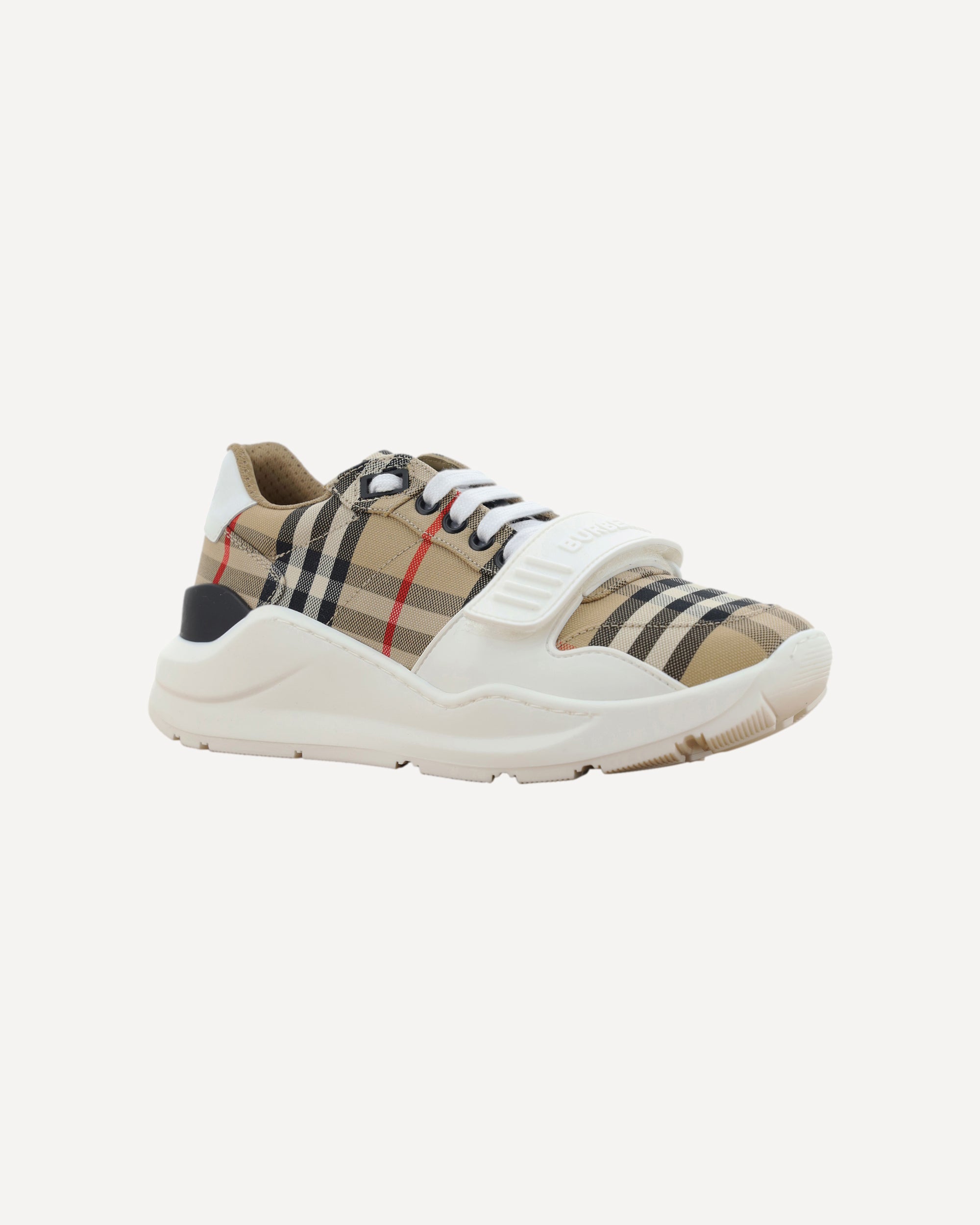 The New Regis Sneakers by Burberry feature a modern silhouette with a slightly elongated toe and lace-up front closure, enhanced by a convenient Velcro strap detail on the front. The iconic Check Archivio pattern wraps the all-over upper, while the brand's contrasting signature on the back adds a distinctive and instantly recognizable touch.
