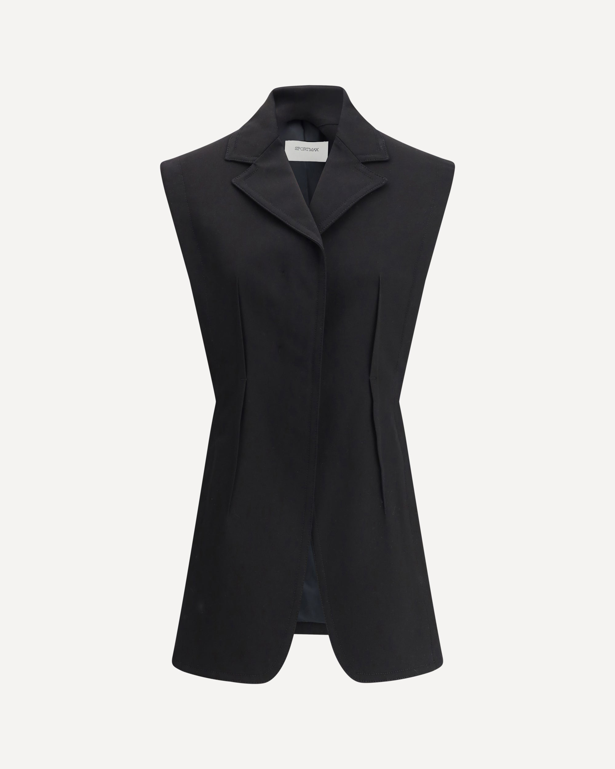 The Max Mara Sportmax Oca Gilet features a concealed button front fastening that adds to its sleek, minimalist design. The thigh-length design offers a long, slender fit, while the notched lapel adds a sophisticated, timeless touch. This gilet is perfect for creating modern, refined looks, easily paired with a variety of outfits, from a jacket to a simple top, for a versatile, classy style.