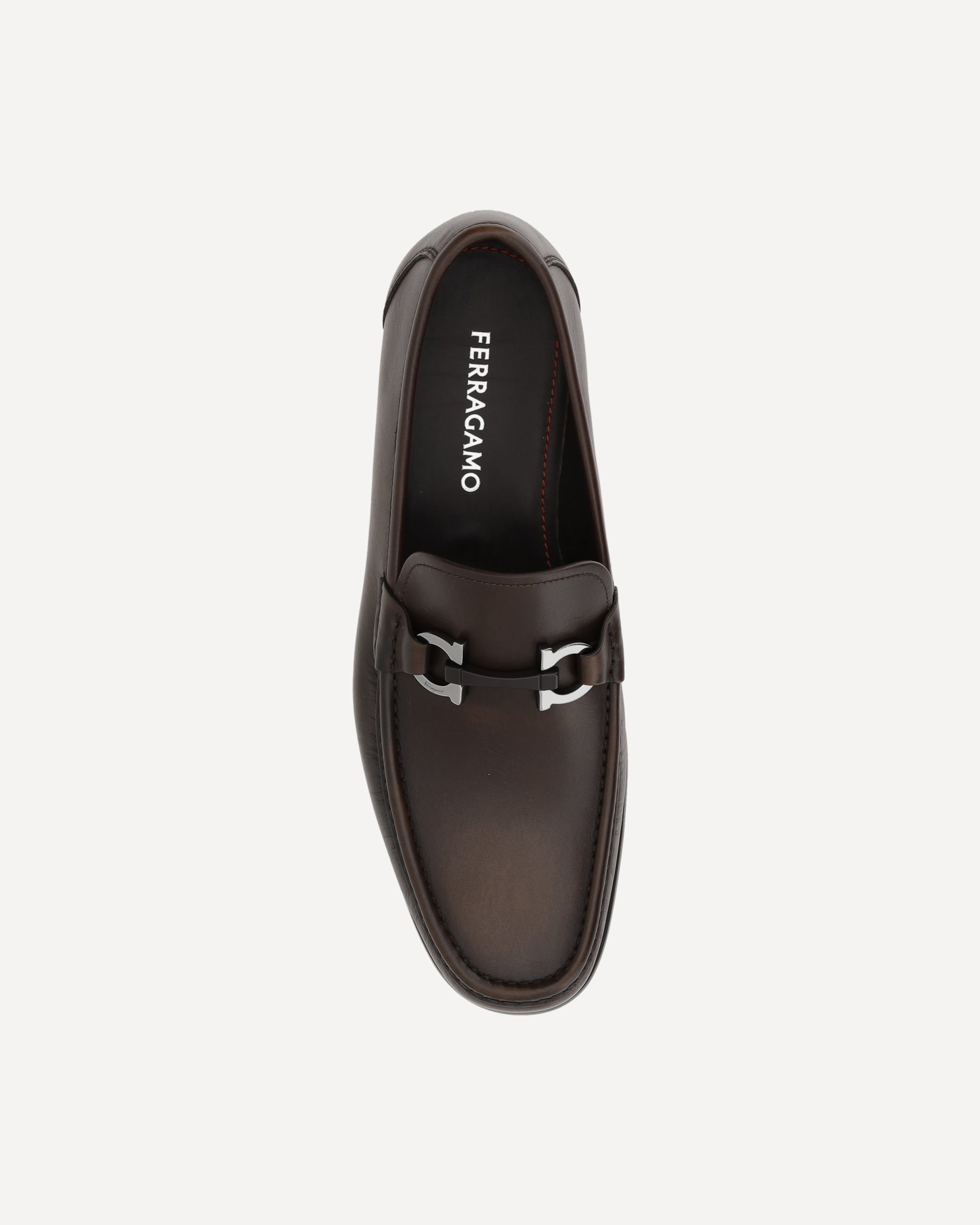 The Ornamento Gancini Loafers by Ferragamo stand out for their tapered line and elegant details. The painted clamp and the shiny metal Gancini details add a sophisticated touch to the design. Made of hand-buffered calfskin, they offer a unique chromatic depth. The Tubular construction guarantees softness and lightness, while the manual stitching of the upper, typical of luxury shoes, makes this model even more refined and precious.