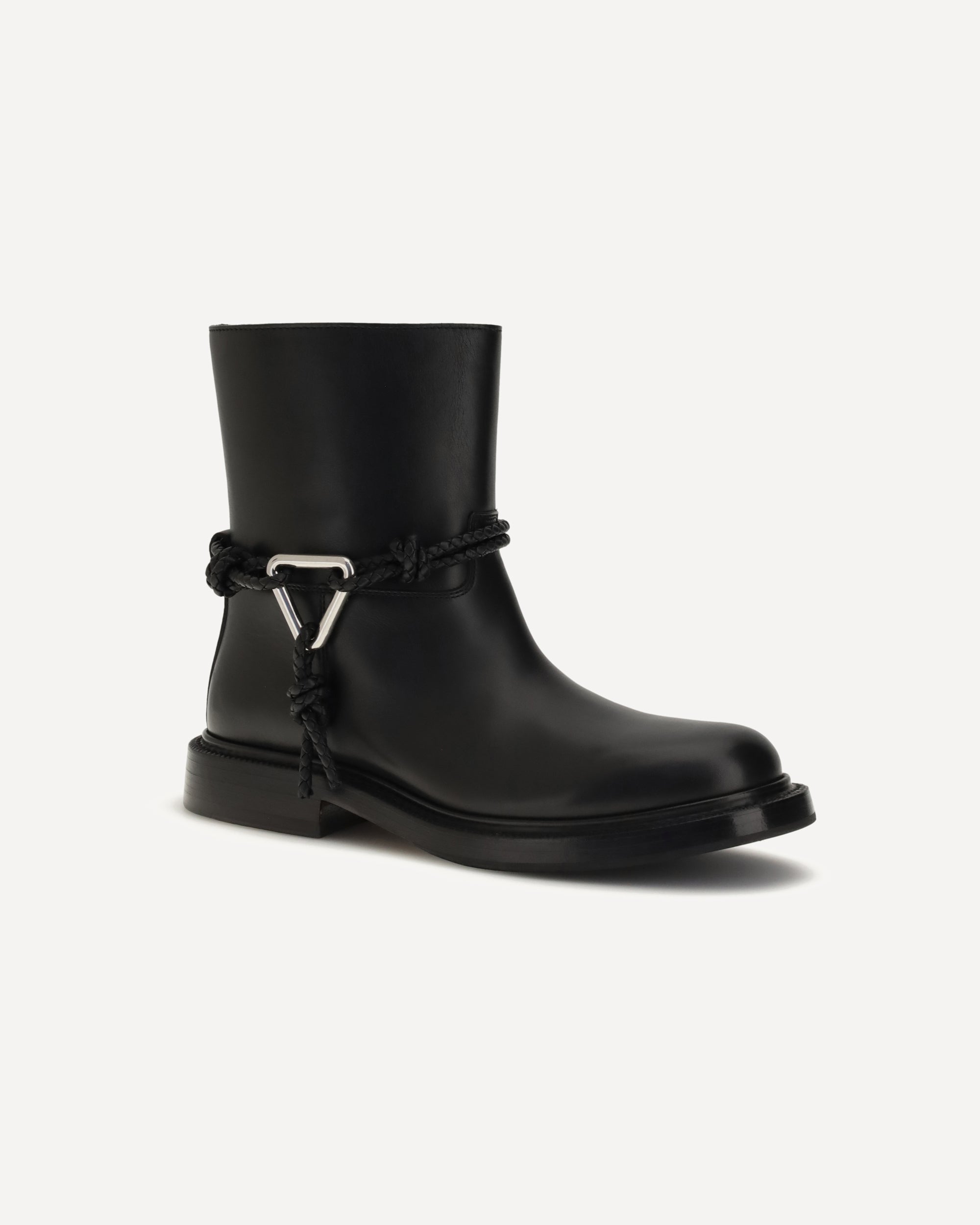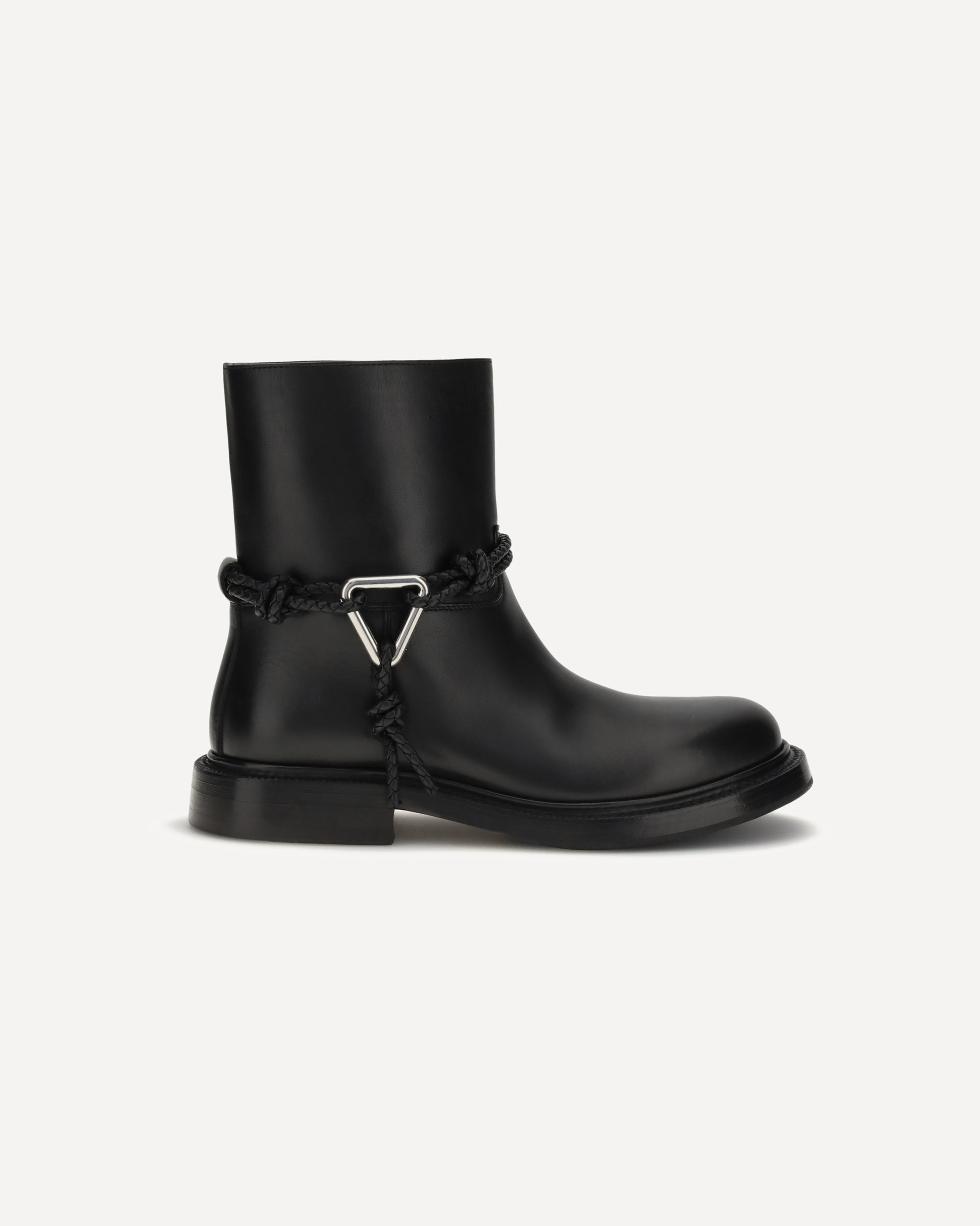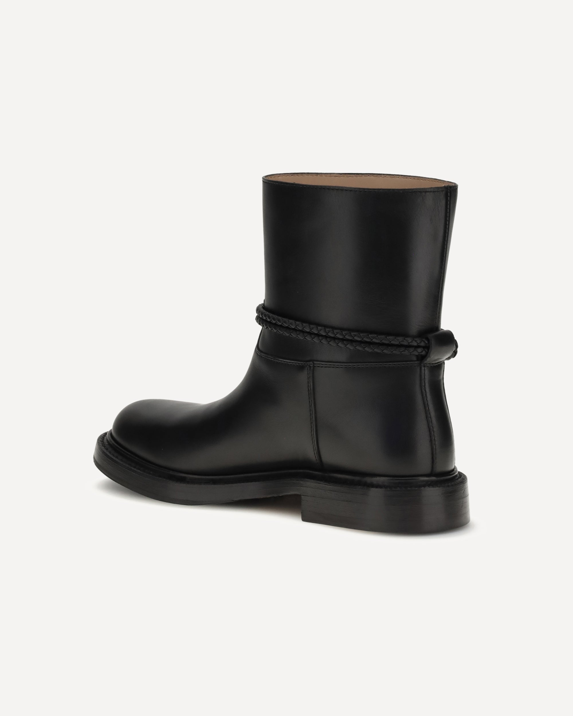These Leather Ankle Boots by Bottega Veneta feature a round toe, a braided leather strap with silver-tone hardware, and a low heel. The slip-on design ensures practicality and comfort.