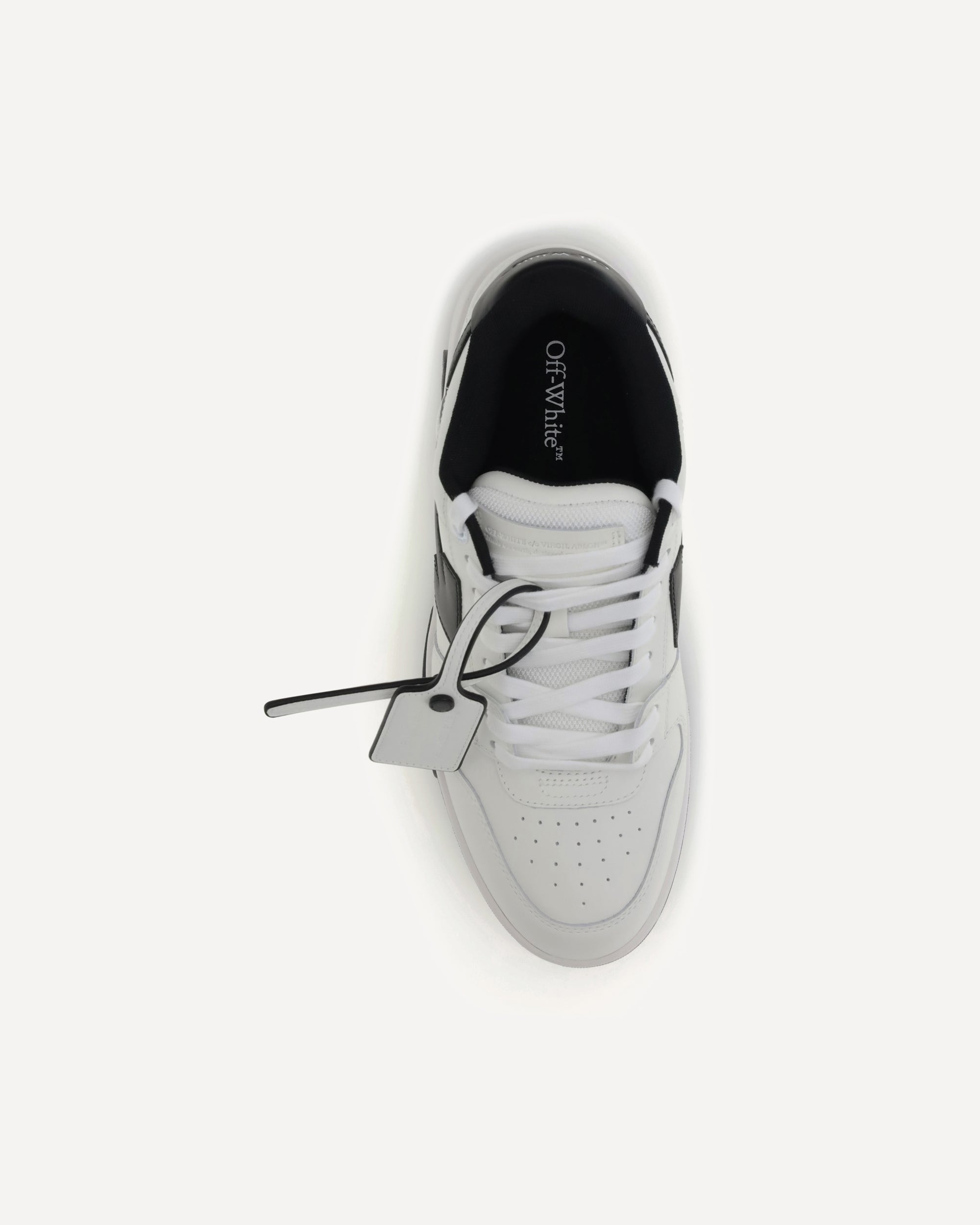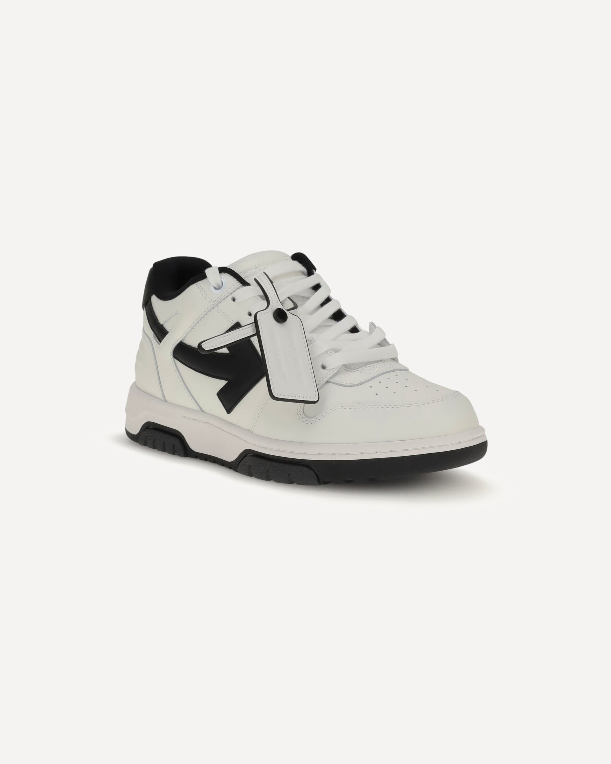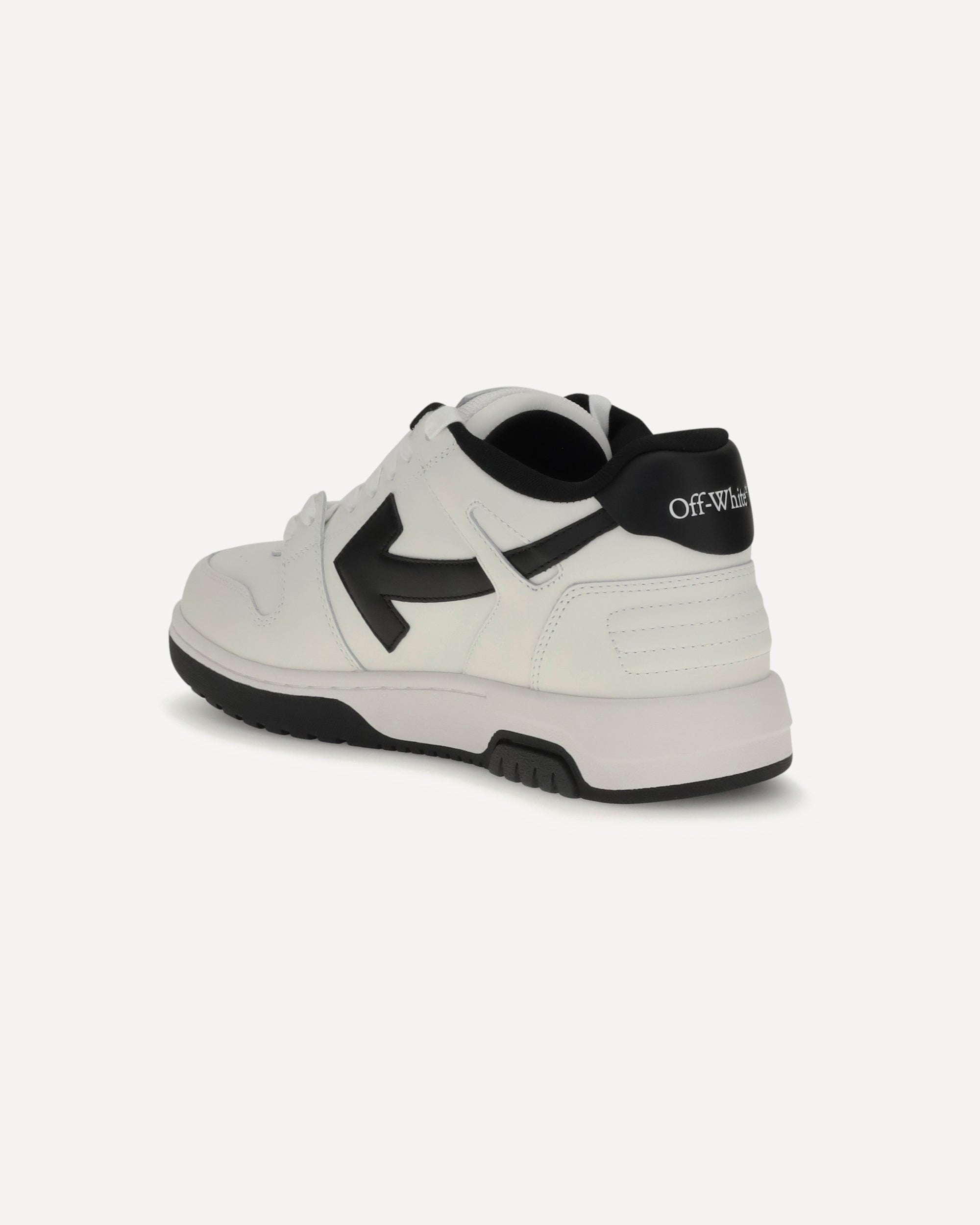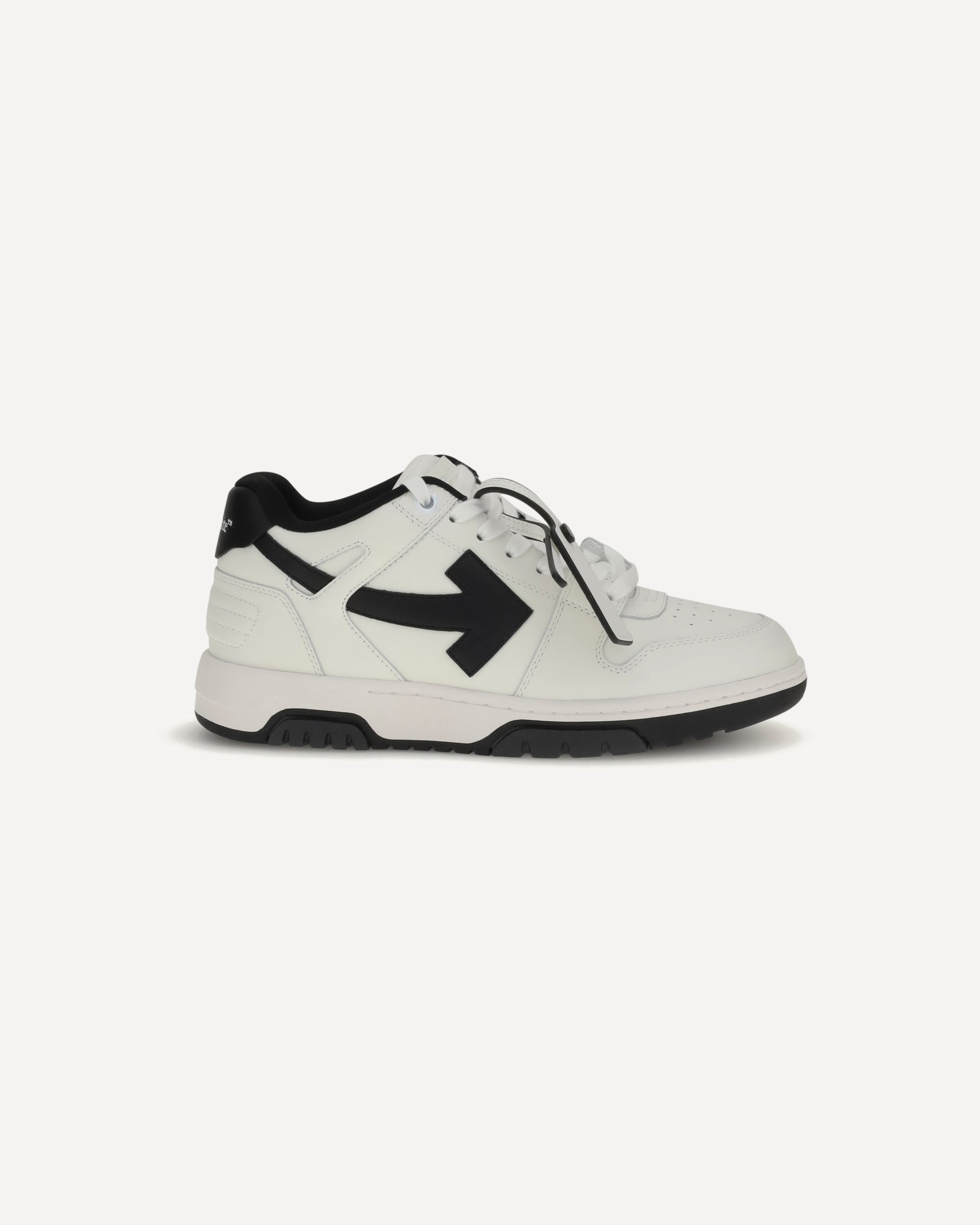 Leather Out Of Office Sneakers by Off-White feature a lace-up front closure and a round toe. The side panels are decorated with the brand's iconic Arrow logo, while the flat sole ensures comfort. A distinctive detail is the applied zipper tie tag on the front, accompanied by the contrasting logo on the heel, giving it an urban and contemporary feel.