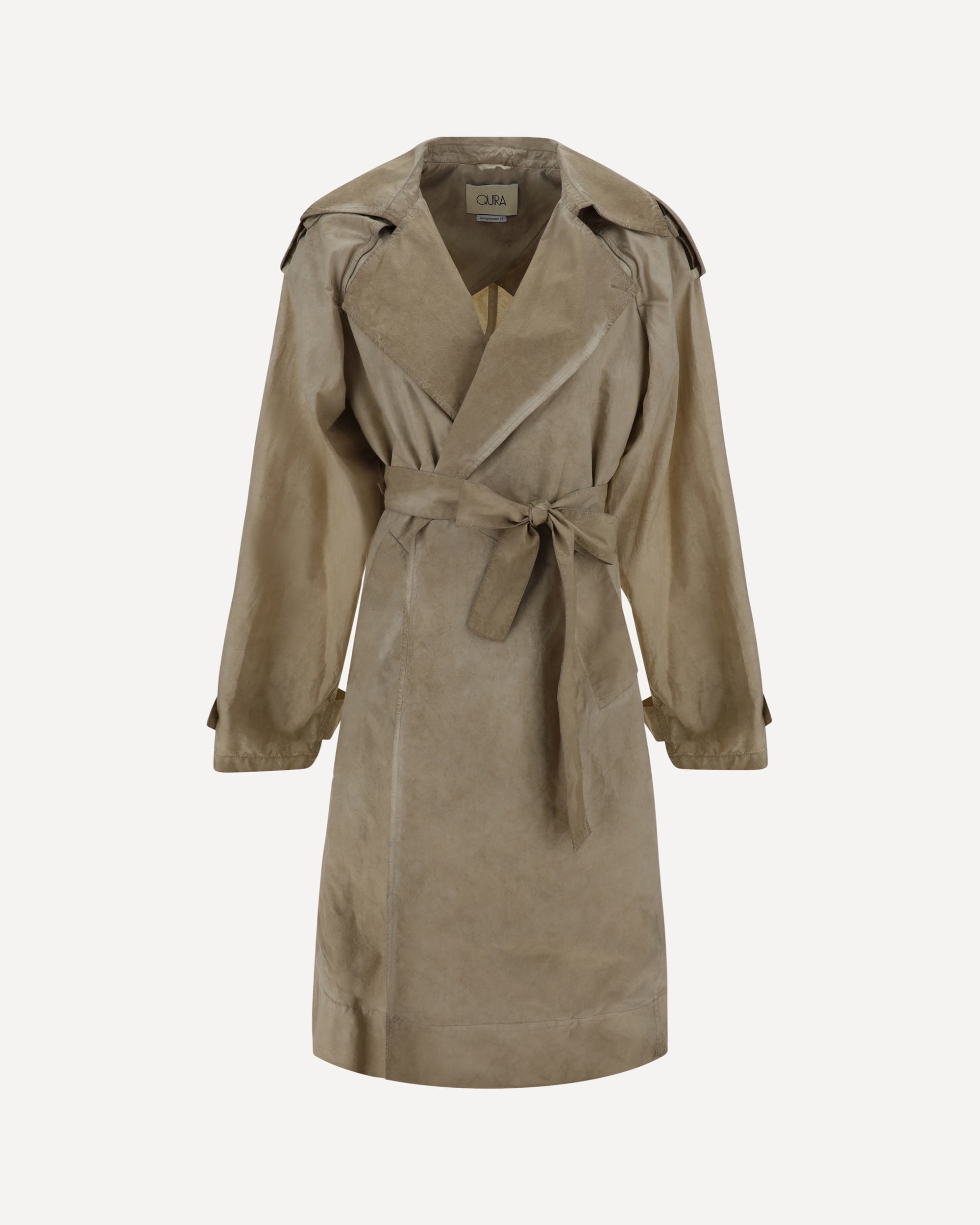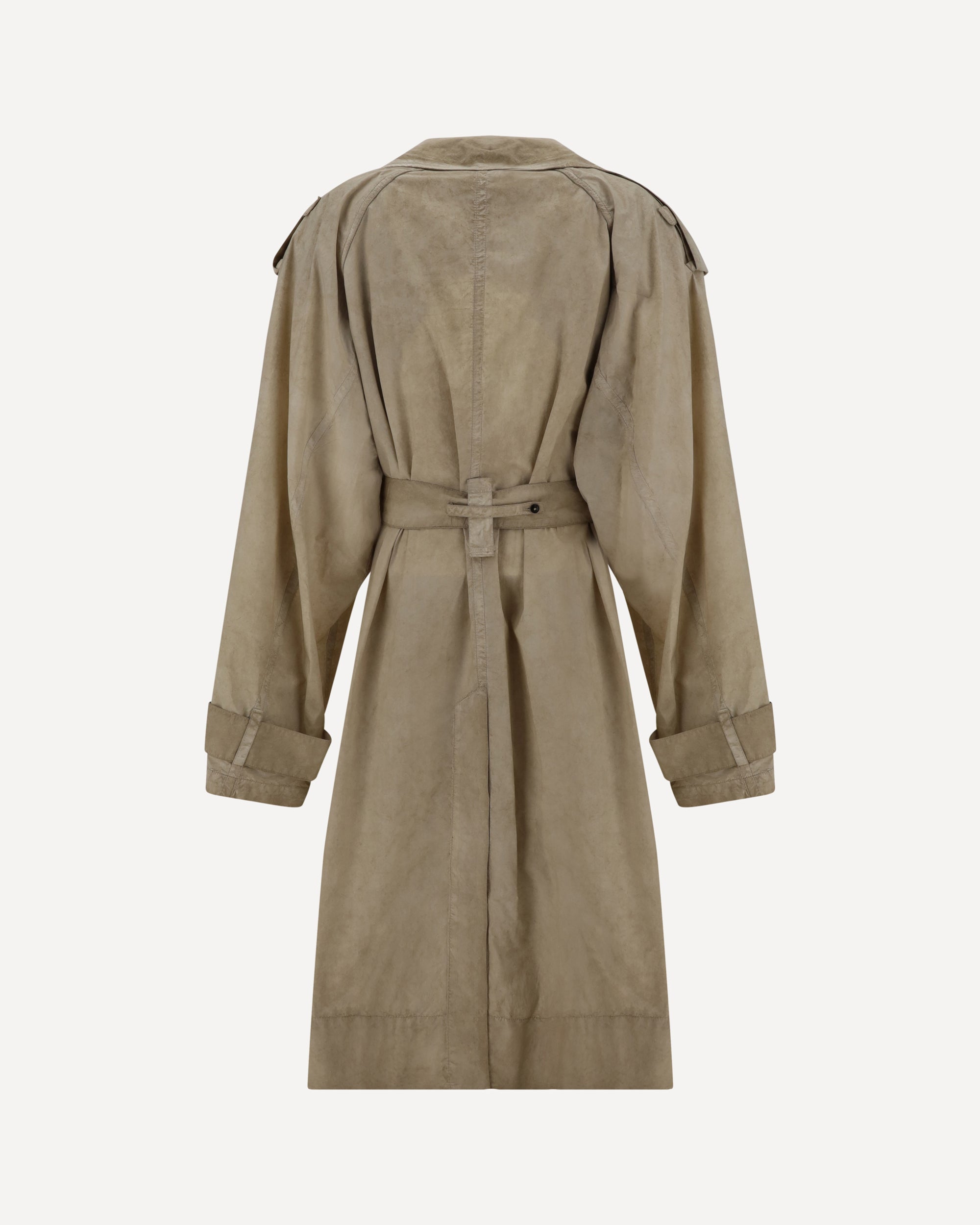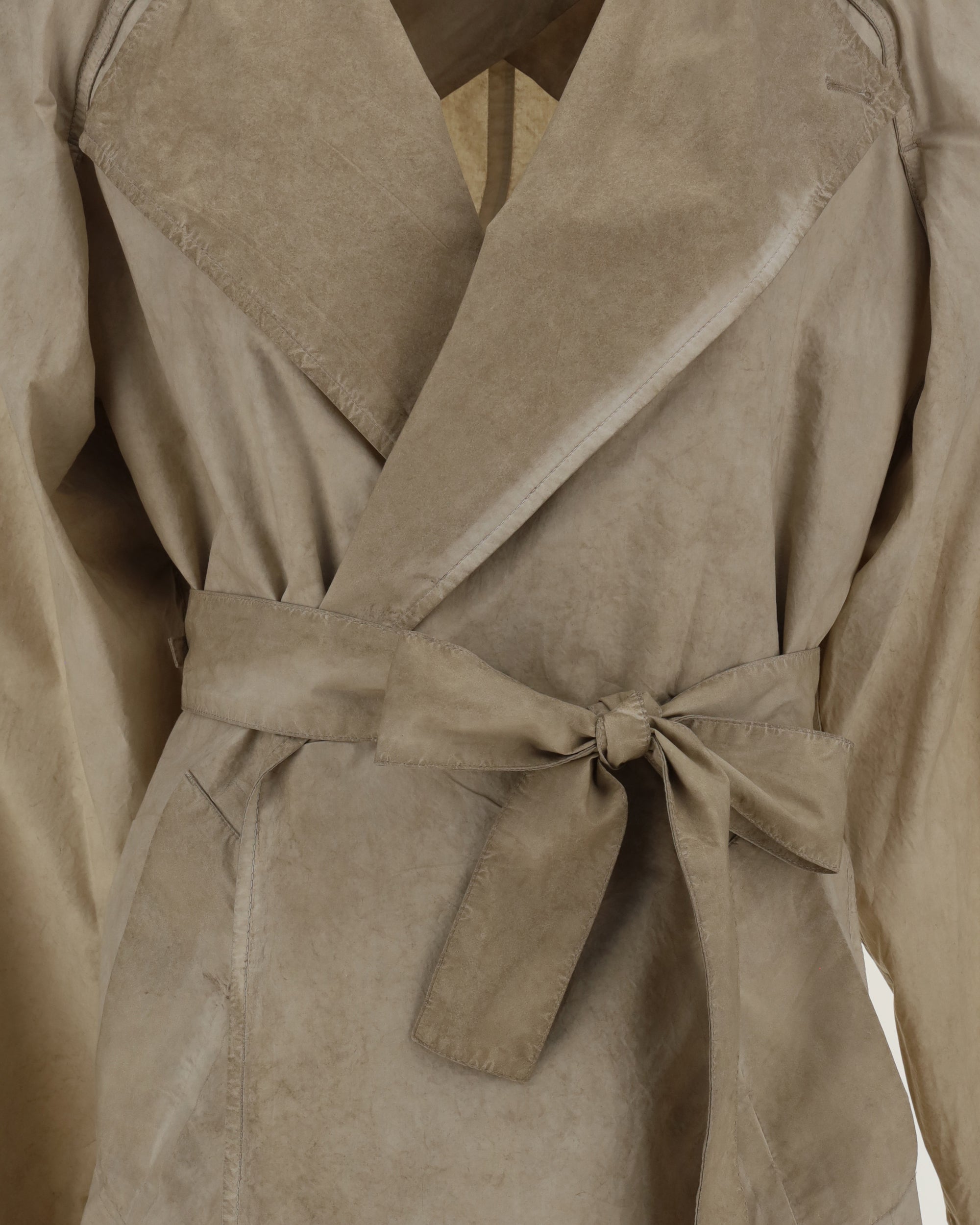 Oversized Trench Jacket by Quira, double-breasted closure by matching sash to tie waistband, wide geometric lapels, two side slit pockets, foot-length pattern.