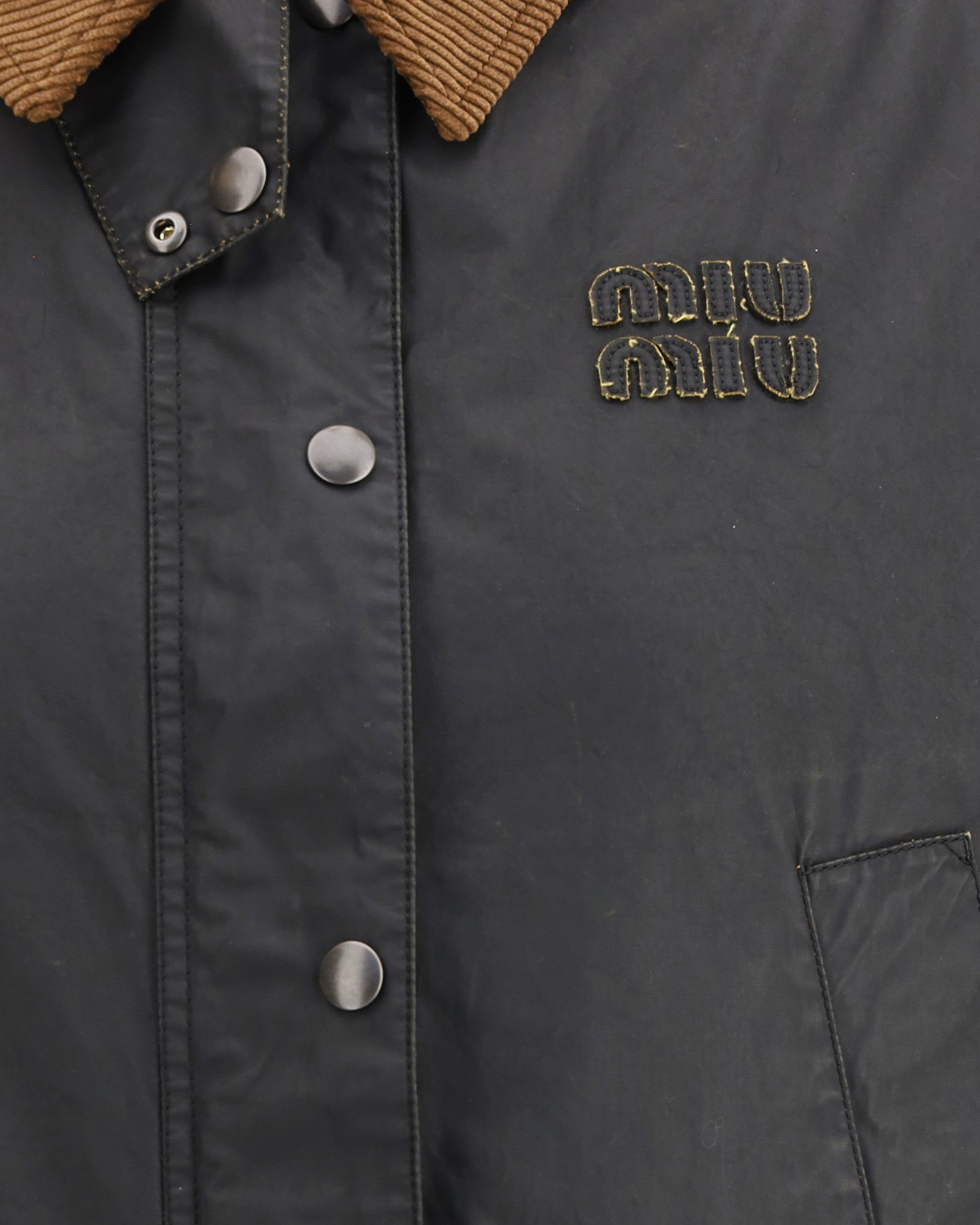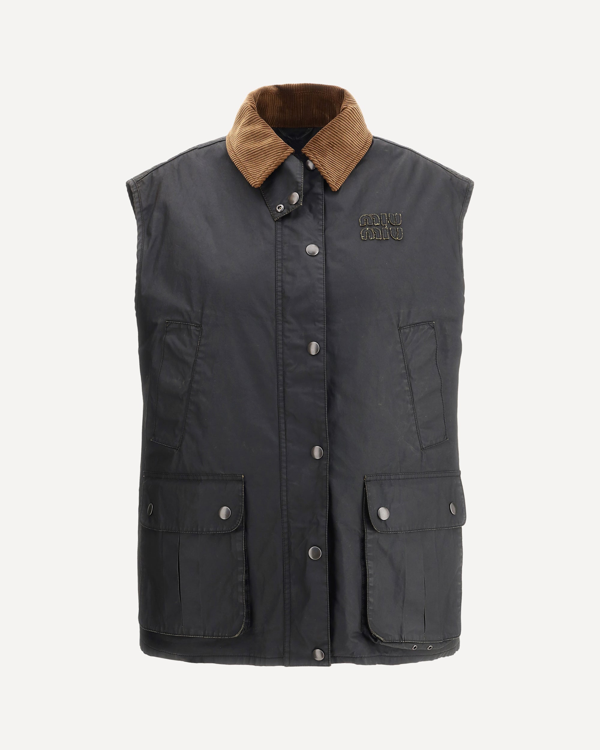 Miu Miu's padded Vest Jacket is a stylish and functional garment that combines comfort with distinctive style. The classic corduroy collar adds a touch of sophistication, while the front zipper and snap closure offers practicality and a sophisticated look. The two front buttoned patch pockets and two side welt pockets provide useful space for small items without compromising the garment's clean aesthetic. The brand's iconic tone-on-tone stitched logo on the front adds a subtle yet recognizable detail. Perfect for a casual-chic look, this vest jacket is ideal for combining functionality and luxury