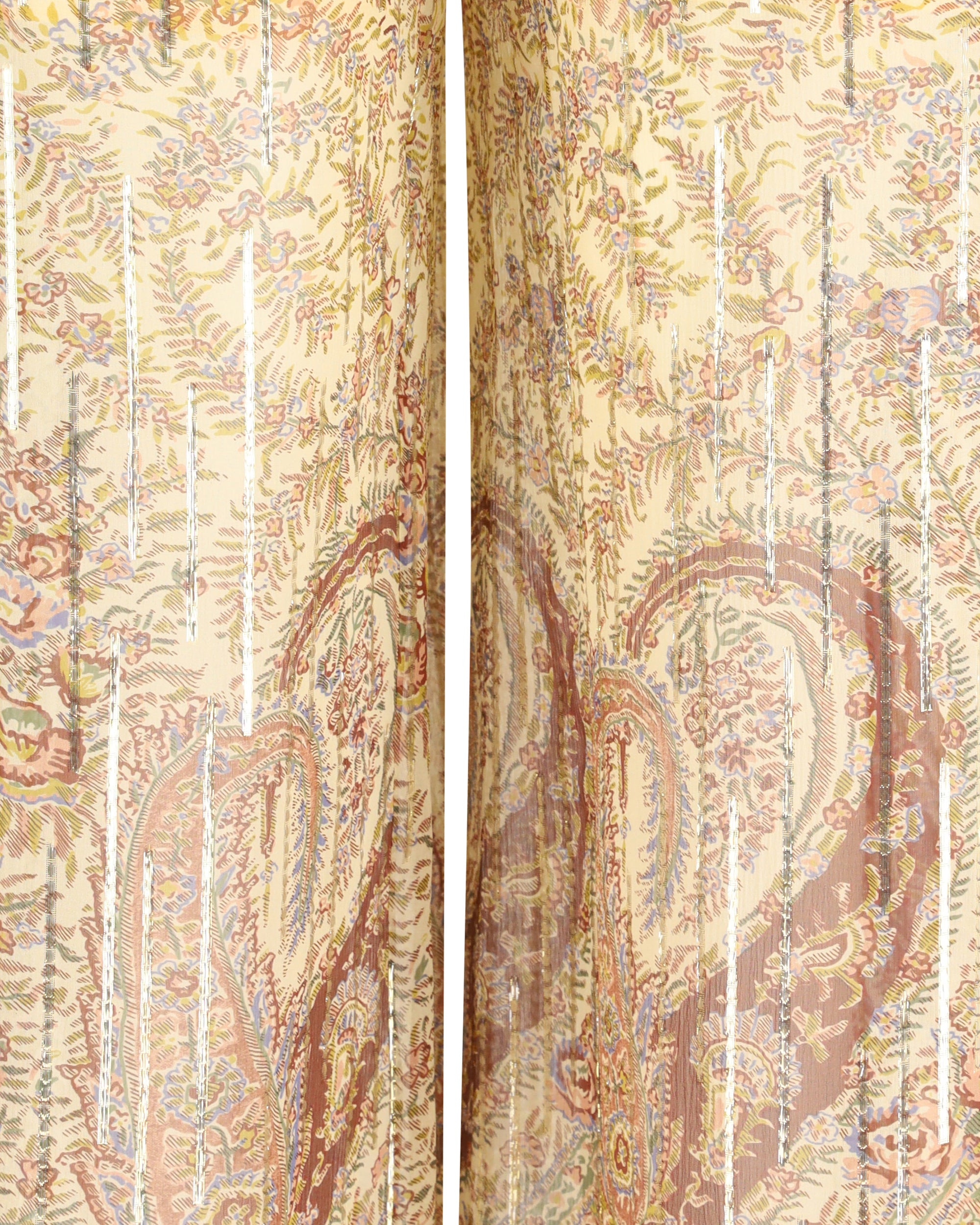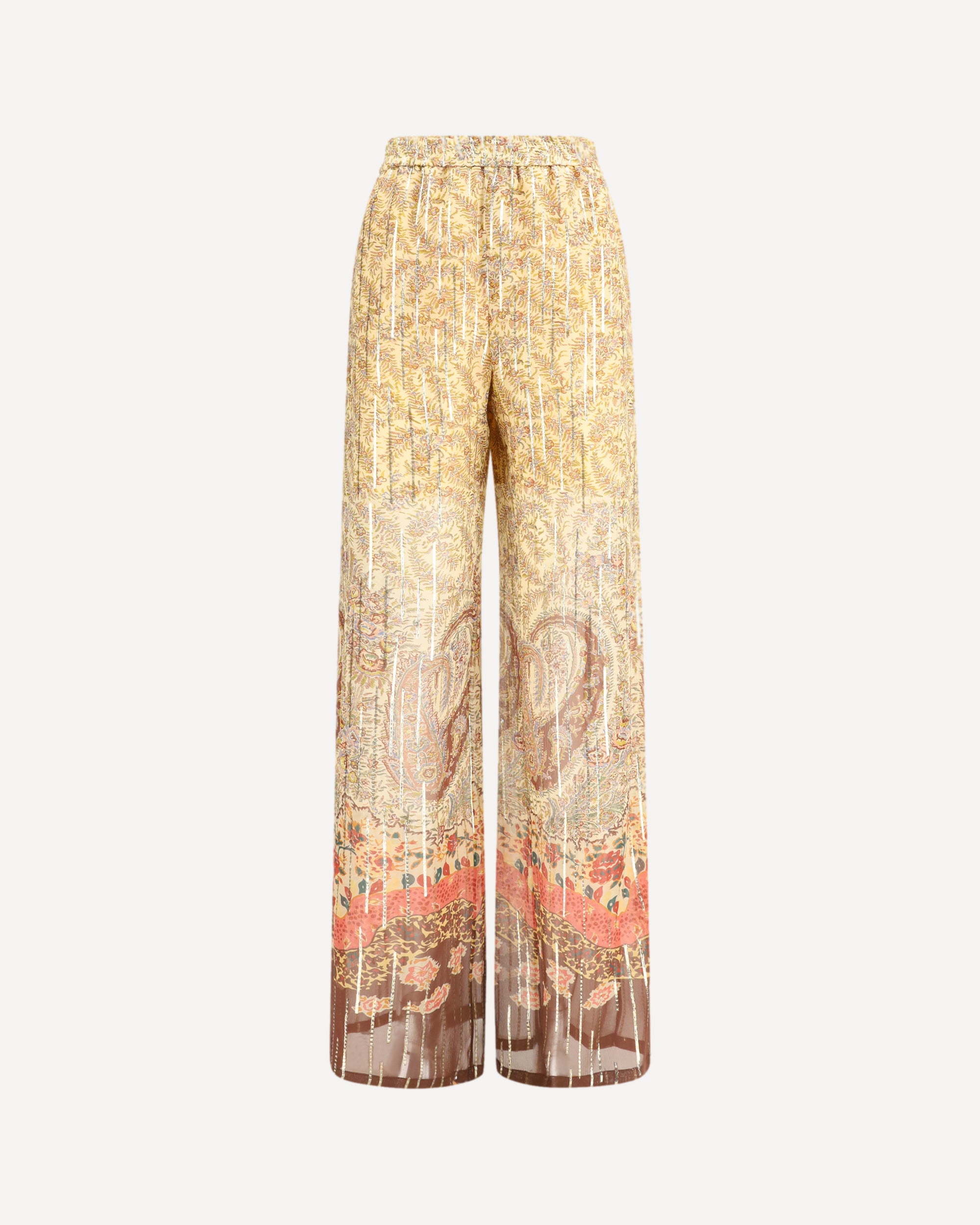 The silk georgette Pants express fluid by Valentino, refined elegance, highlighted by a floral Paisley print with strong decorative appeal. The semi-sheer fabric, enhanced with subtle lurex details, moves lightly with the body, while the fluid leg creates an effortless, feminine silhouette. An elasticated waistband ensures comfort, complemented by two side pockets and two rear welt pockets, balancing sophistication with everyday wearability.