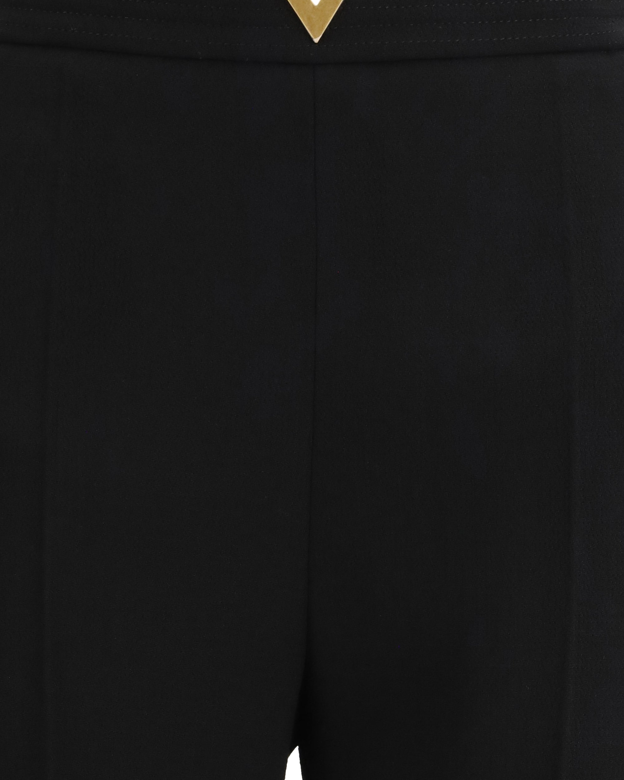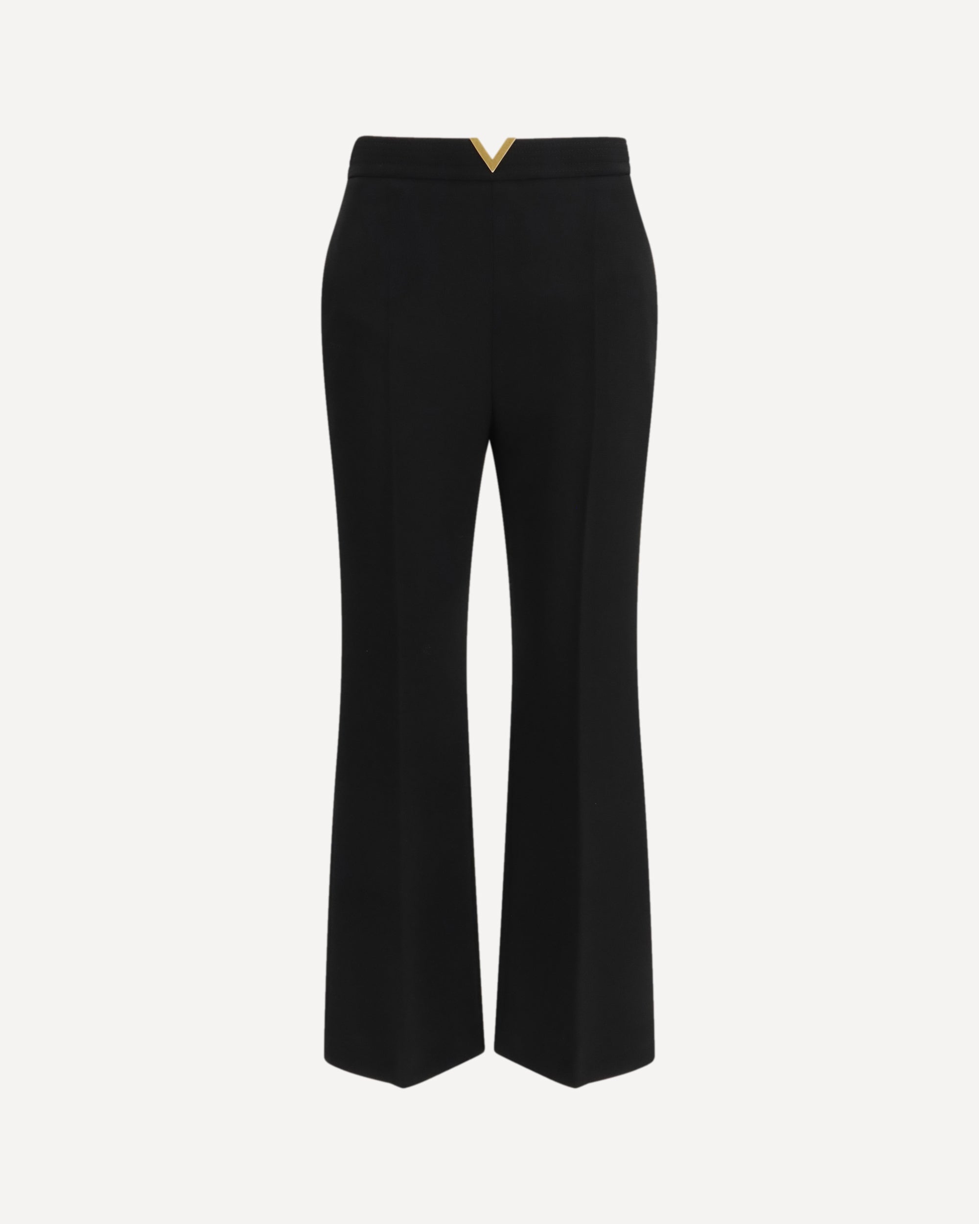 The wool flare Pants by Valentino are an elegant and sophisticated piece, with an invisible side zip closure that ensures a clean line. The high waist, embellished with topstitching and a gold metal V detail on the front, adds a distinctive and refined touch. Side pockets and back welt pockets complete the practical and functional design, while the flared hem and center crease on the legs create an elegant and slimming silhouette. Unlined and cropped, these pants are perfect for a sophisticated yet modern look.