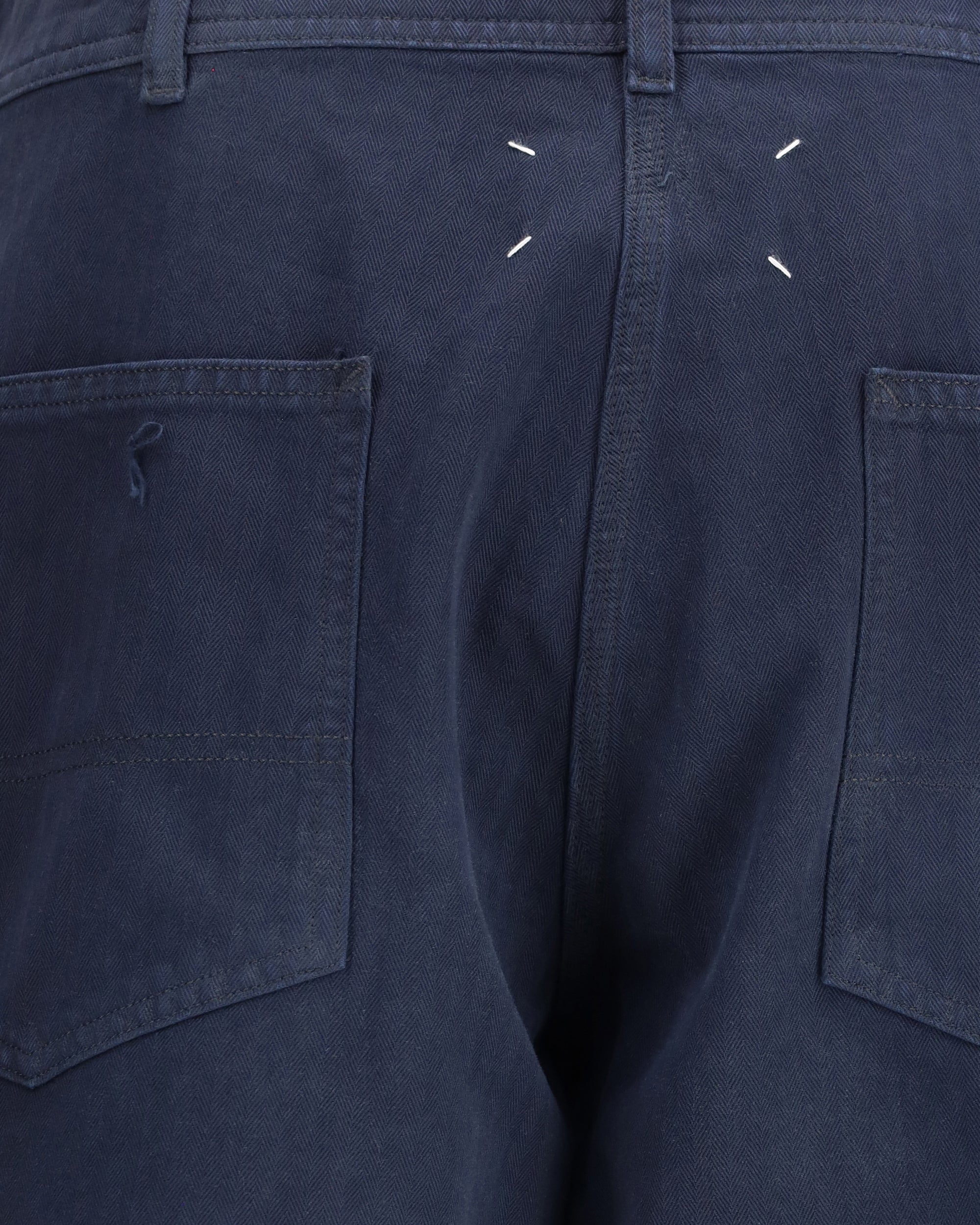 The Margiela Cotton Trousers blend elegance with signature details. The fabric features tonal stripe embroidery across the entire surface and the iconic contrasting stitch on the back for a distinctive touch. Belt loops accommodate a belt, while a zip, hidden hook, and single visible button ensure practical closure. Five classic front pockets and two back patch pockets complete the design, with a raw-cut hem adding a modern finish