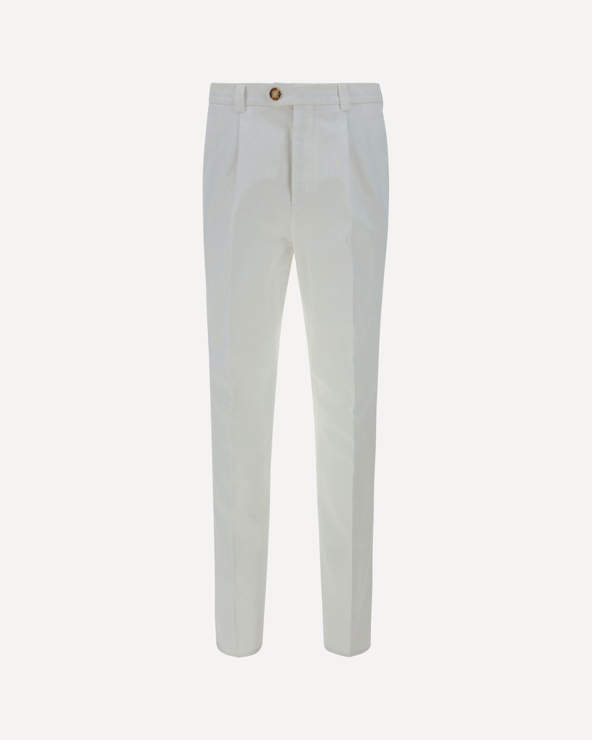 The cotton Trousers by Brunello Cucinelli stand out for their refined simplicity and impeccable tailoring. Crafted from pure cotton in a solid tone, they feature a front button and zip closure, two side slash pockets, and two back welt pockets. Belt loops at the waist complete the design, creating a timeless and versatile piece ideal for everyday sophistication.