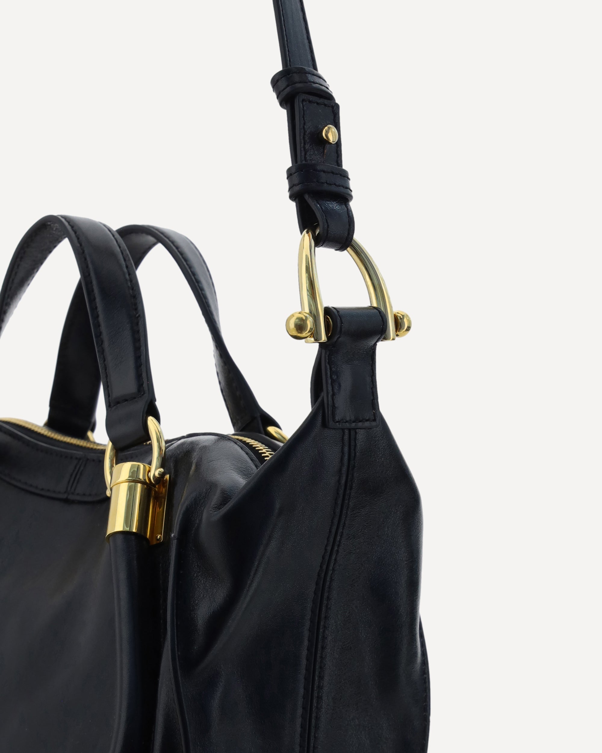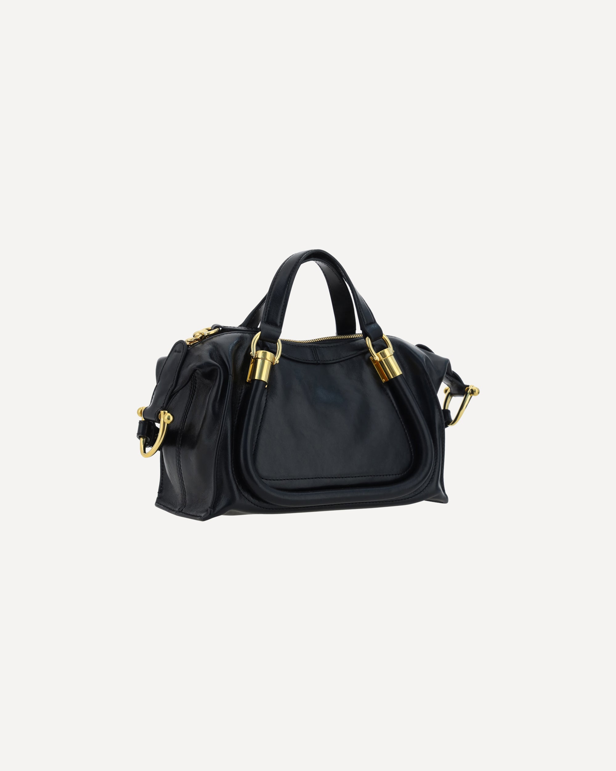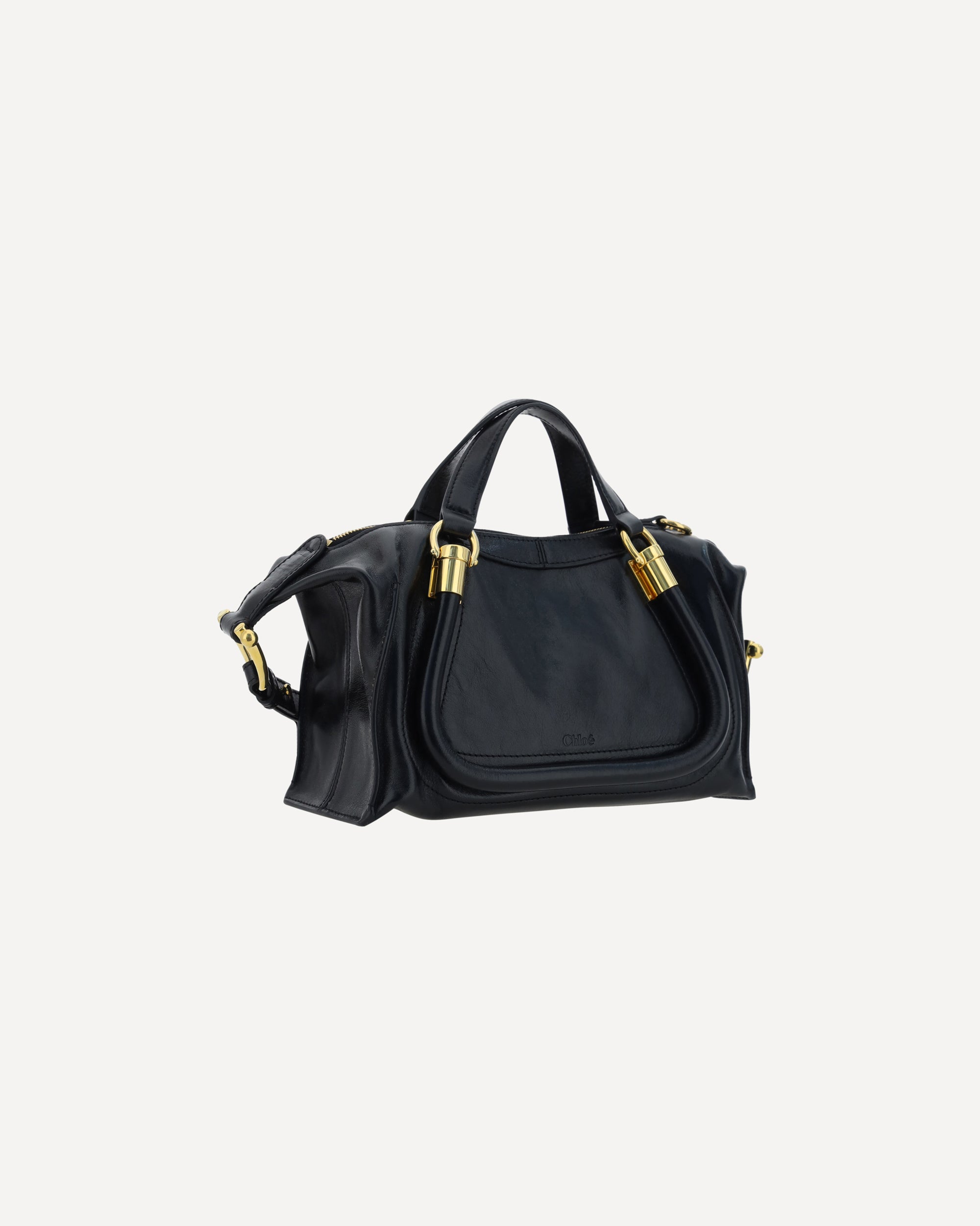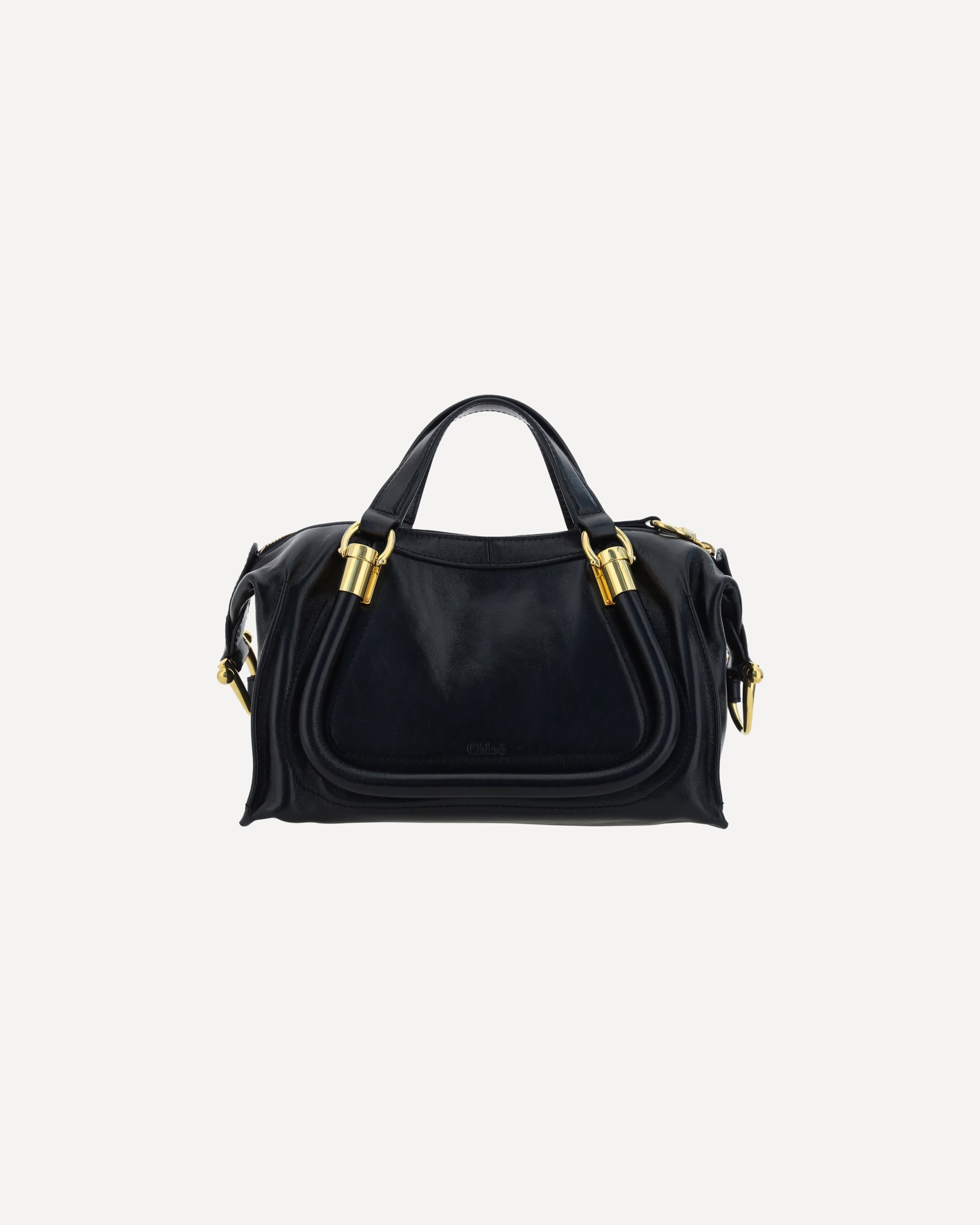 Leather Paraty Shoulder Bag by Chloé featuring two flat top handles, an adjustable and removable shoulder strap, the brand's iconic press-stamped monogram on the front, a single compartment, a top zipper closure, and a monochrome pattern.