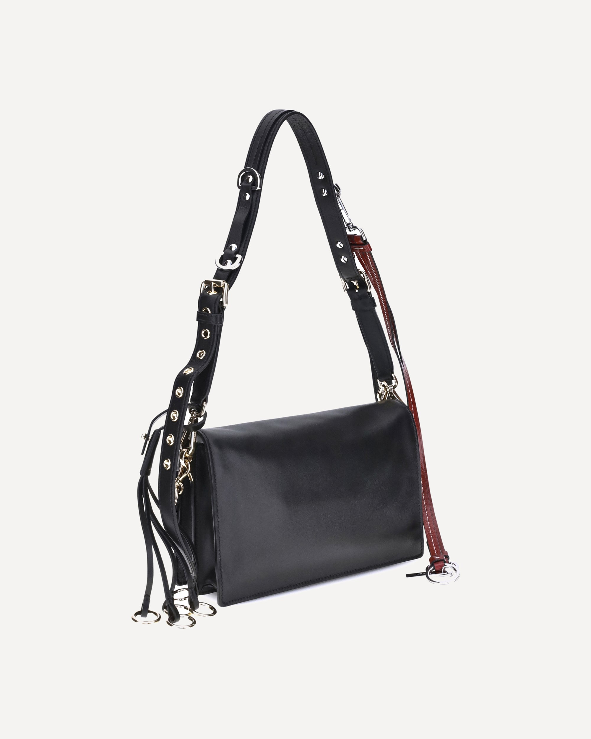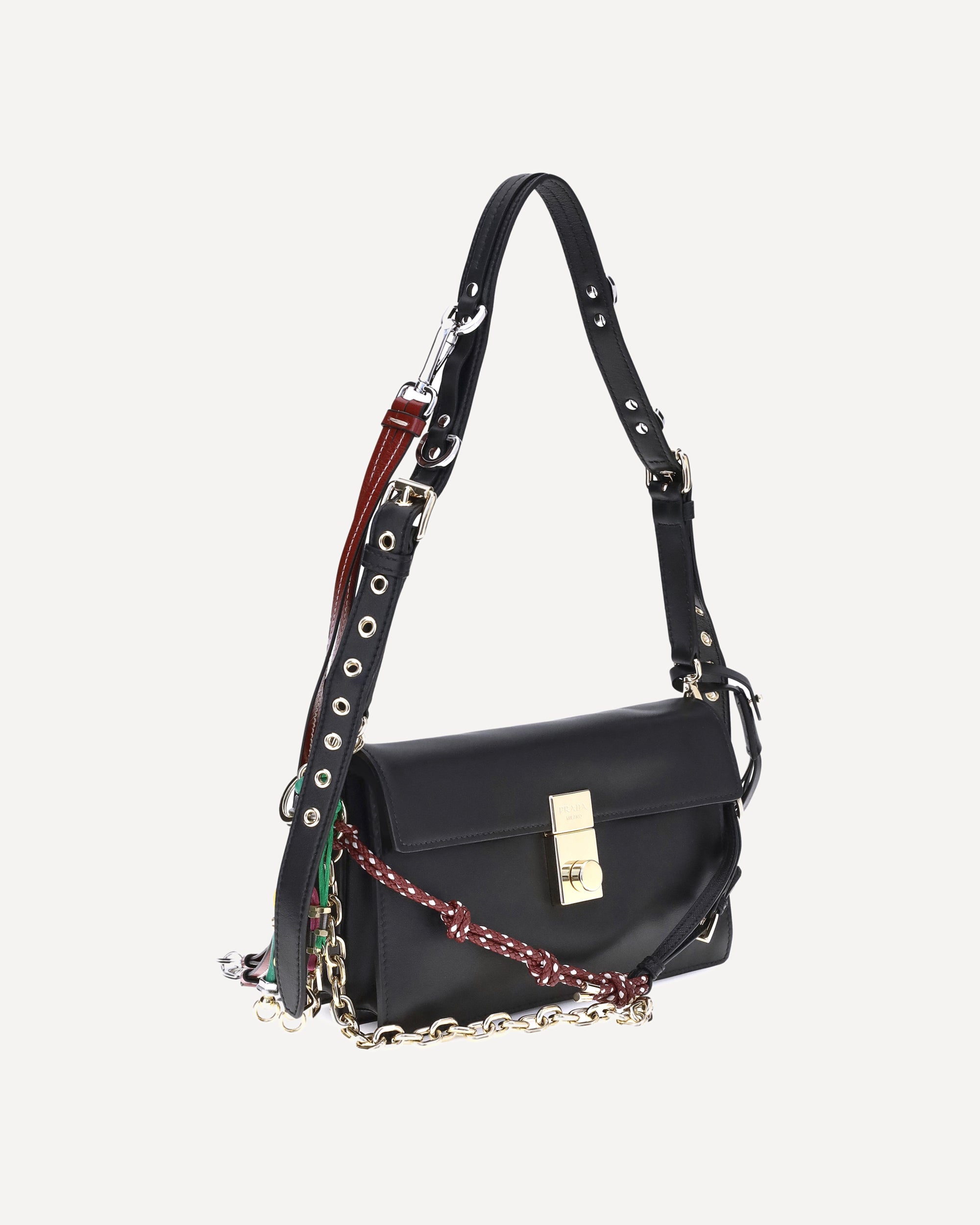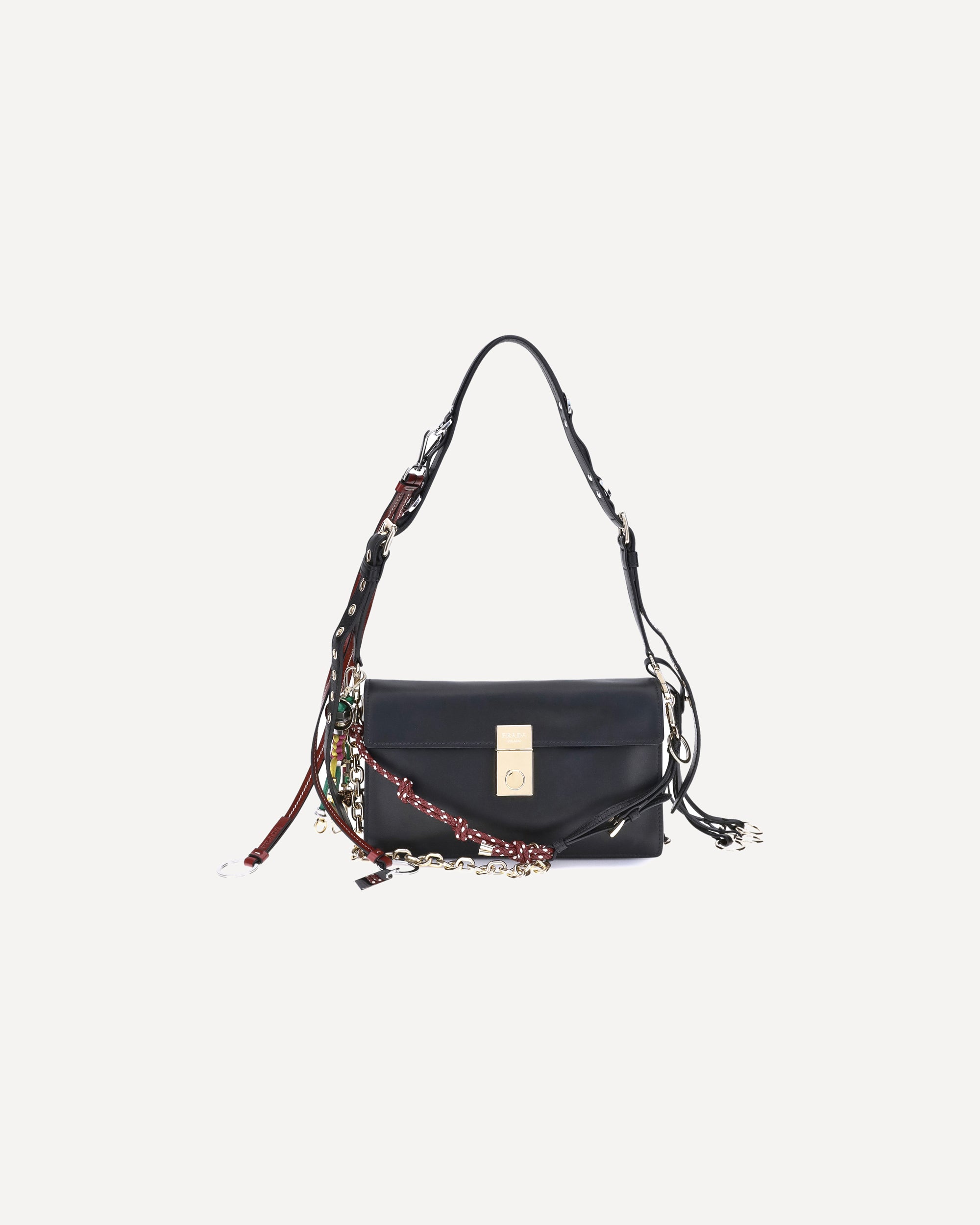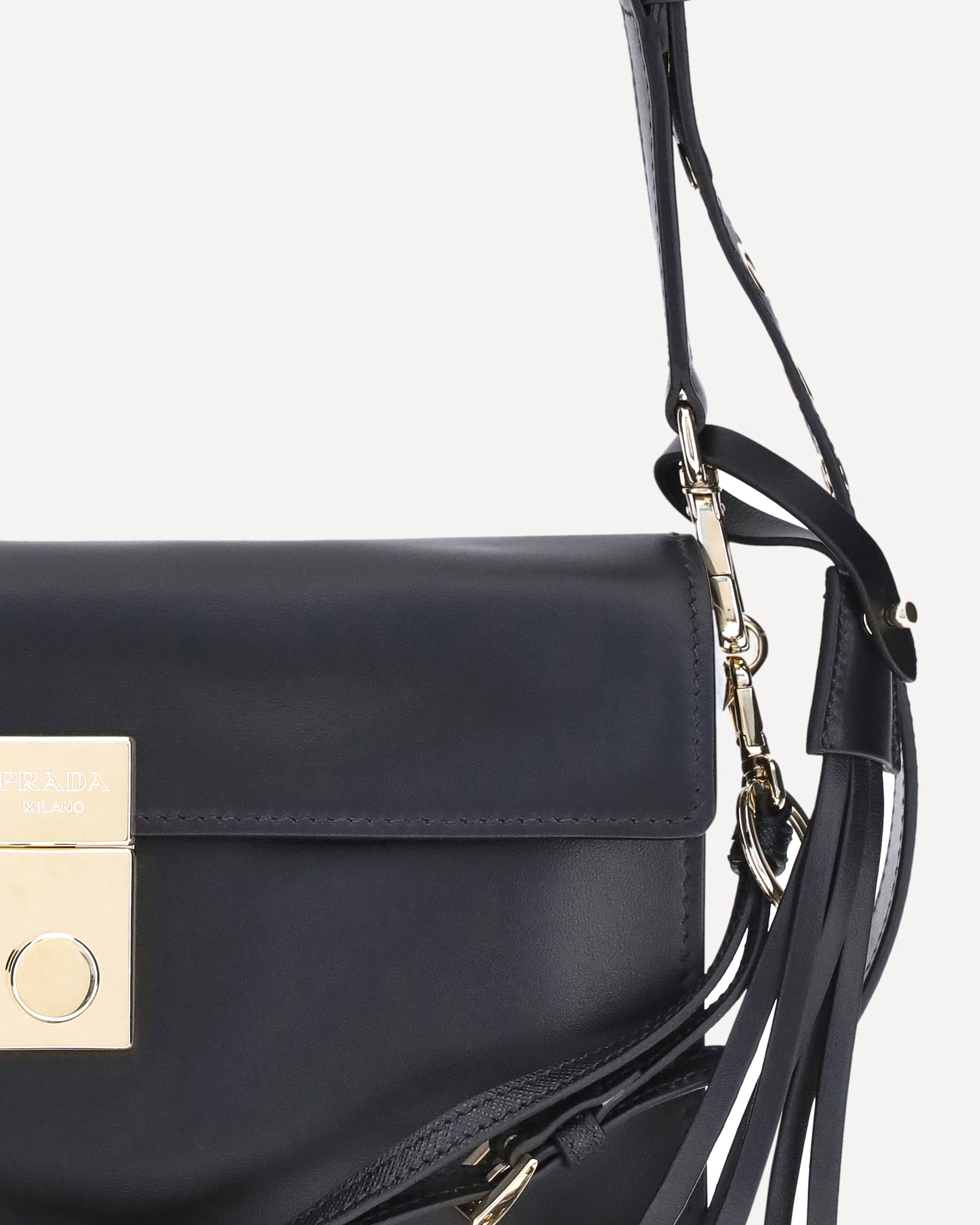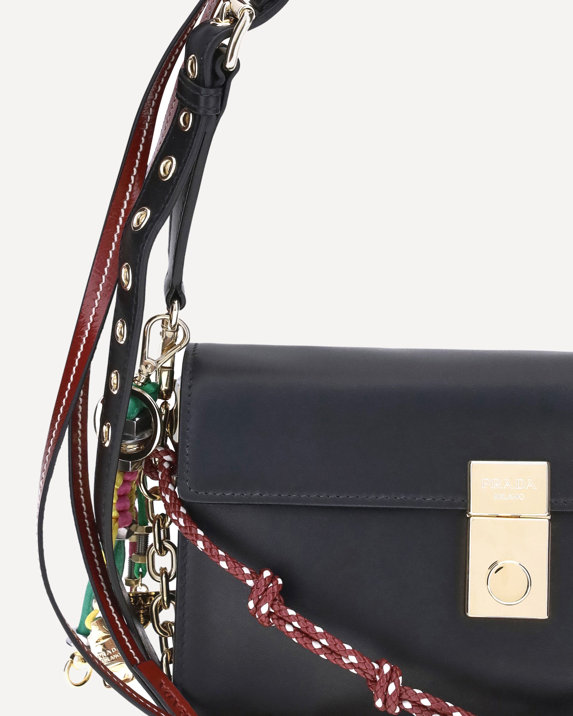 Prada's Soft Sound Small Shoulder Bag combines soft lines and refined details in a compact and functional design. Made of lightly grained leather, it is embellished with a metallic logo detail on the front and removable accessories that enrich the shoulder strap. The adjustable and removable tonal leather shoulder strap allows for versatile portability. The interlocking closure protects a lined interior, organized with two compartments, a zippered pocket and a patch pocket. An elegant accessory, ideal to accompany everyday life in style.