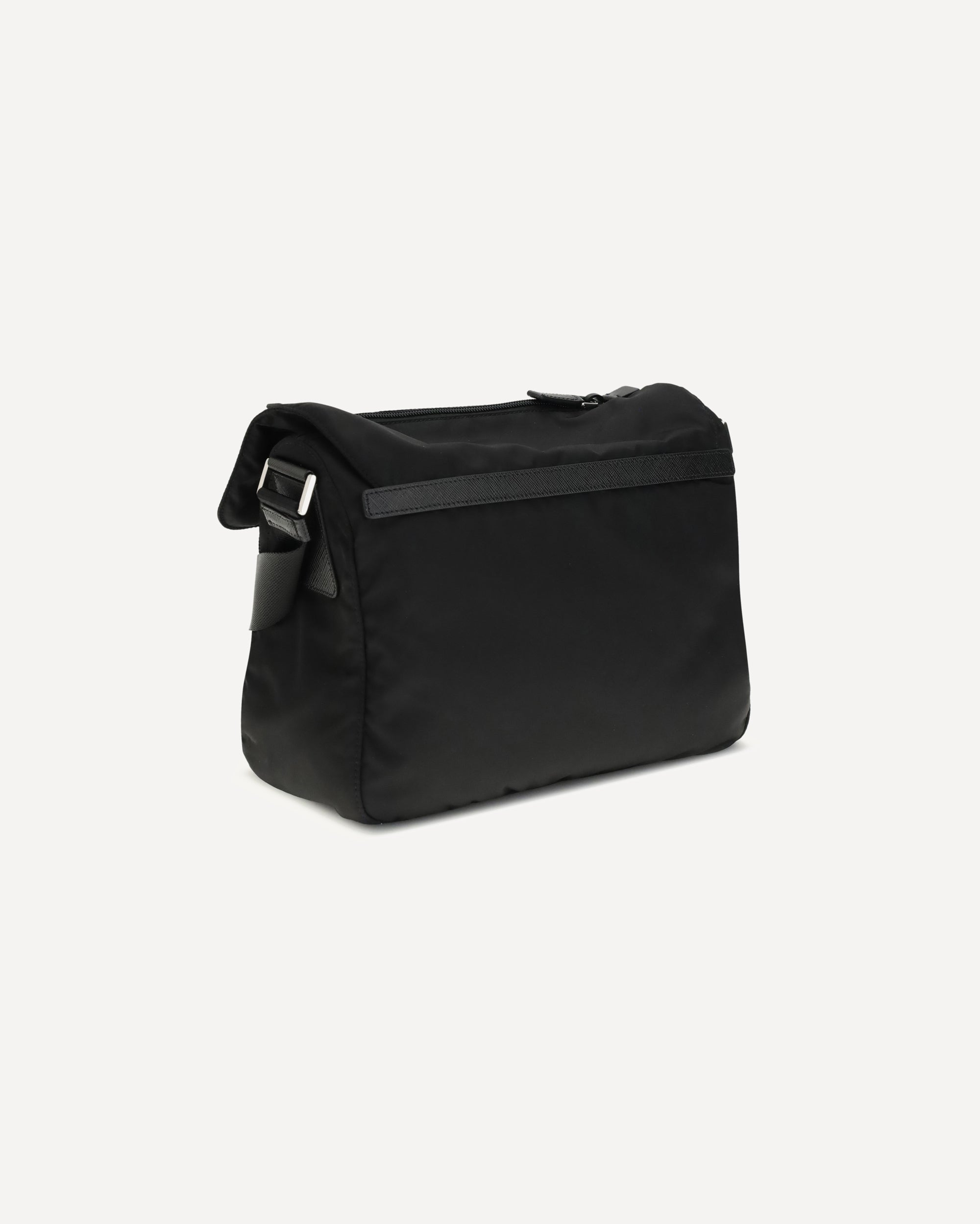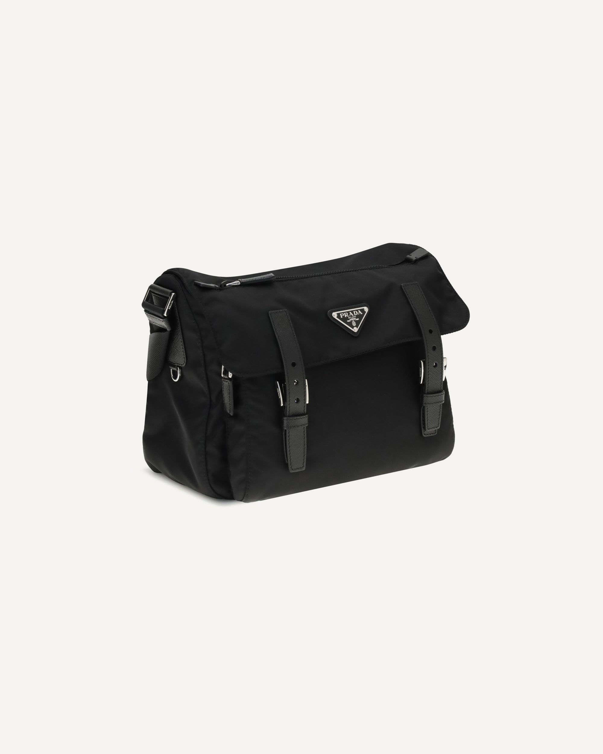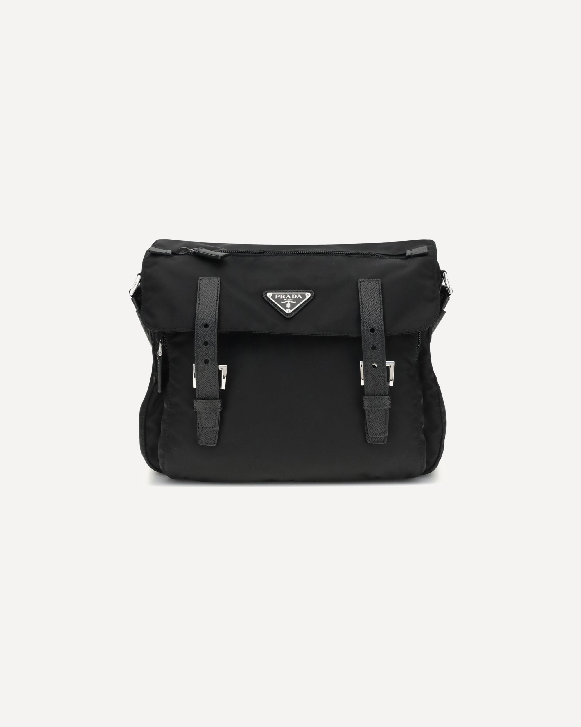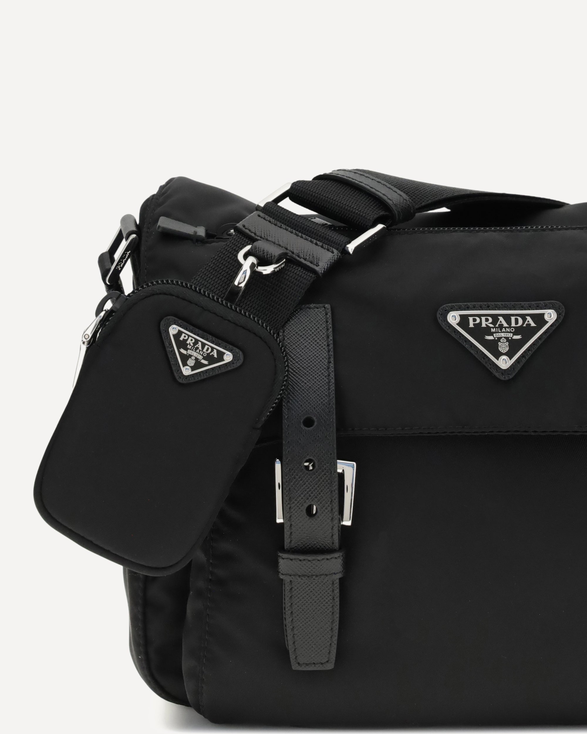 Explore medium Shoulder Bag by Prada is made of Re-Nylon and finished with metal details. It features a front zippered pocket, enameled triangle logo flap, and zipper and strap closure. The interior, also made of Re-Nylon, includes a patch pocket and a removable zipper and logo pouch.