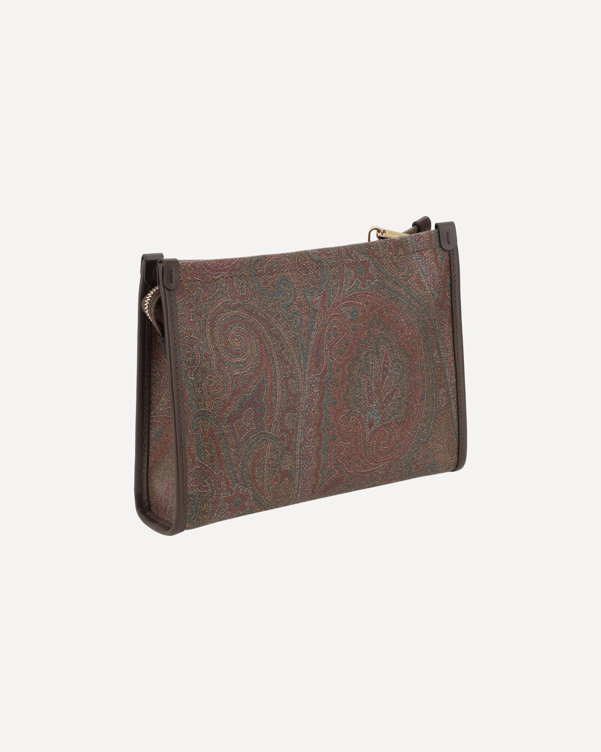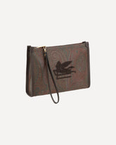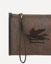 Etro's medium Arnica Pouch is an elegant and personality-packed accessory made in the house's iconic signature Paisley jacquard fabric. Leather details enhance its structure, while the ETRO logo and Pegasus embroidered on the front add a distinctive and refined touch. The interior surprises with a contrasting striped jacquard fabric lining, an expression of the brand's signature attention to detail. A versatile pouch, ideal to carry by hand or to fit into a more capacious bag.