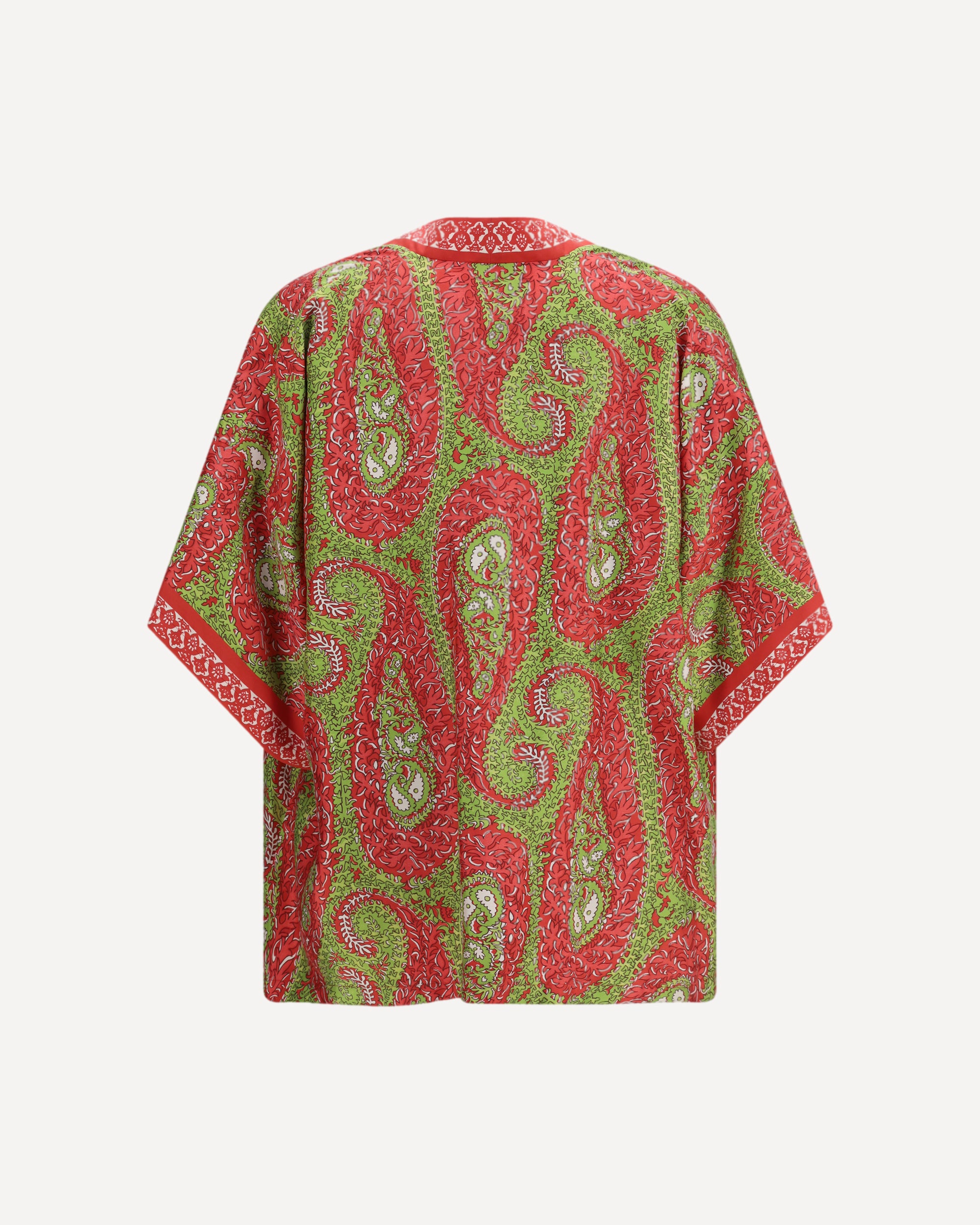 The printed Kesa Jacket by Etro expresses a refined and distinctive aesthetic inspired by fluid volumes and iconic decoration. Designed with a regular fit, it balances the silhouette effortlessly, while printed kimono sleeves add movement and character to the design. A statement piece conceived to elevate contemporary looks with an editorial touch.