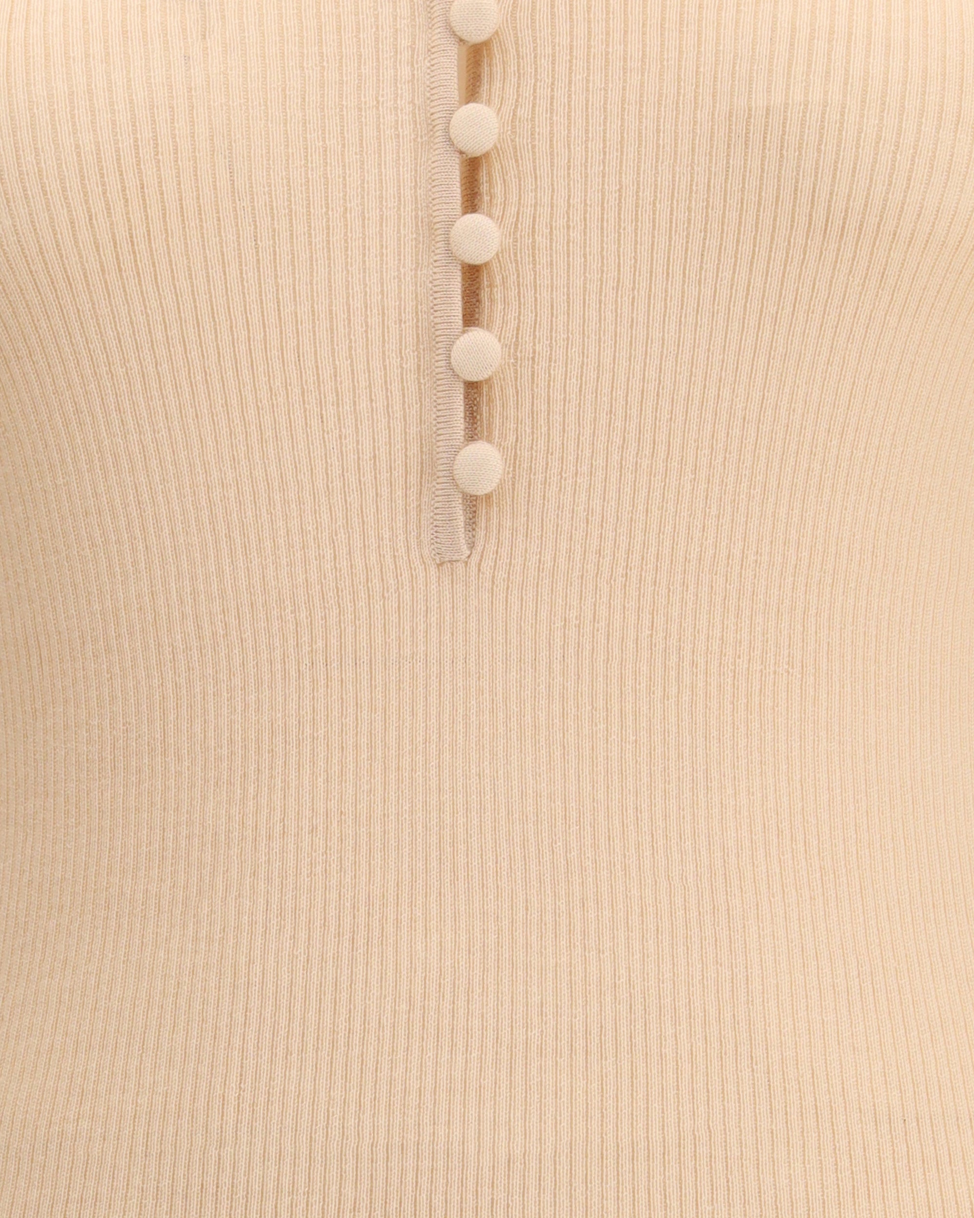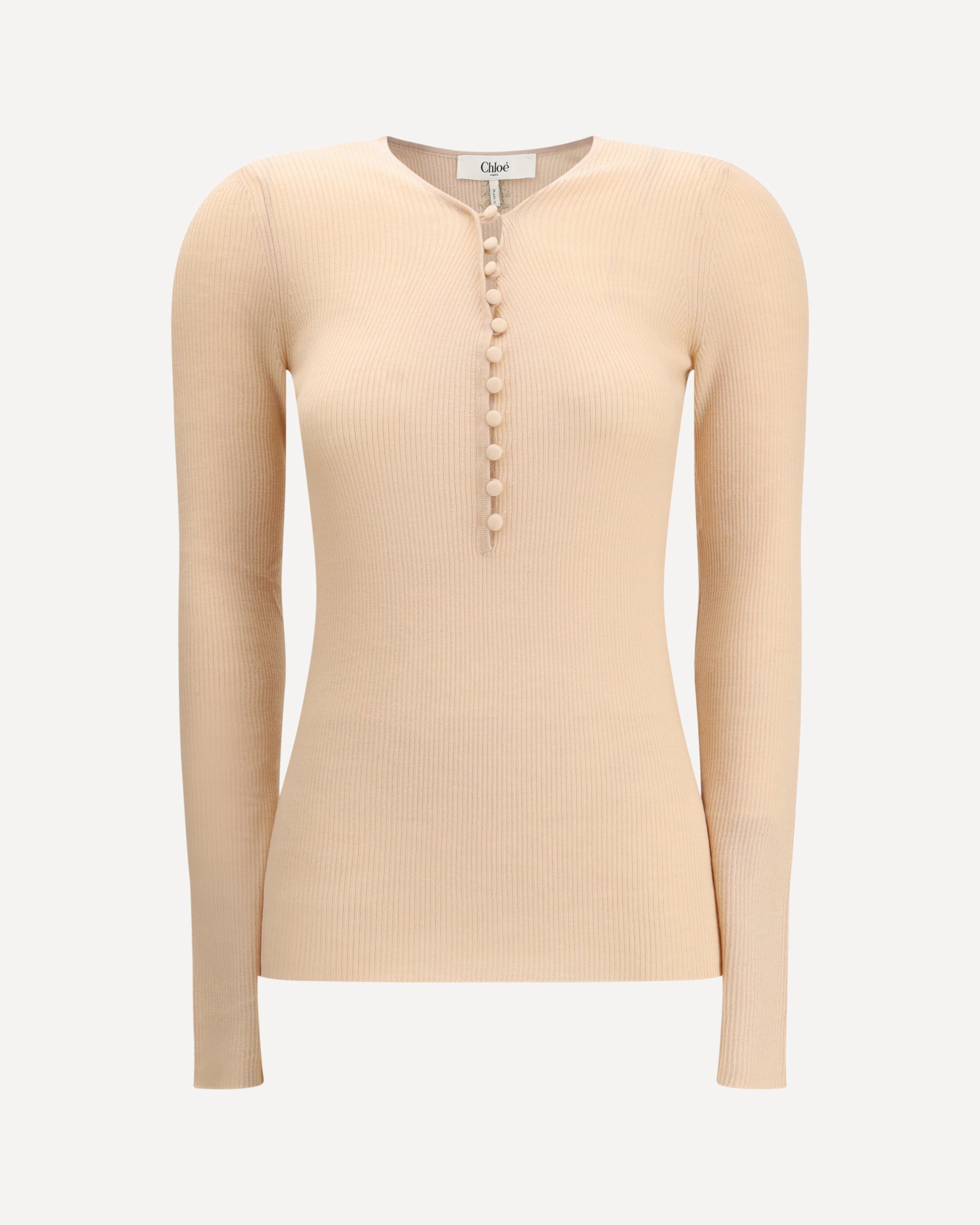 The Merino Wool Henley Sweater by Chloé brings everyday elegance to life with refined details. Rib-knit construction frames the V-neckline with fabric-covered buttons, complemented by long sleeves and a straight hem that enhance the clean silhouette. A versatile and comfortable piece, perfect for both sophisticated and relaxed looks.