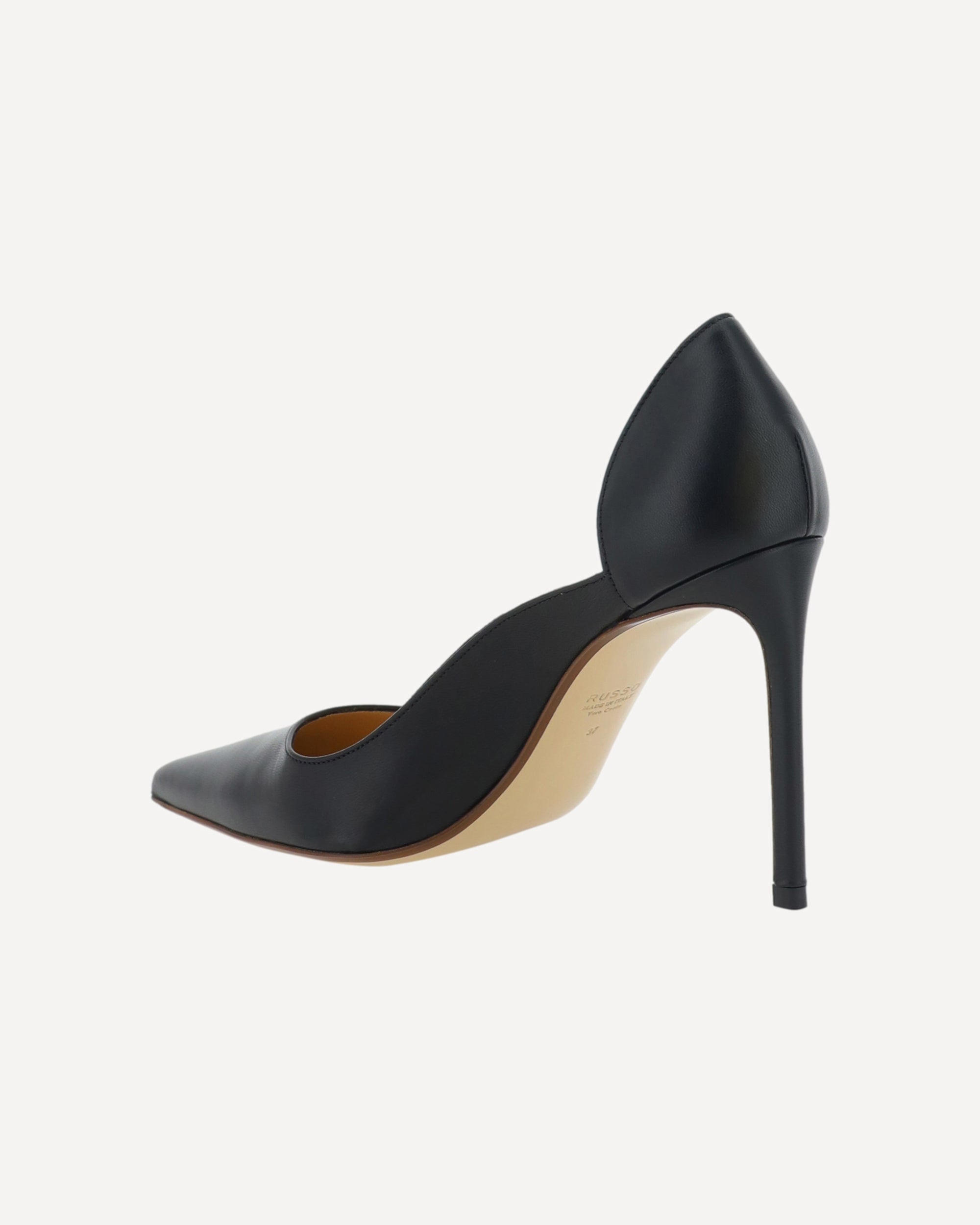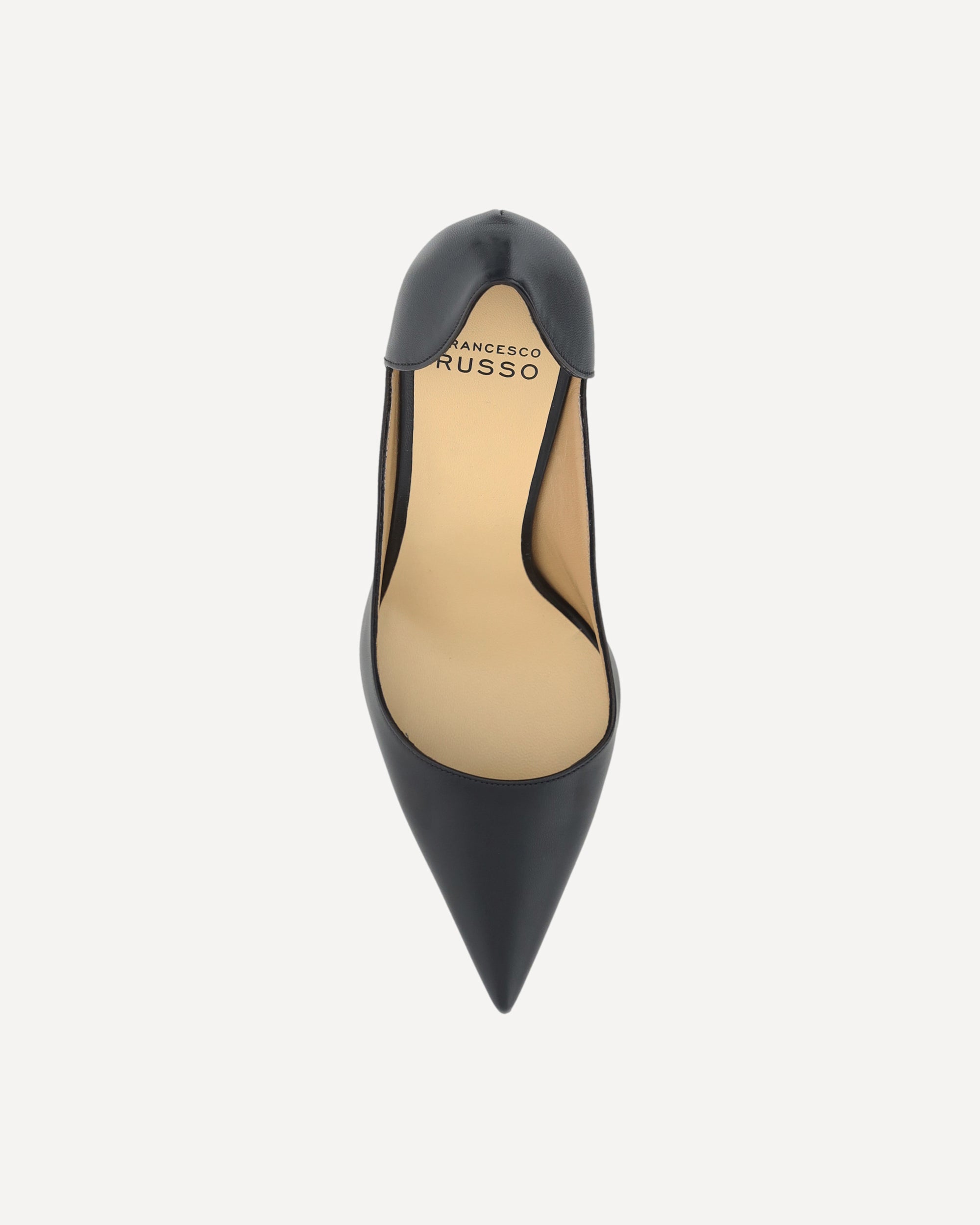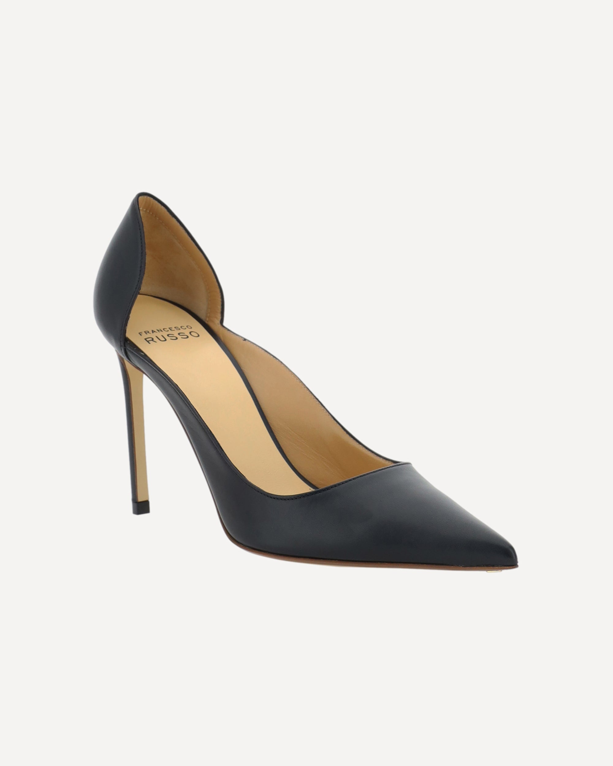 Leather Pumps by Francesco Russo, elongated toe, leather stiletto heel, press-stamped logo insole.