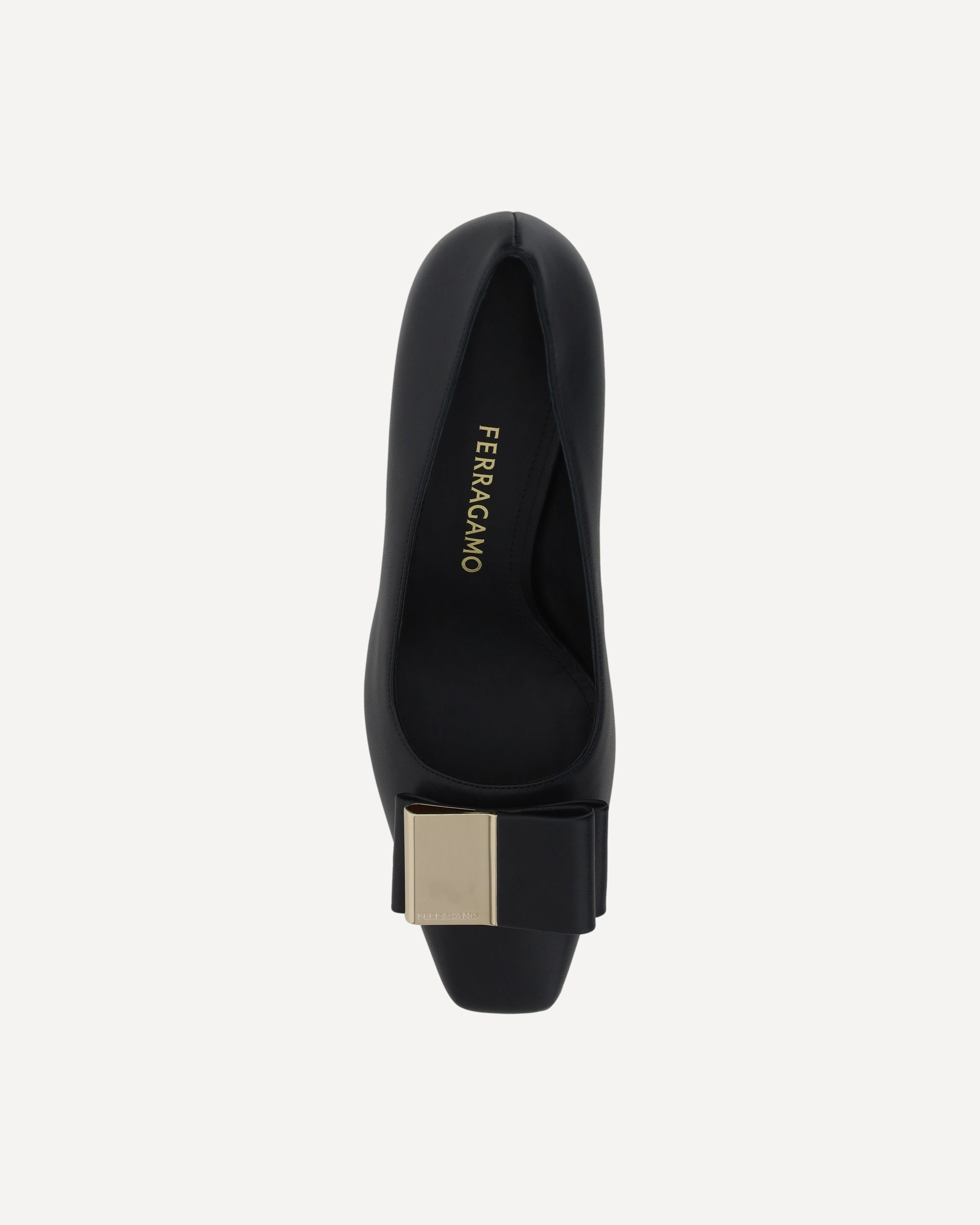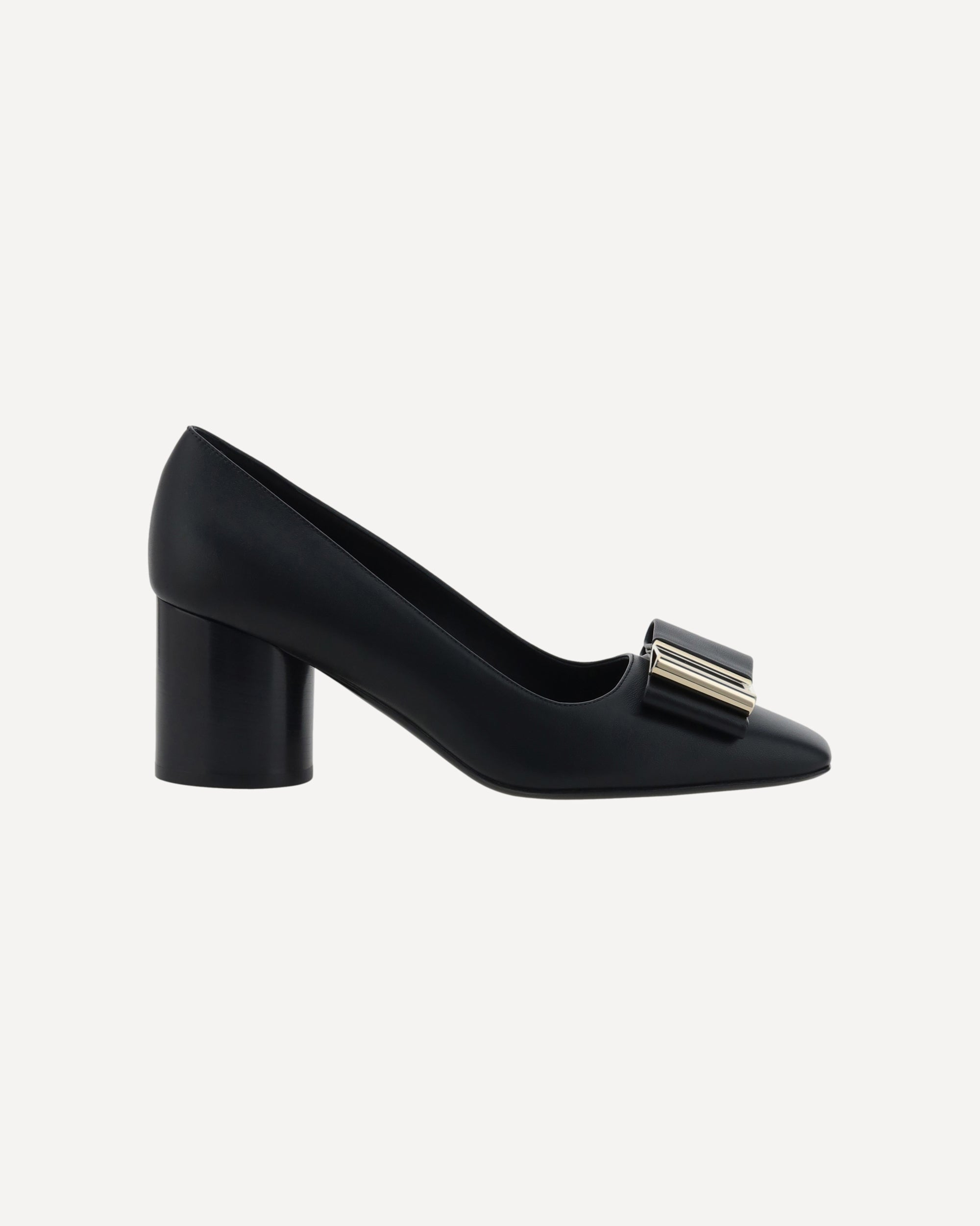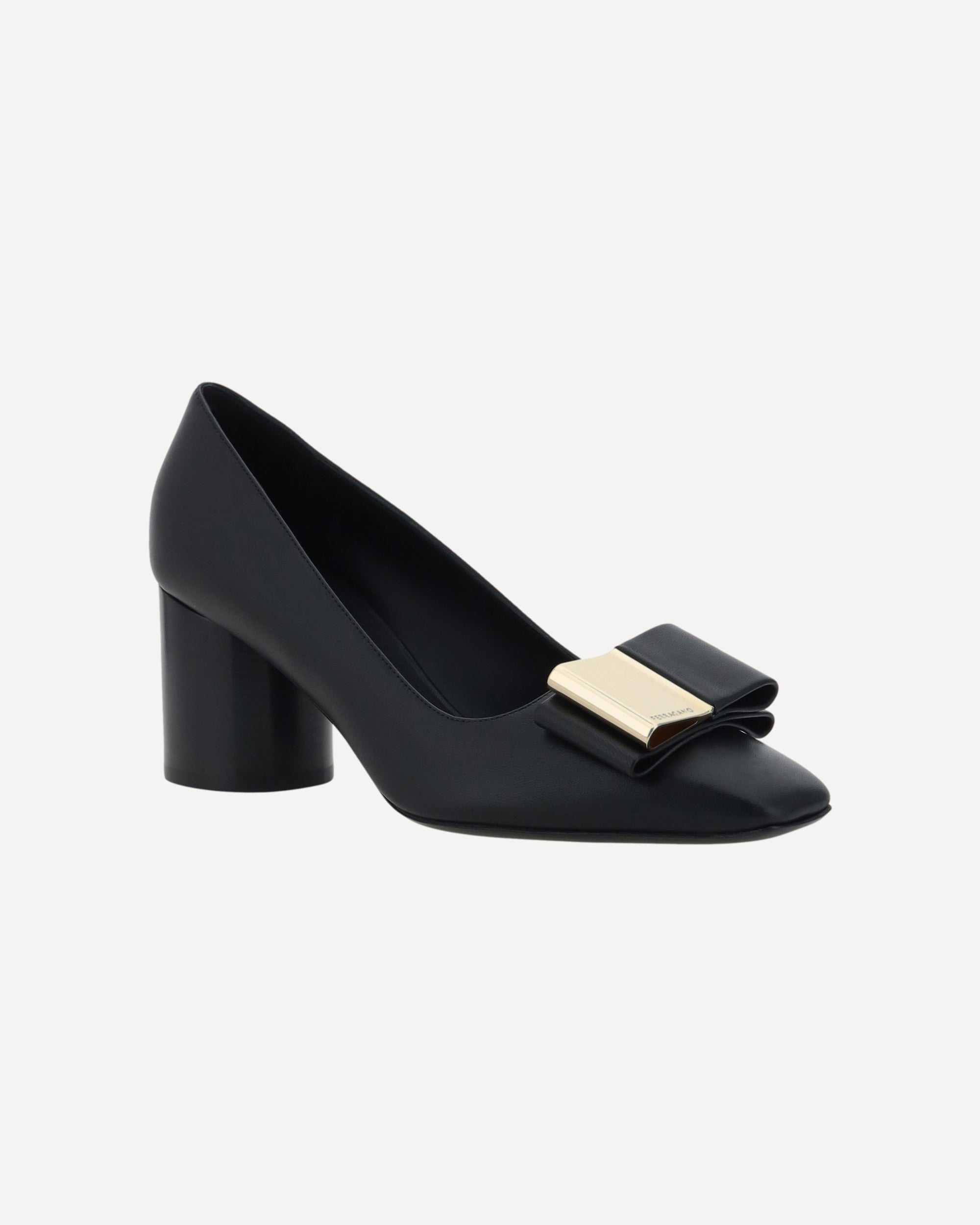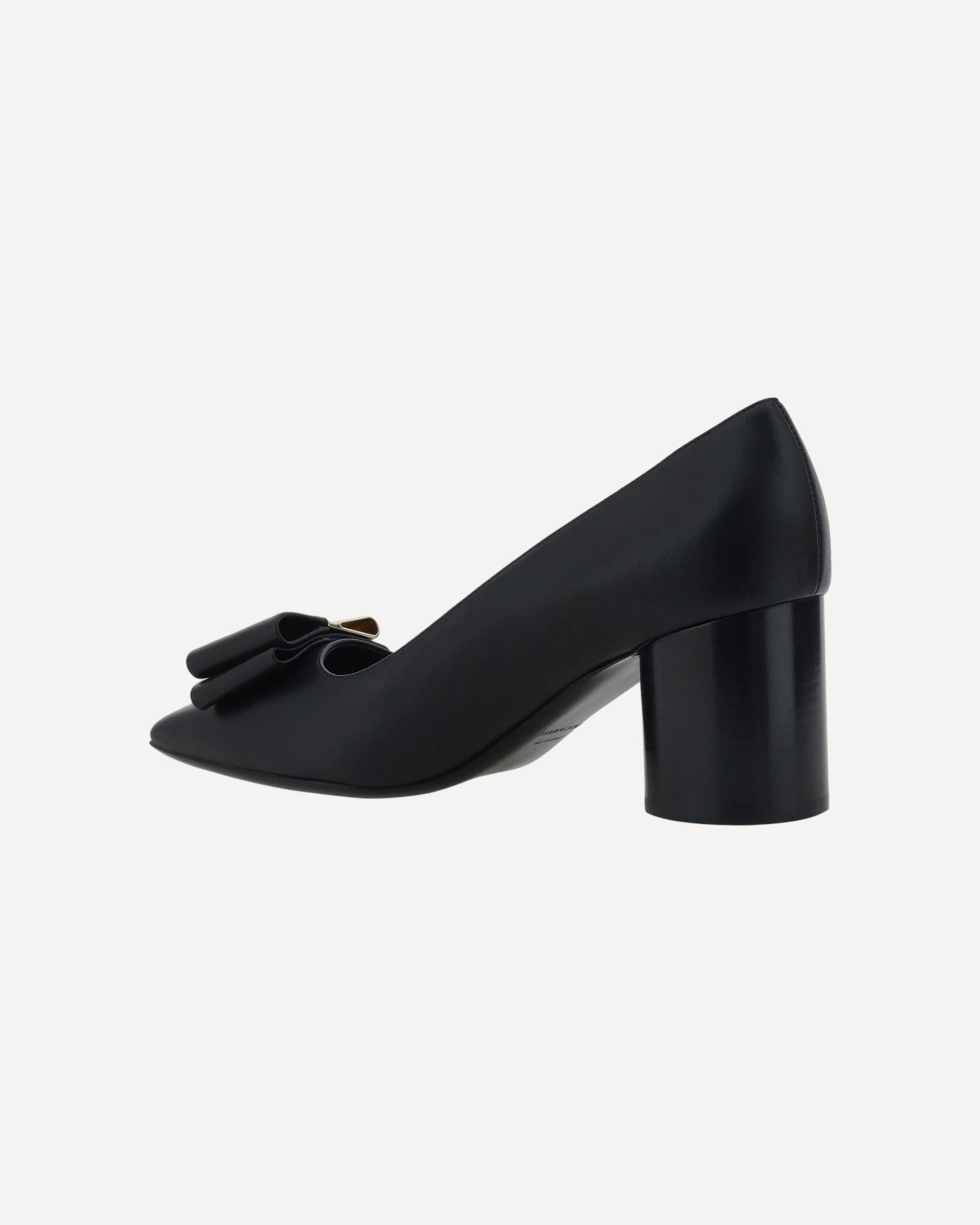 Leather Pumps by Ferragamo, geometric toe, cylindrical leather heel, applique bow detail on front, press-stamped logo insole.