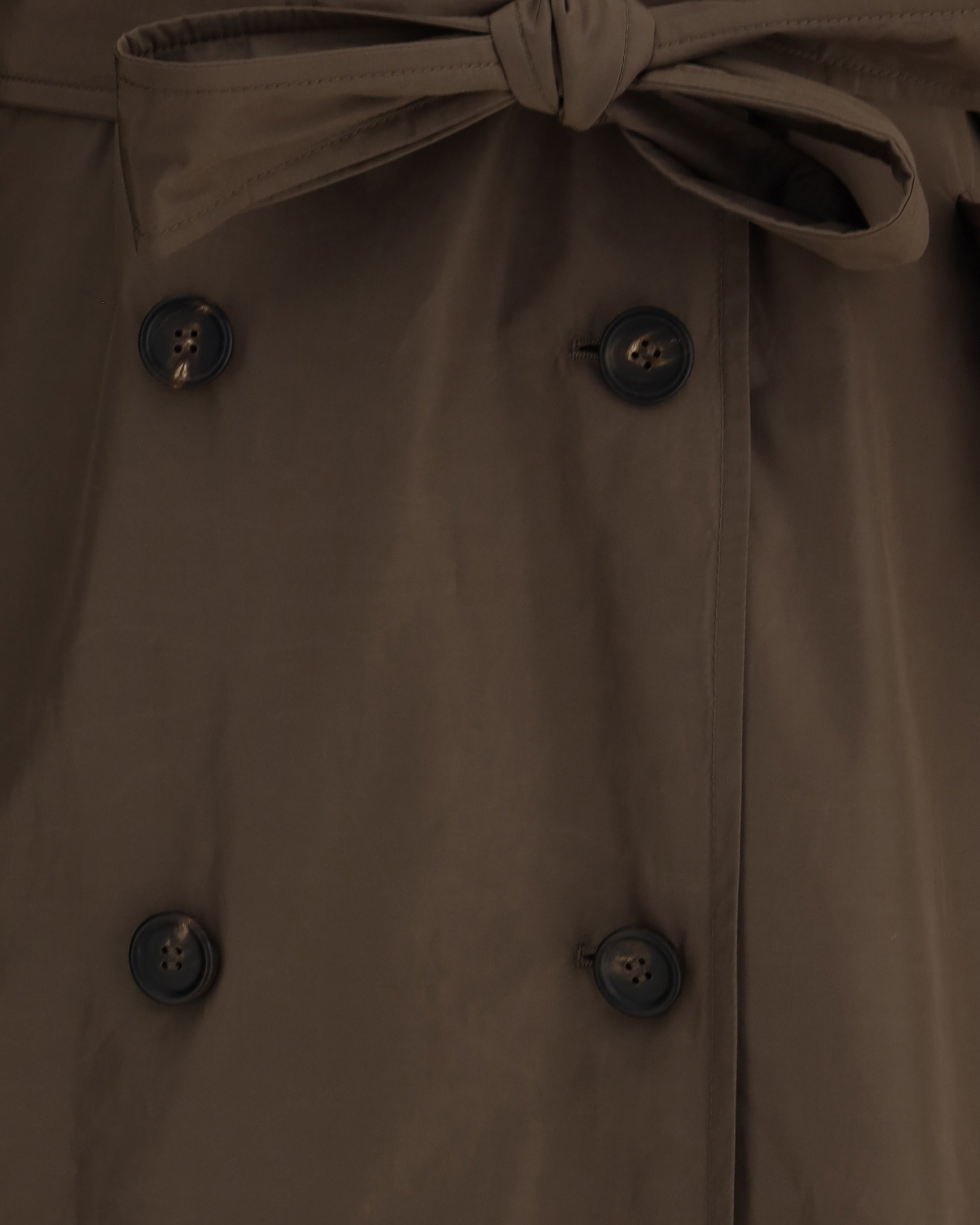 The Trench Coat with Monili decoration by Brunello Cucinelli is a sophisticated and sophisticated garment, offered in a refined chocolate hue. Made in a double-breasted model with button closure and waist belt, it is embellished with the iconic Monili beaded decoration that adds light and character. Completing the design are two side flap pockets and a unlined construction, enhancing its lightness and natural elegance.