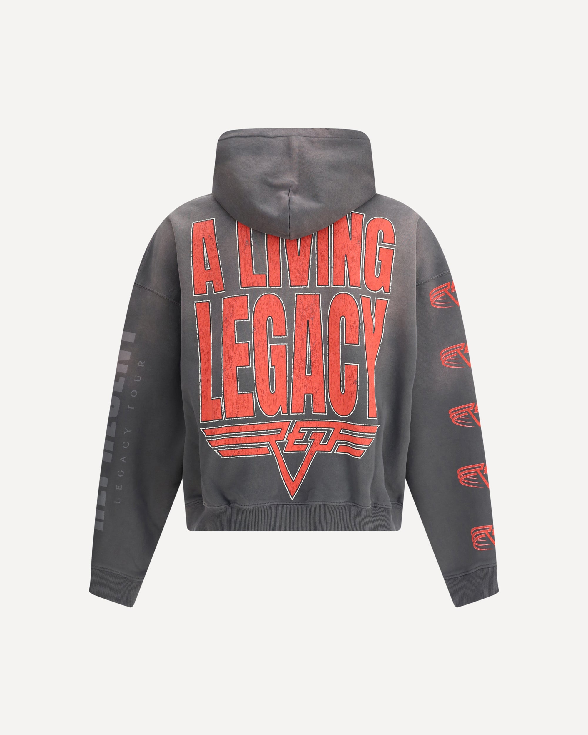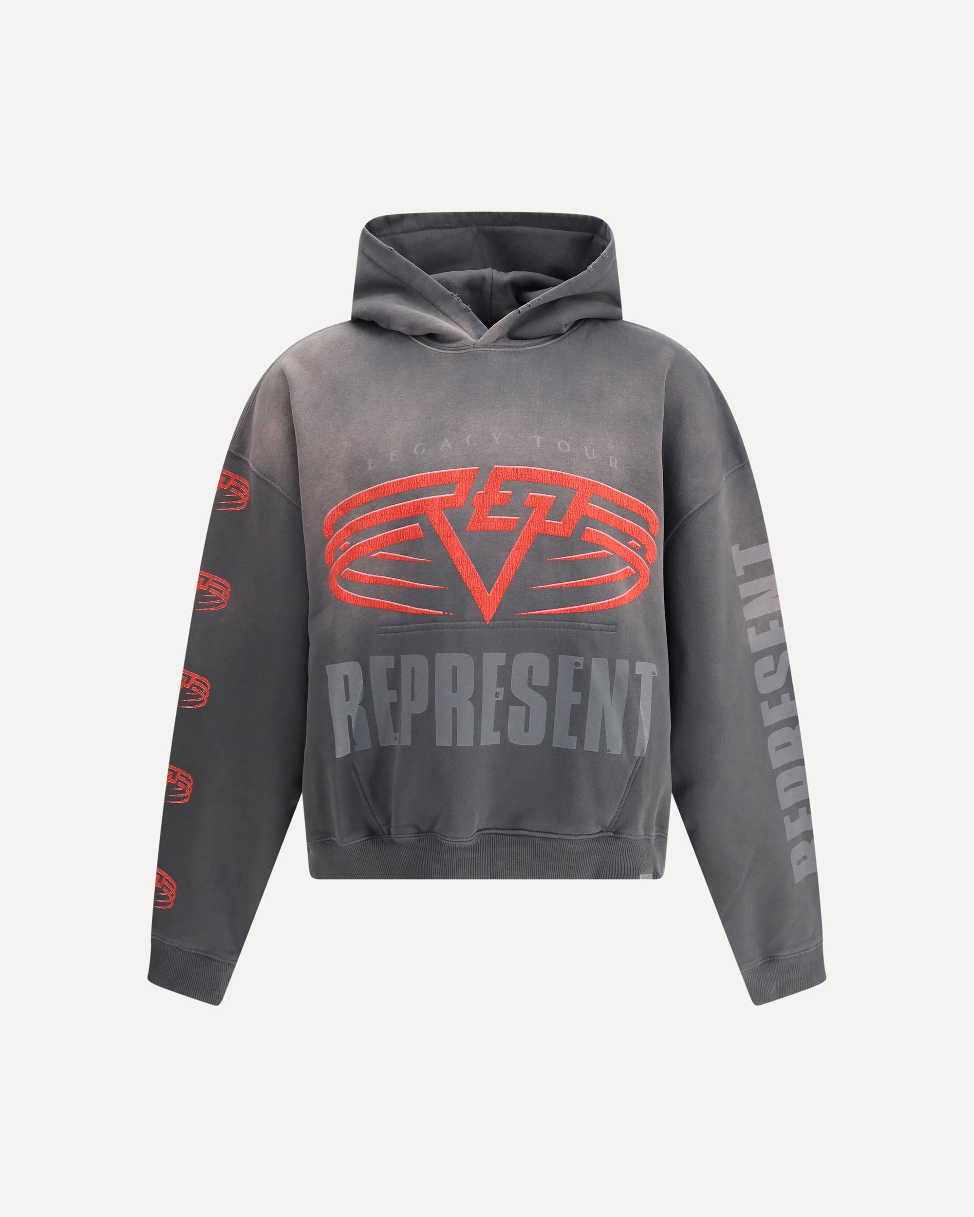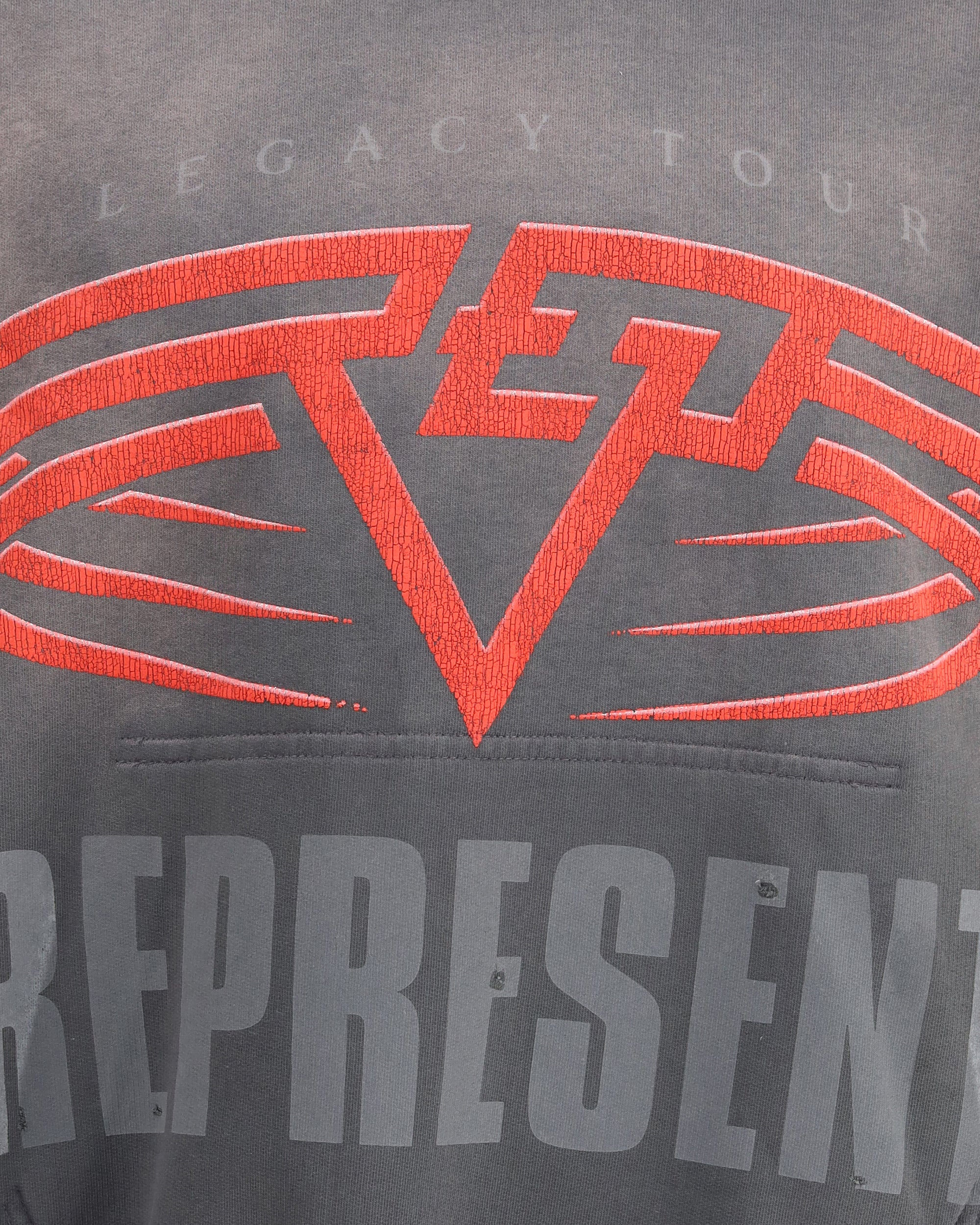 The "Living Legacy Tour" Hoodie by Represent embodies an urban spirit with a bold, contemporary edge. Crafted from a smoky grey cotton blend, it features distressed details and large contrasting logo prints across the front, back, and sleeves. Designed with raglan shoulders and a relaxed fit, it offers both comfort and ease of movement, while the brushed fleece interior provides a soft, cozy feel. Finished with a mini metal logo plaque at the hem, this hoodie merges streetwear attitude with refined, statement-making style.