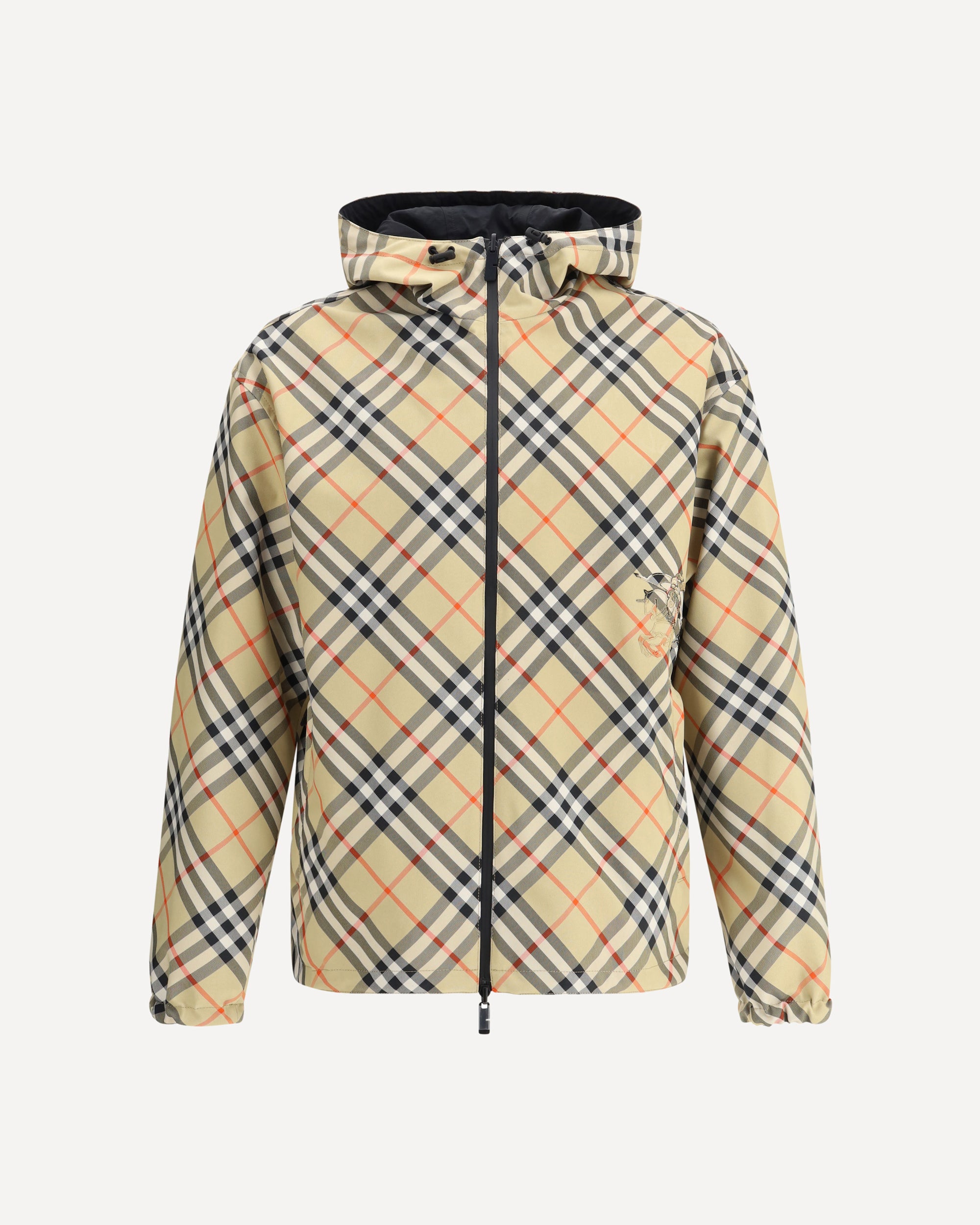 Burberry's reversible Waterproof Jacket is a versatile and functional garment perfect for any occasion. Featuring an adjustable drawstring hood and a front zipper closure, it offers practicality and protection. The two side welt pockets add useful space without compromising design. Reversible, it features the iconic Archivio Check pattern on one side and a monochrome look on the other to easily adapt to different styles and needs.