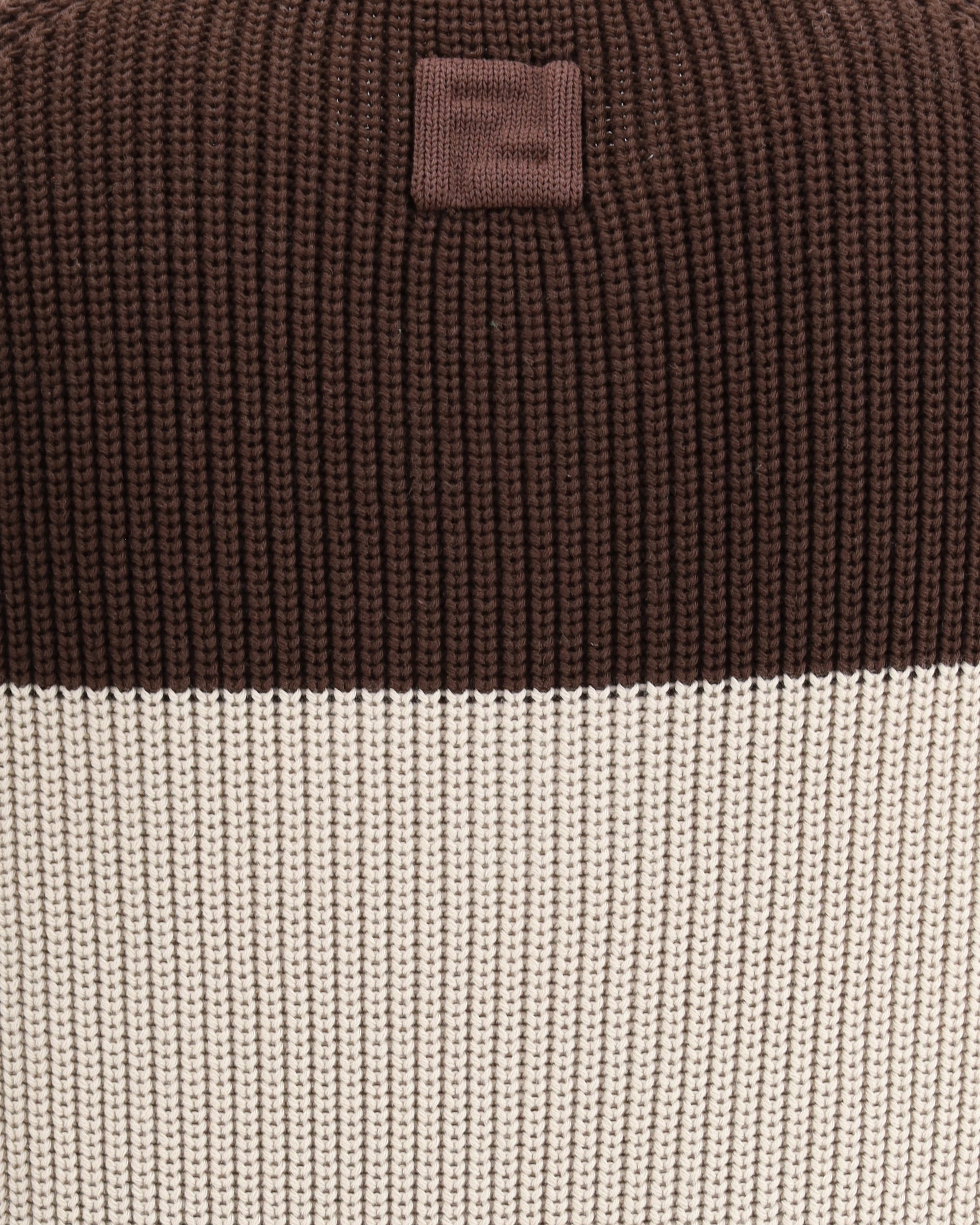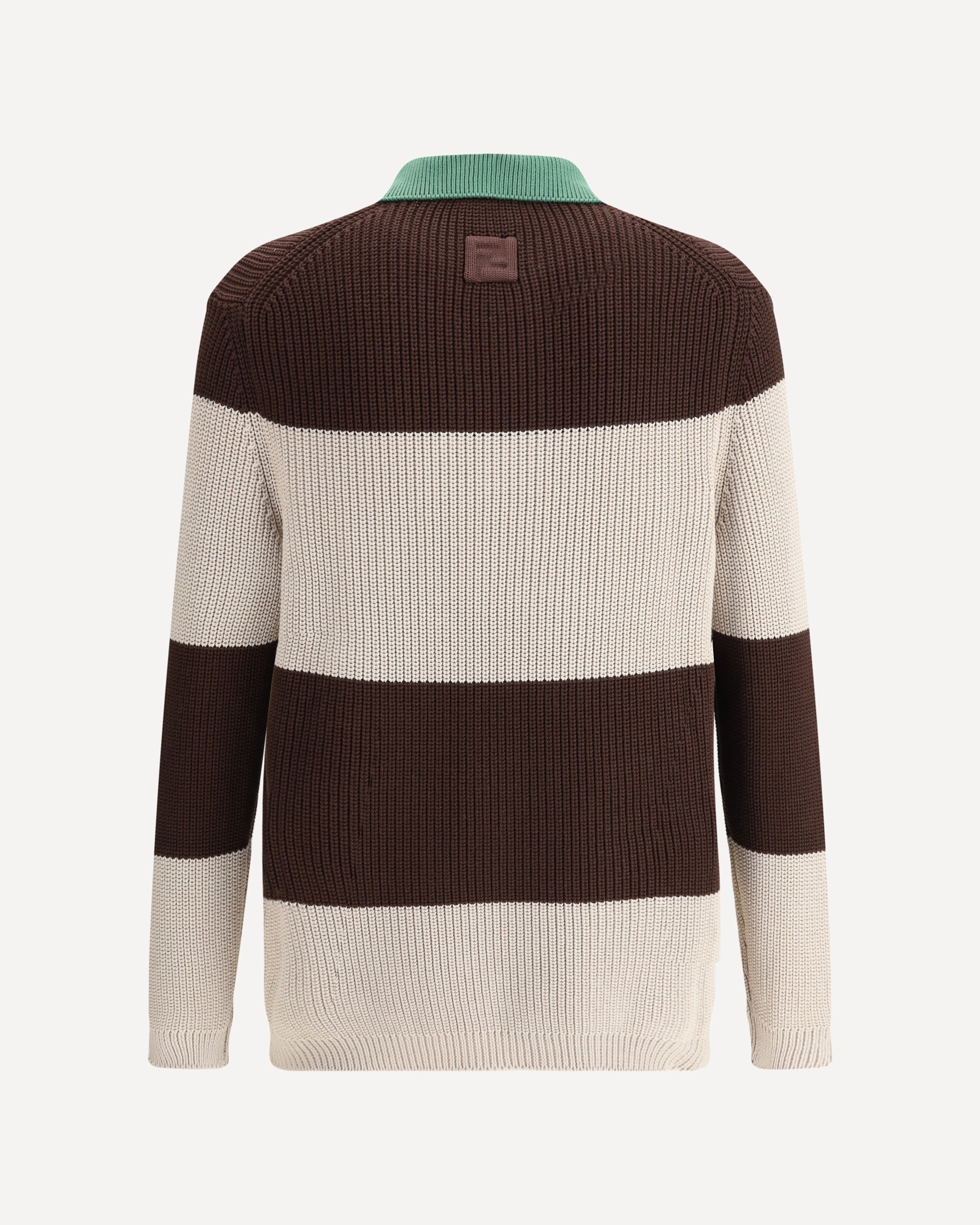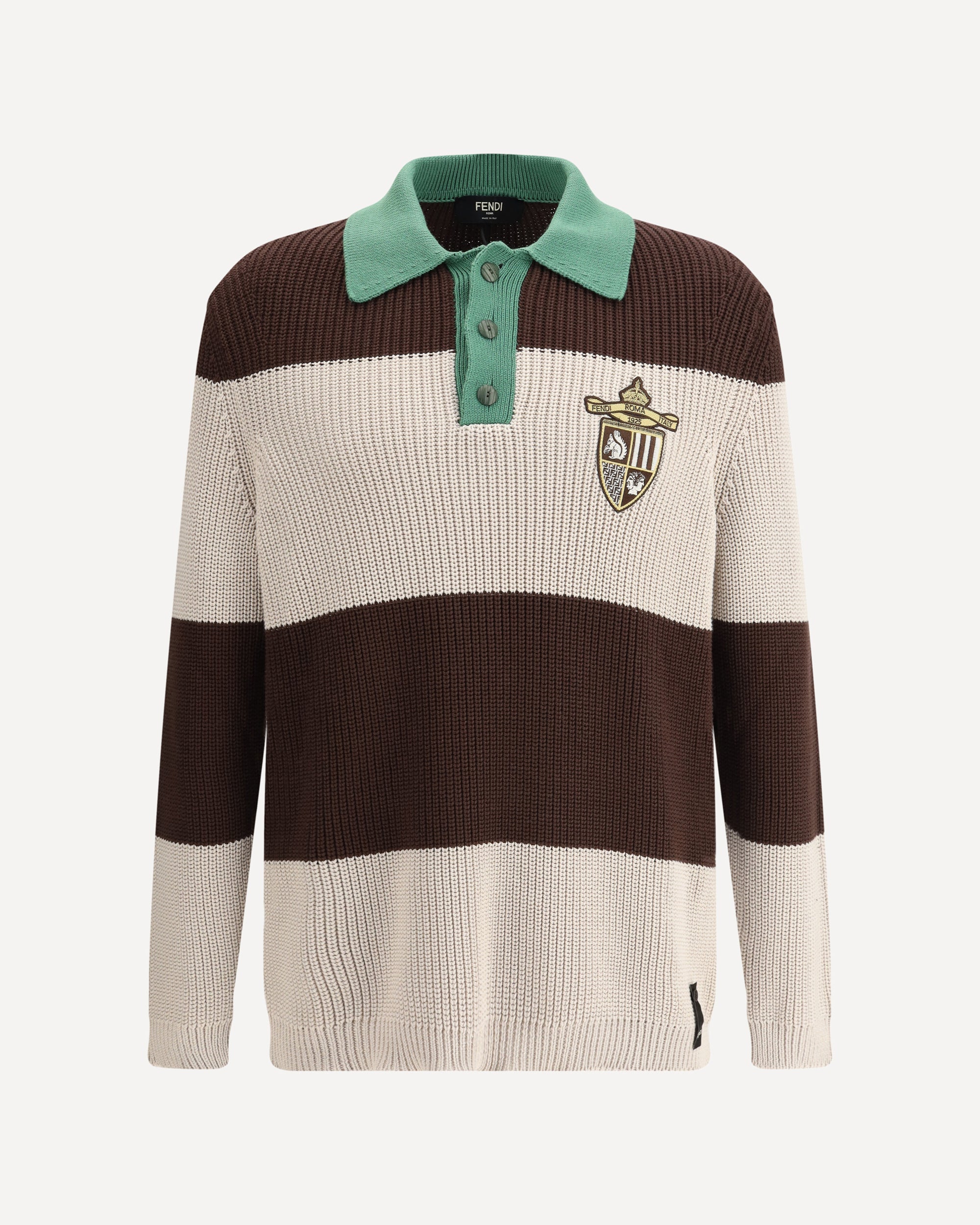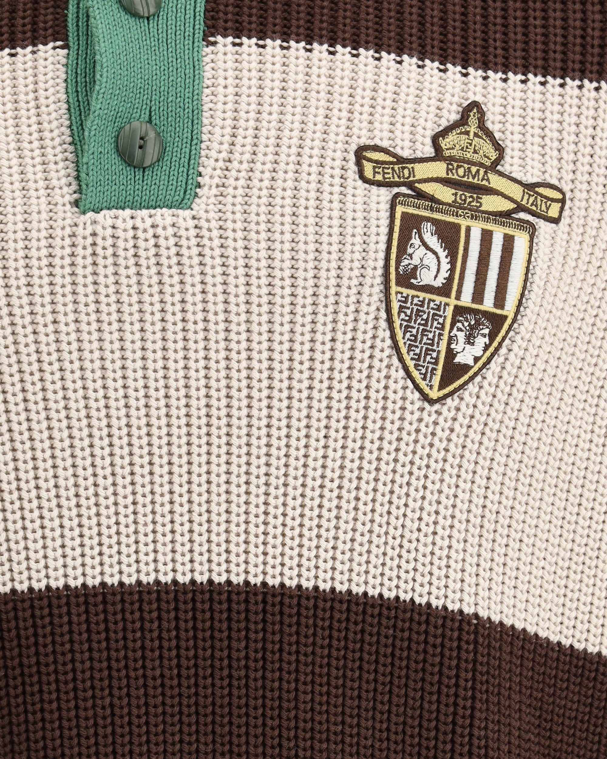 The Fendi cotton Ribbed Sweater is an elegant and modern piece, perfect for a refined and casual look. The classic contrasting collar adds a touch of sophistication, while the buttons on the front offer a functional and elegant detail. The ribbed cuffs and hem ensure a comfortable and snug fit, while the two-tone horizontal striped pattern gives a dynamic and stylish look. The iconic monogram patch applied on the front adds a distinctive touch of the brand, making this sweater easily recognizable. A versatile and refined piece that combines comfort and luxury in a single garment.