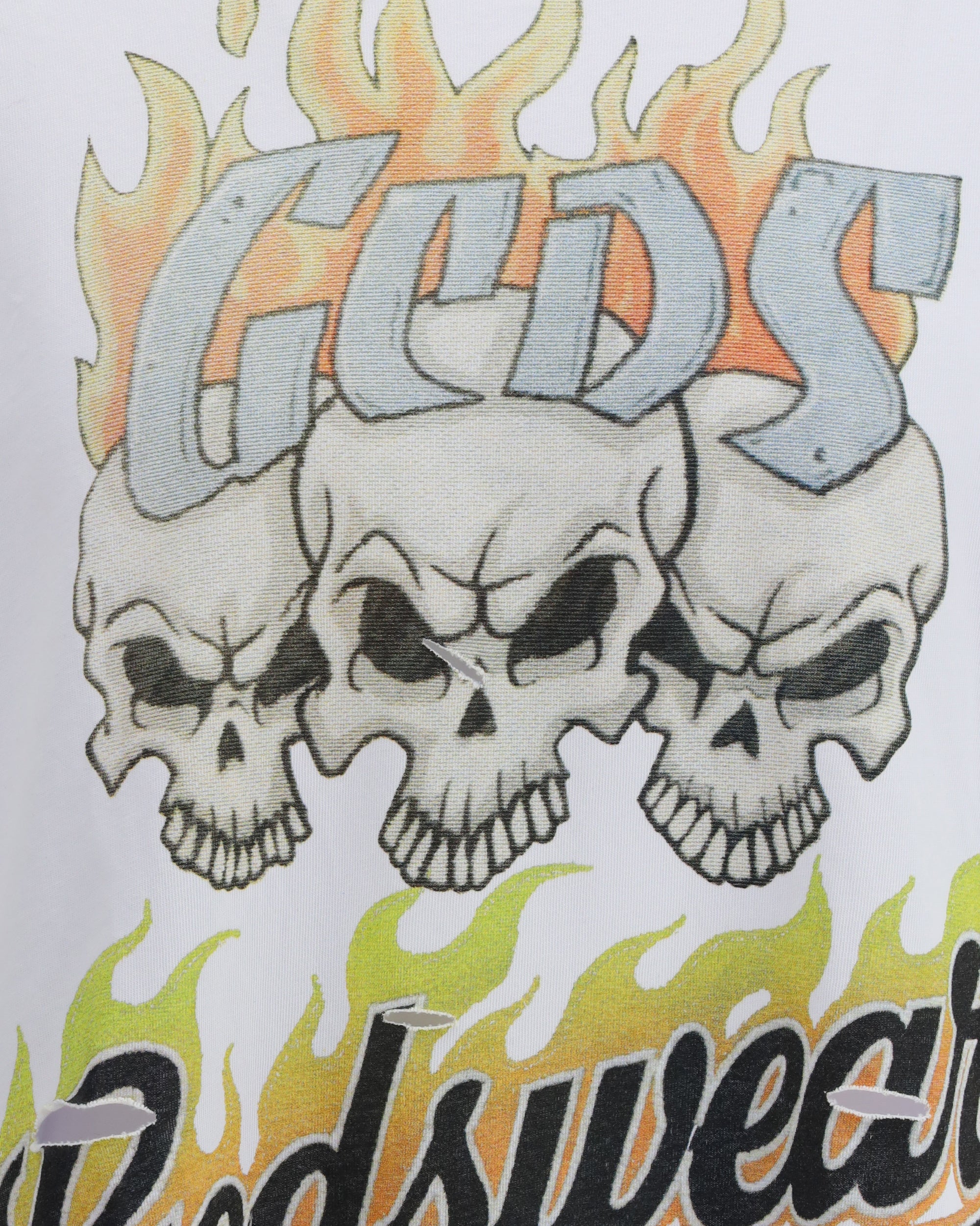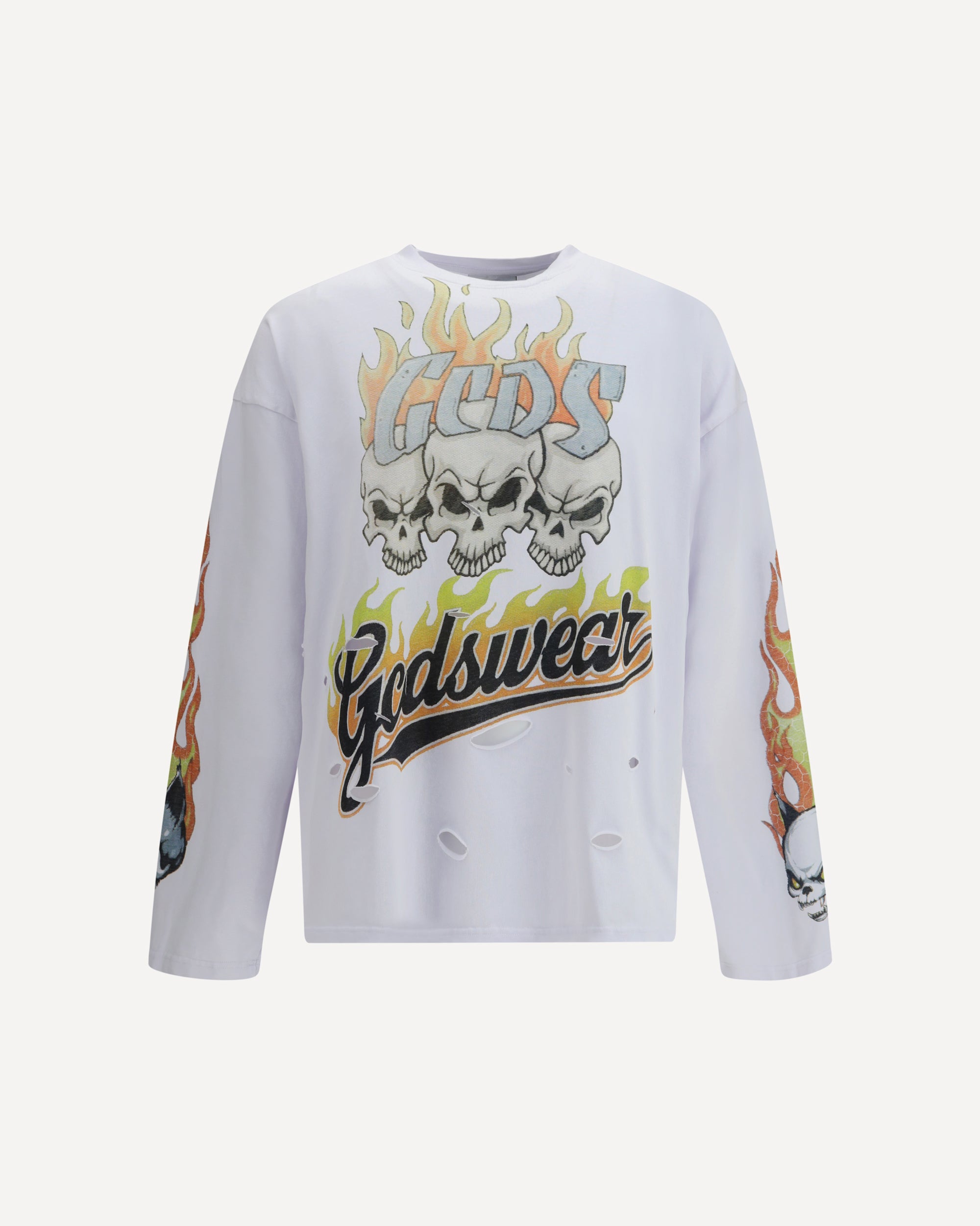 The Riders print long-sleeve T-shirt by GCDS is crafted from cotton and features a front print with a worn-effect finish, enhanced by skull and flame graphics extending across the sleeves. The GCDSWEAR logo is integrated into the front composition, reinforcing the bold identity of the design. Finished with a ribbed crew neck and regular fit, this GCDS T-shirt combines striking street attitude with a strong contemporary edge.