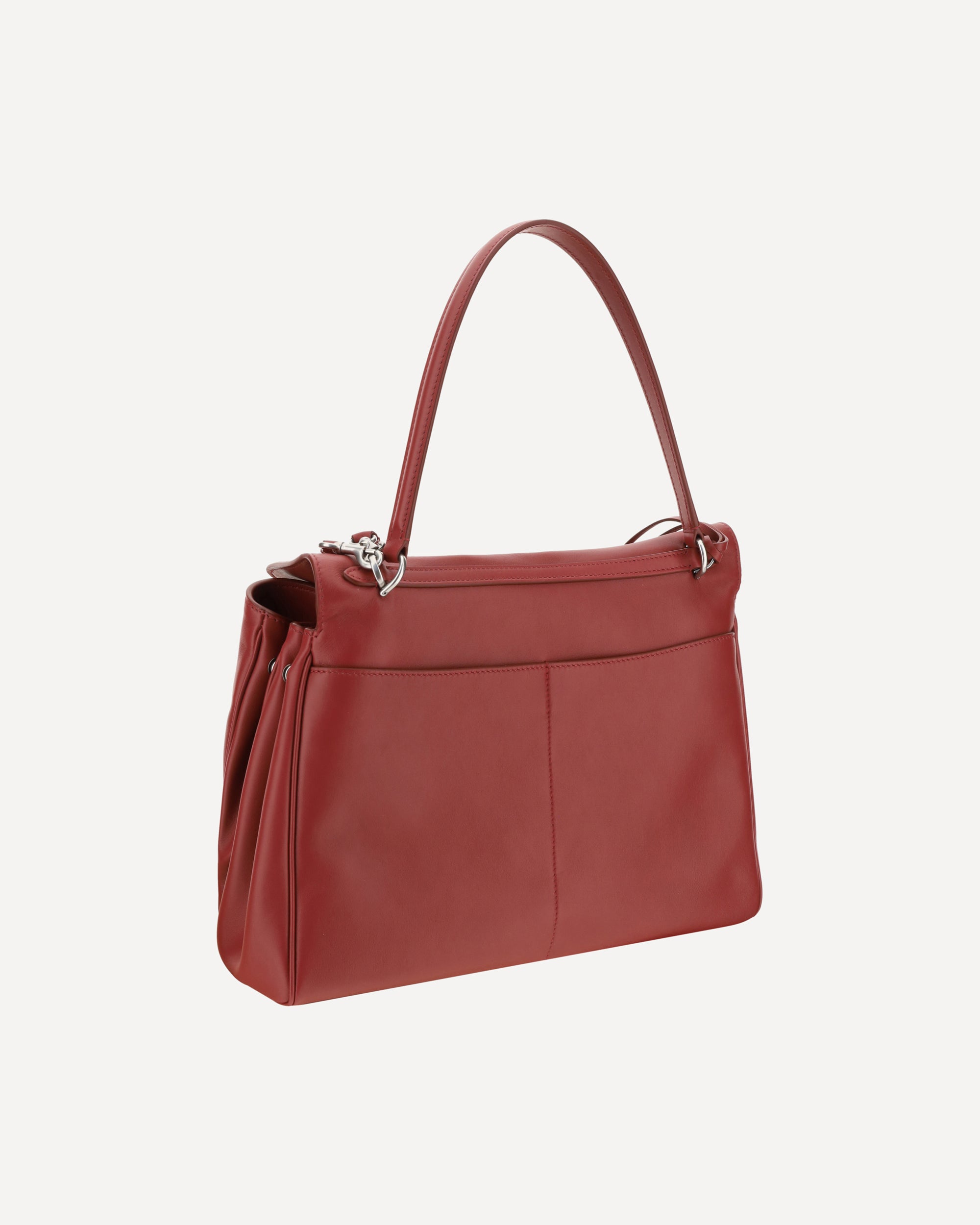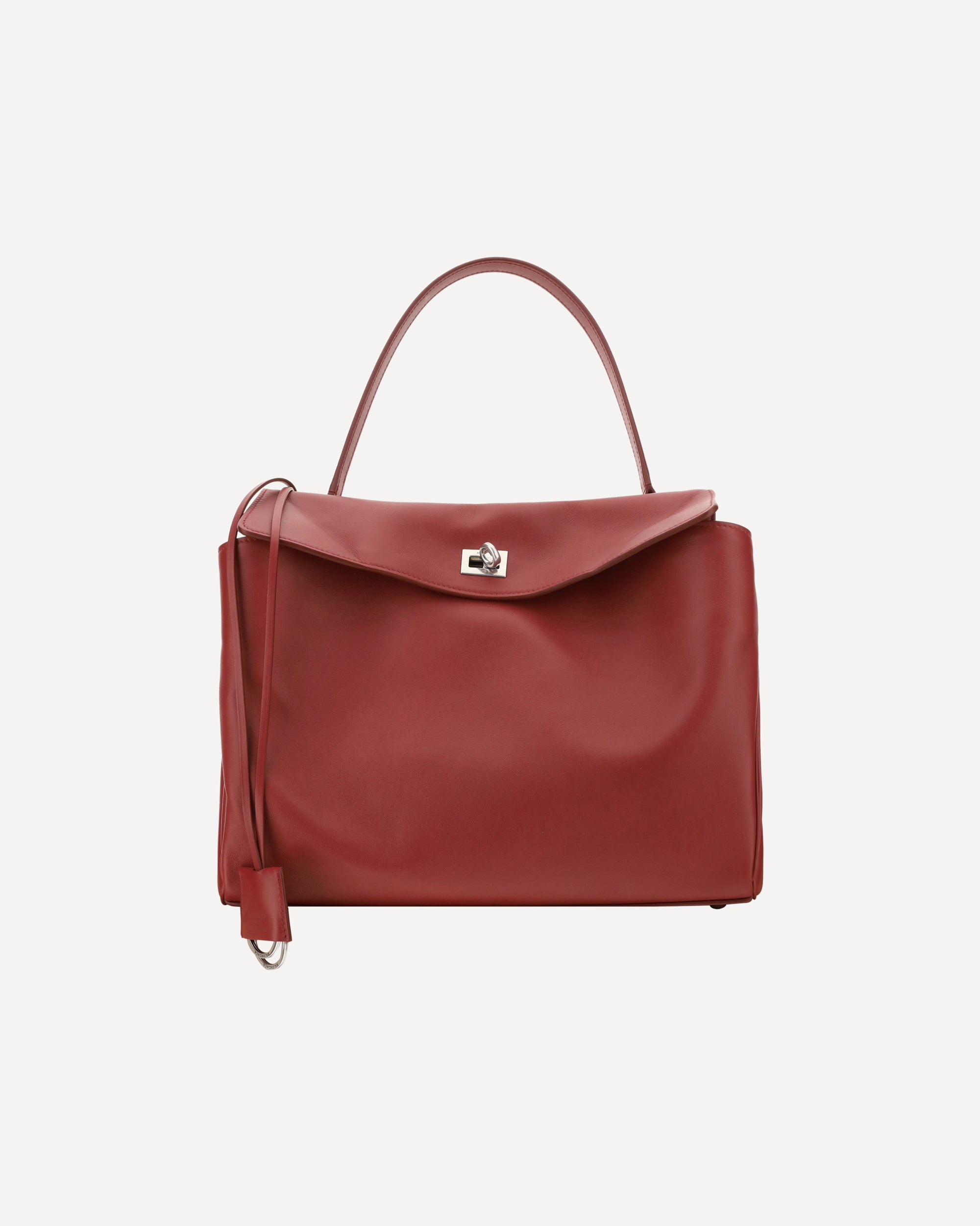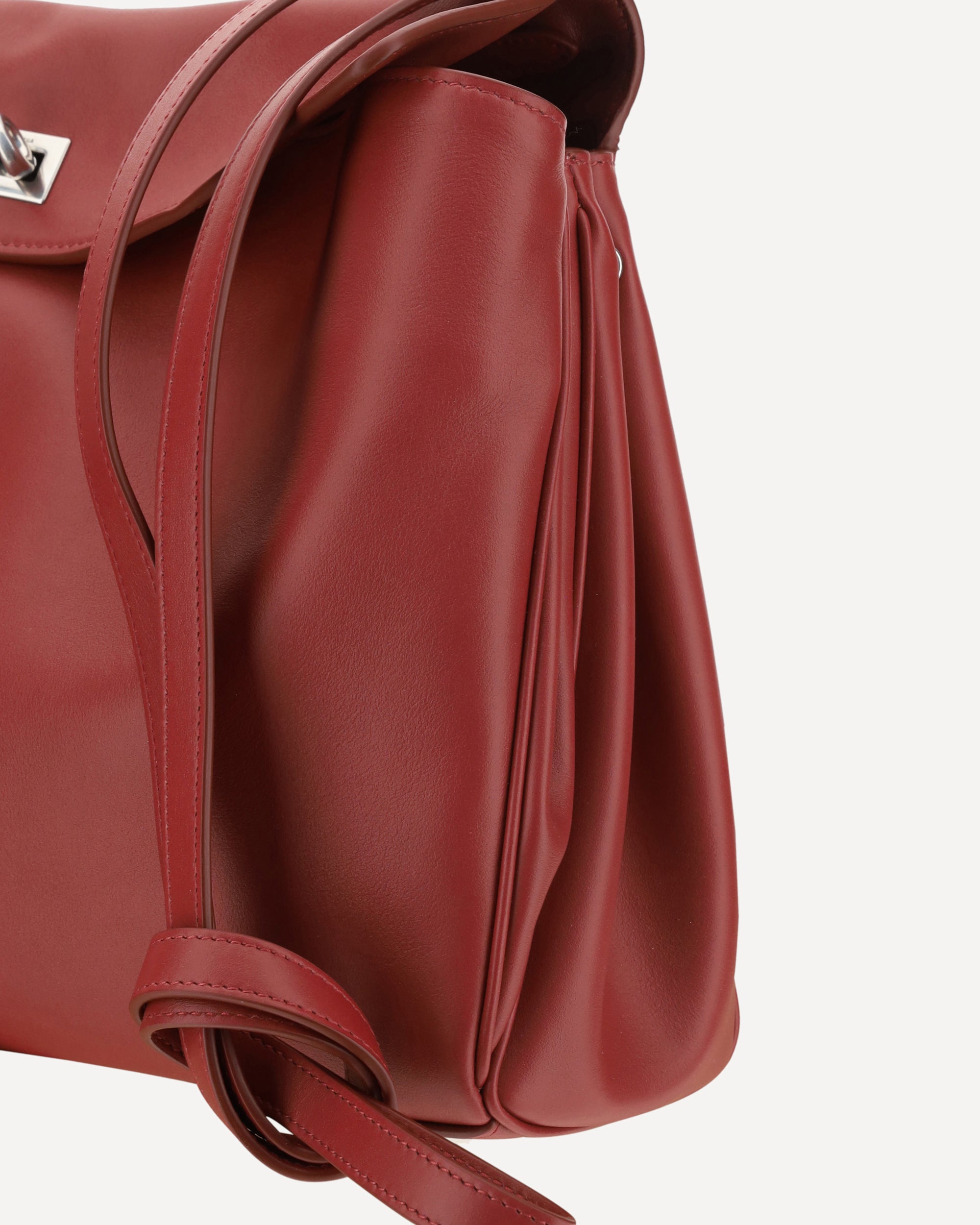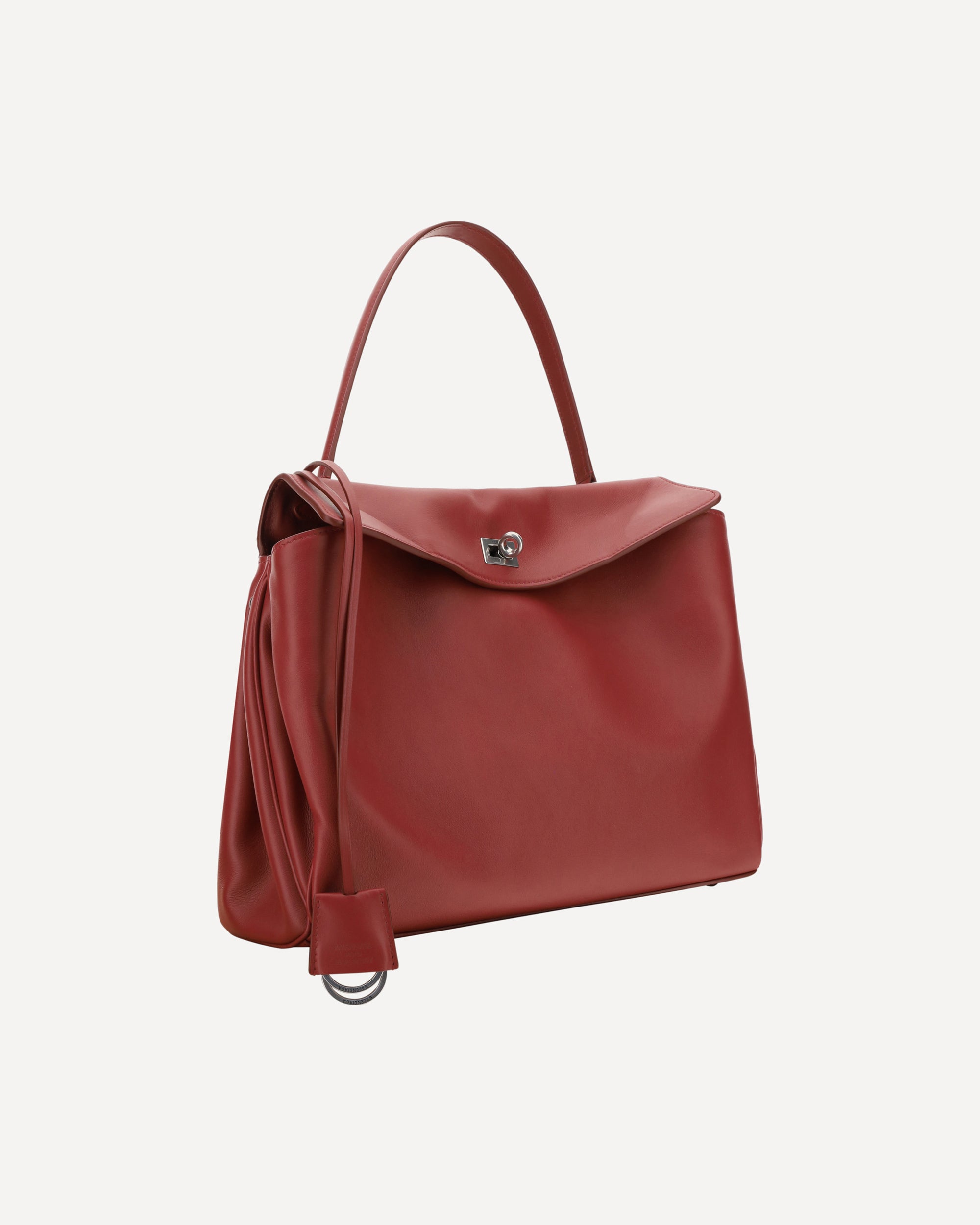 Balenciaga's Rodeo Leather Shoulder Bag features a top handle for a comfortable and stylish grip. The front closure features a flap and swivel, adding a distinctive and functional detail. Applied keychain detail on the top handle. The removable shoulder strap is attached by snap hooks, allowing it to be carried either on the shoulder or by hand. Inside, the bag offers single interior compartment, ideal for organizing essentials. In addition, there are metal feet at the base of the bag to protect it and keep it in place.