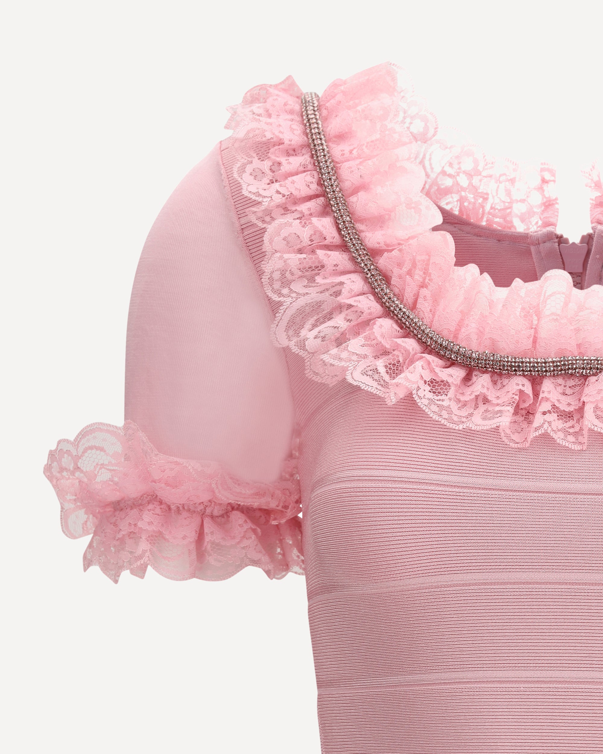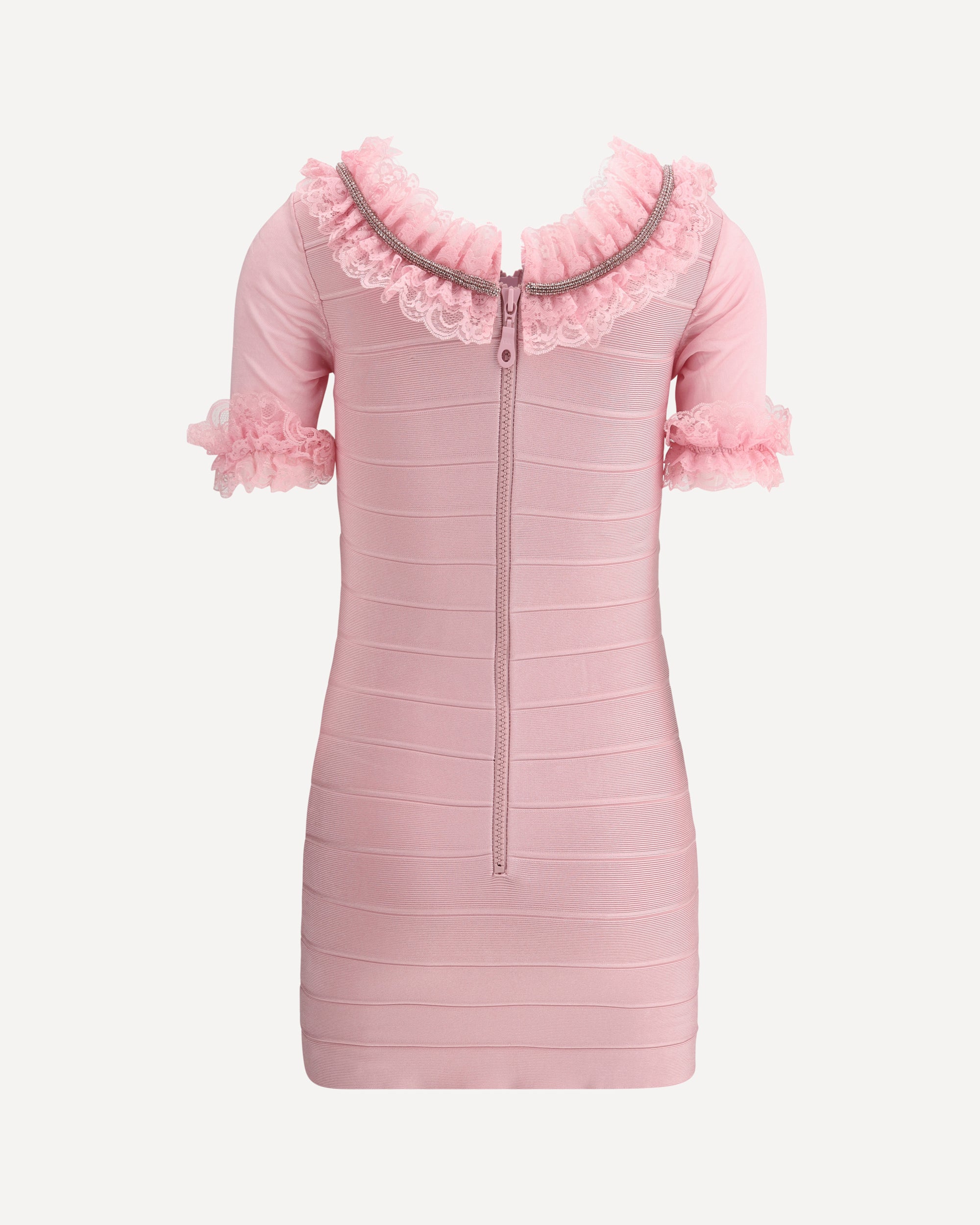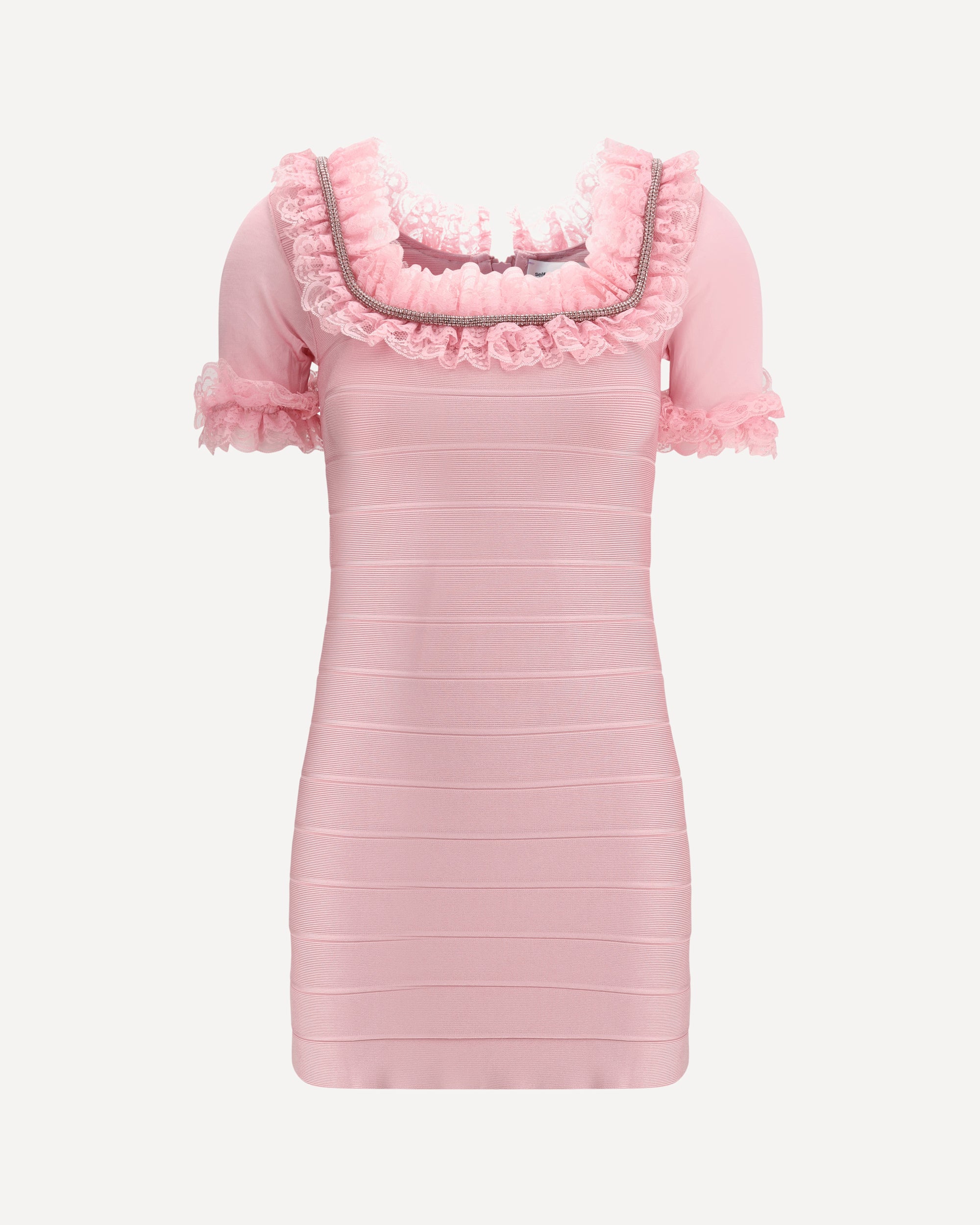 The Ruffle Knit Mini Dress from Self-Portrait is an elegant and feminine piece, featuring a short-sleeved design that ensures coolness and comfort. The square neckline is embellished with lace and rhinestone details, adding a touch of glamour and sophistication. The back zipper ensures a perfect fit, while the lace detail on the sleeves provides an additional delicate accent. The striped design creates a modern and dynamic silhouette, making this dress ideal for special occasions or evening events.