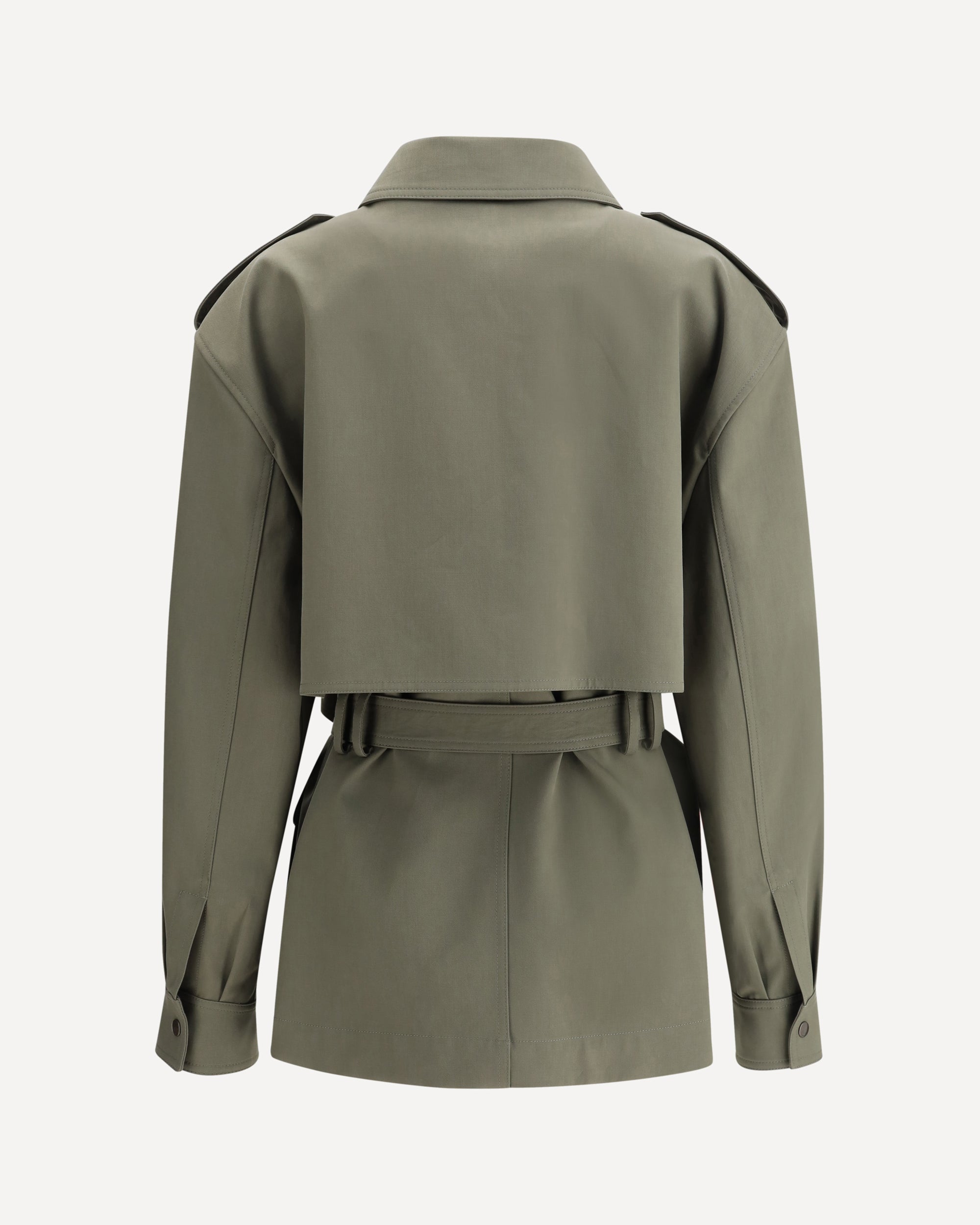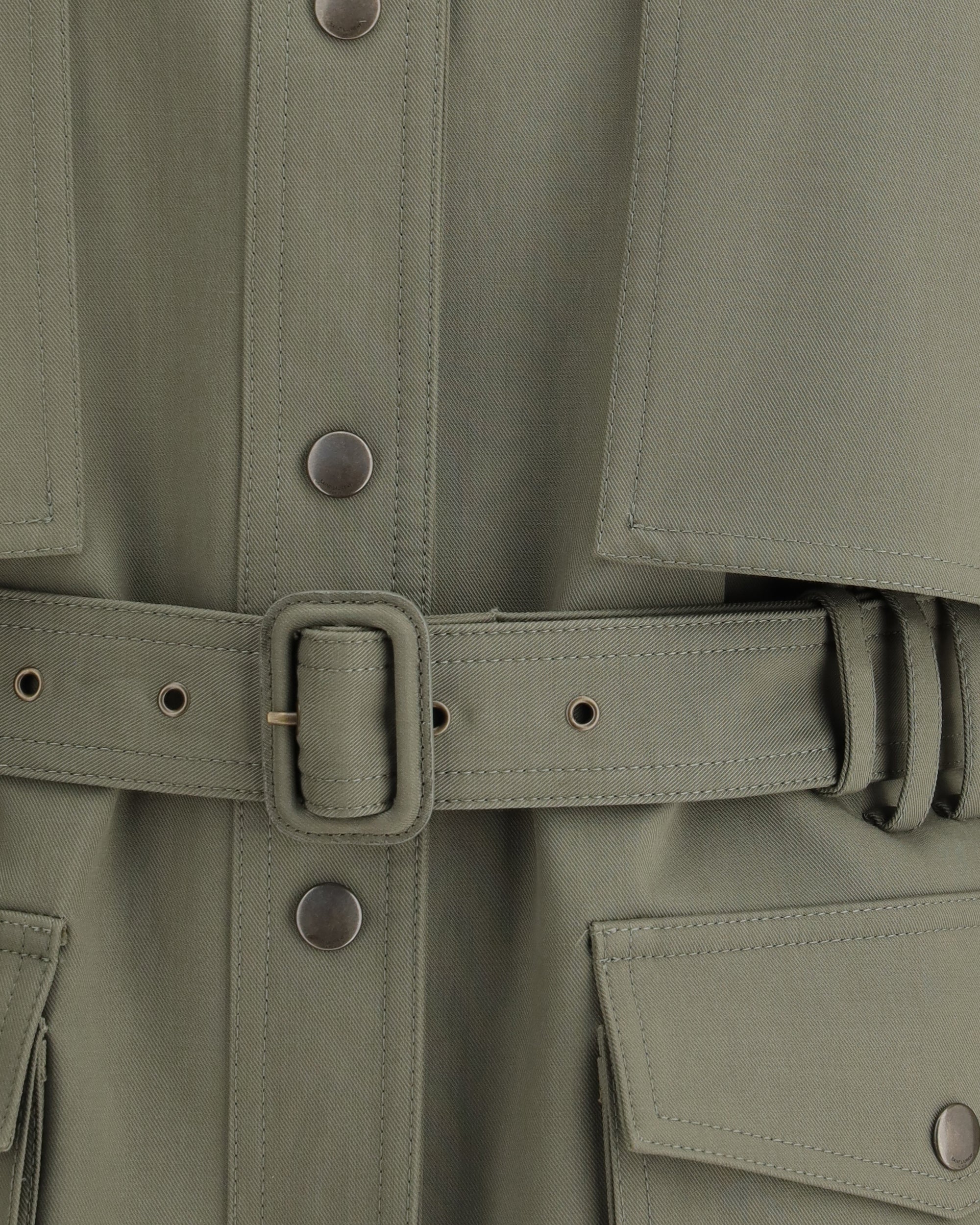 The Saharienne Jacket by Saint Laurent is a versatile and sophisticated piece, perfect for an elegant and practical look. The classic collar and the front closure with snap buttons offer a clean and structured design, while the two patch pockets on the front with flap and buttons add a functional and stylish touch. The belt loops on the waist, together with the adjustable and removable matching belt, allow you to customize the fit, emphasizing the silhouette. An iconic and timeless piece, which combines comfort and class in a perfect way.