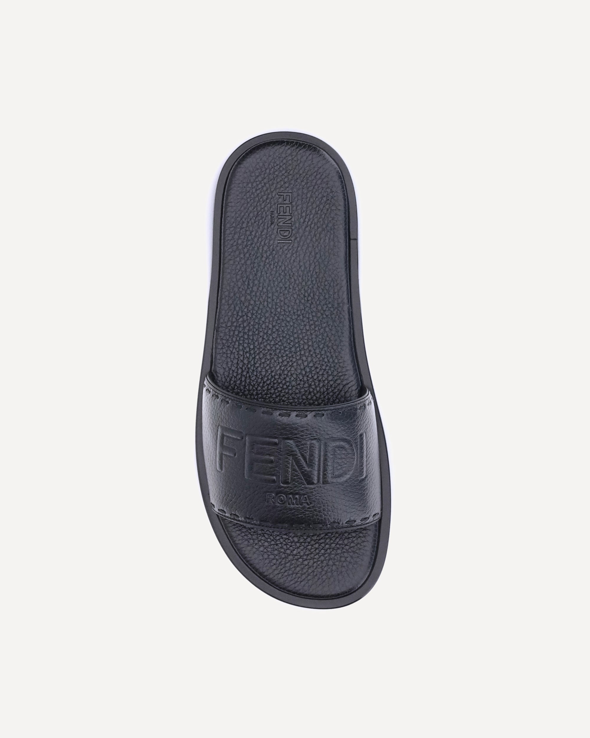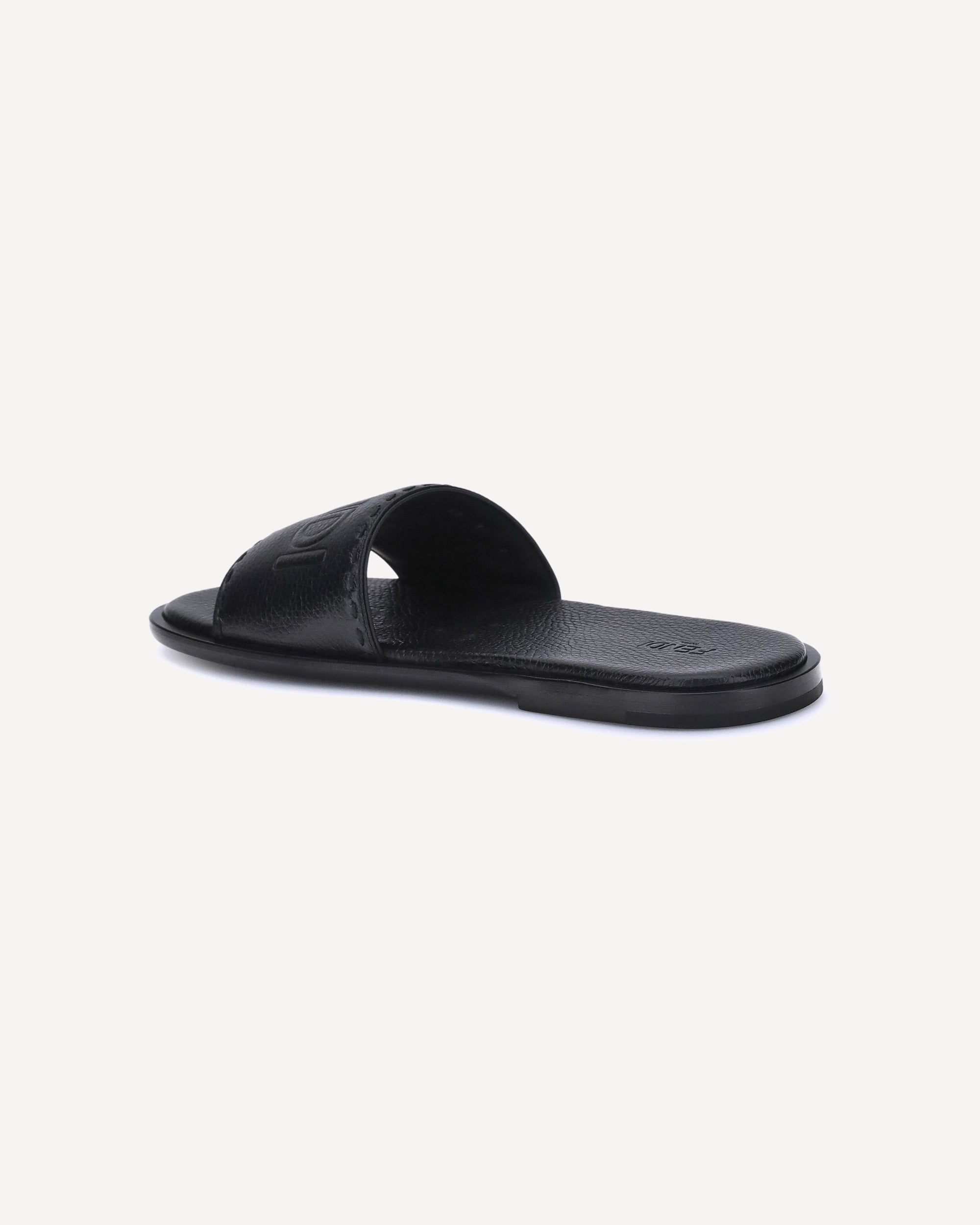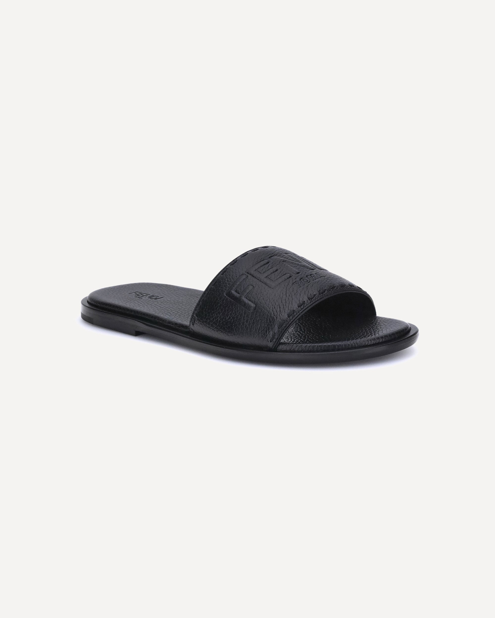Fendi Sandals stand out for their essential design and high craftsmanship. Featuring a high band, they are made of black grained leather and finished with hand-made tone-on-tone Selleria macro stitching, which compose the iconic Fendi writing. The thin leather sole and the slightly padded insole ensure comfort and refinement.